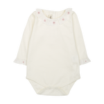 Our exquisite long-sleeved bodysuit is crafted from the finest 100% Pima cotton, renowned for its superior softness and durability. Featuring an elegant ruffle collar and cuffs, this piece is finished with charming hand-embroidered daisy flowers for a timeless, artisanal touch.