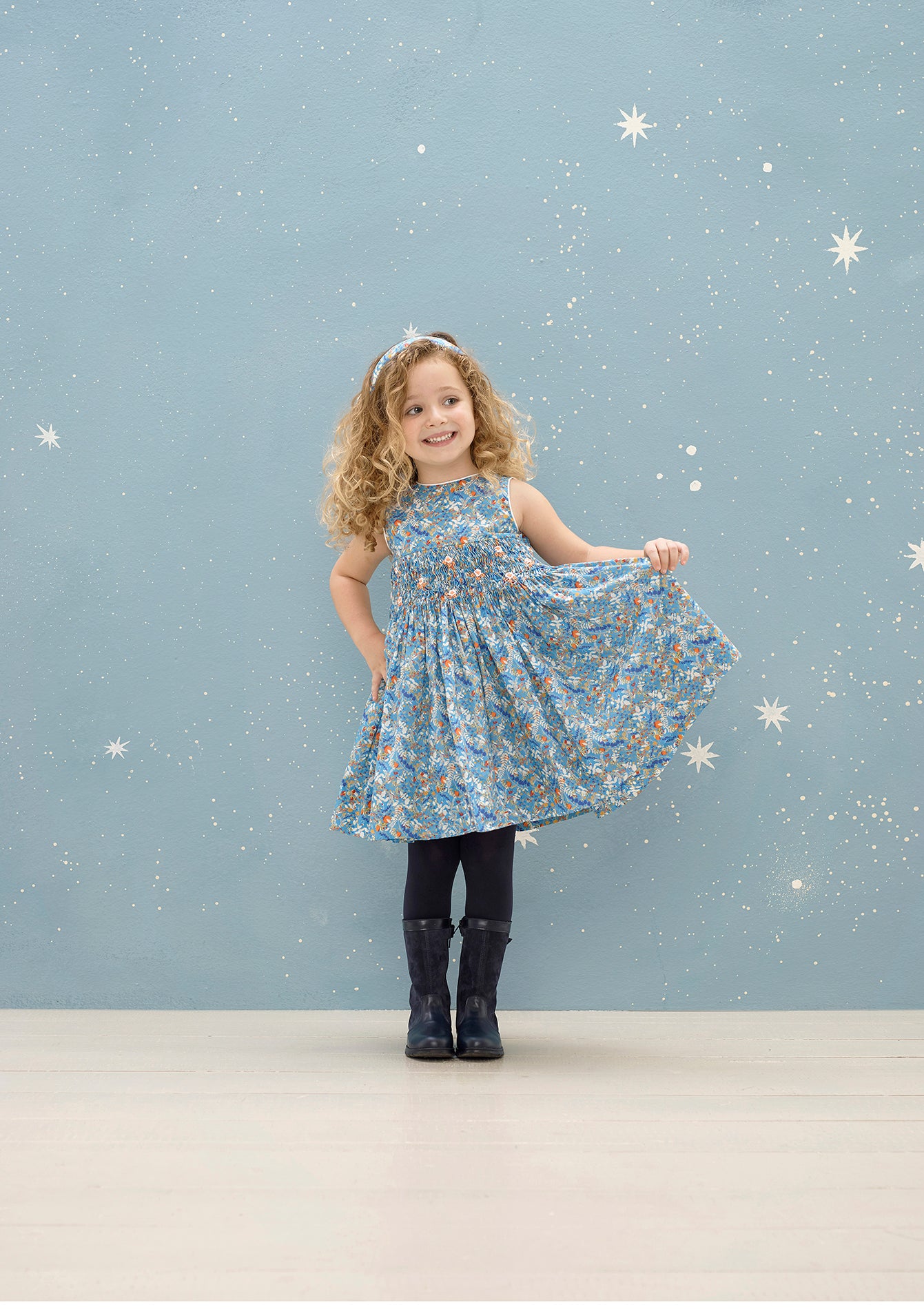 100%Cotton Dress - This elegant smocked dress is a classic piece, made with Liberty fabrics and decorated with a subtle bloomage of hand-embroidered flowers.