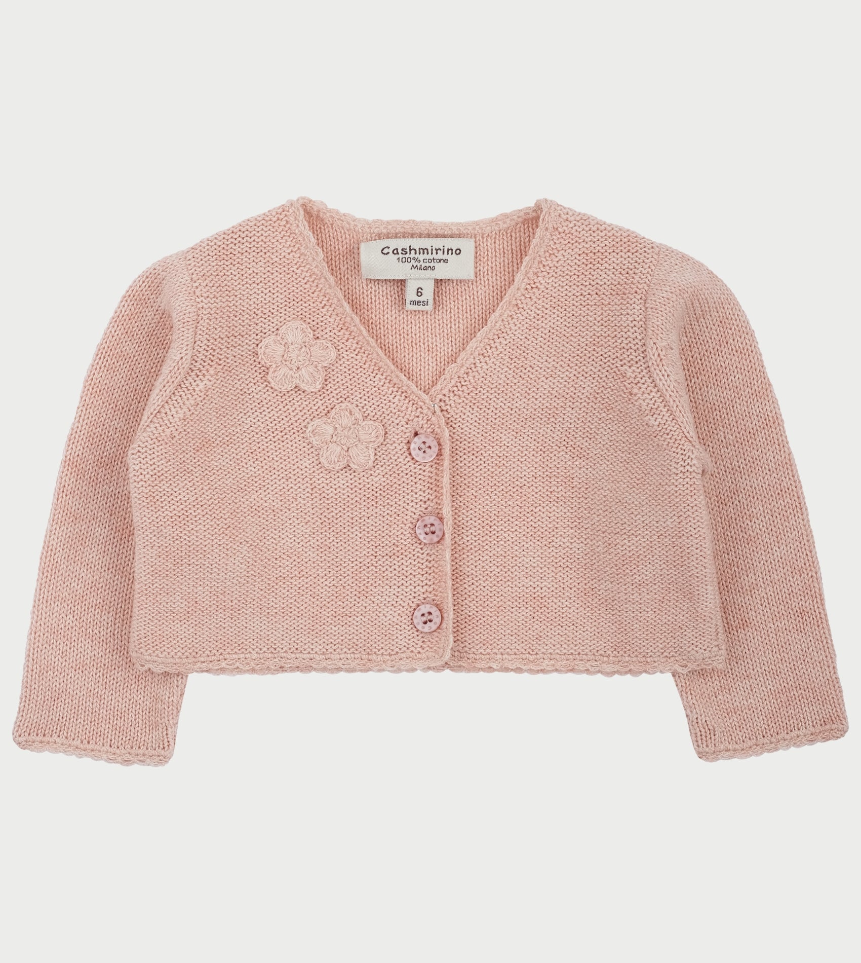 Add a delicate layer of warmth and charm with this lightweight baby girl shrug, crafted from the finest 100% Pima cotton for exceptional softness and comfort. Designed with a V-neckline and long sleeves, it’s ideal for wearing over a party dress or blouse. The appliqué flower detail adds a sweet, elegant touch, while the Cashmirino signature buttons complete the look with refined style.