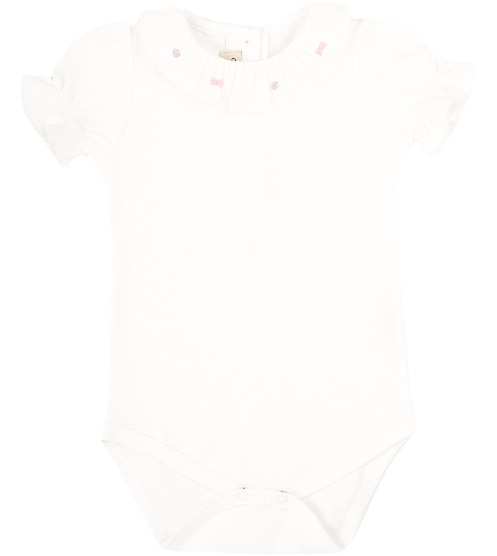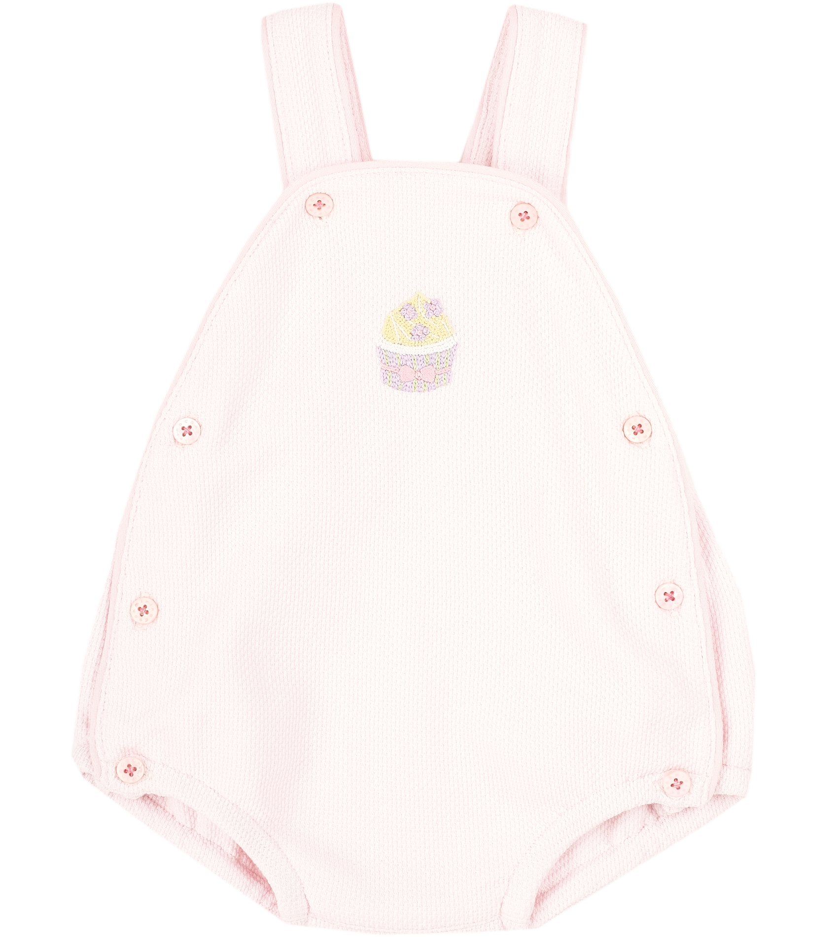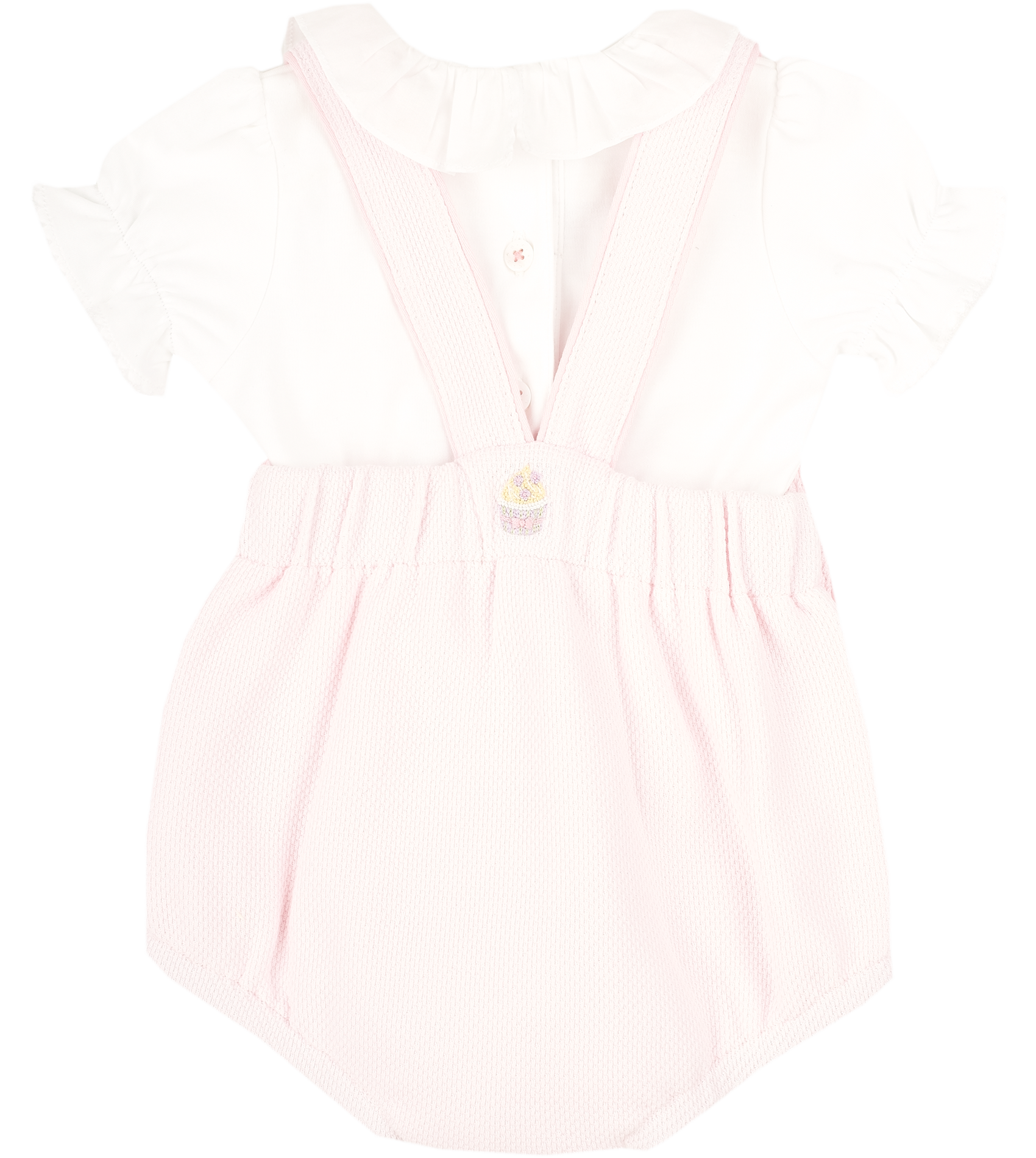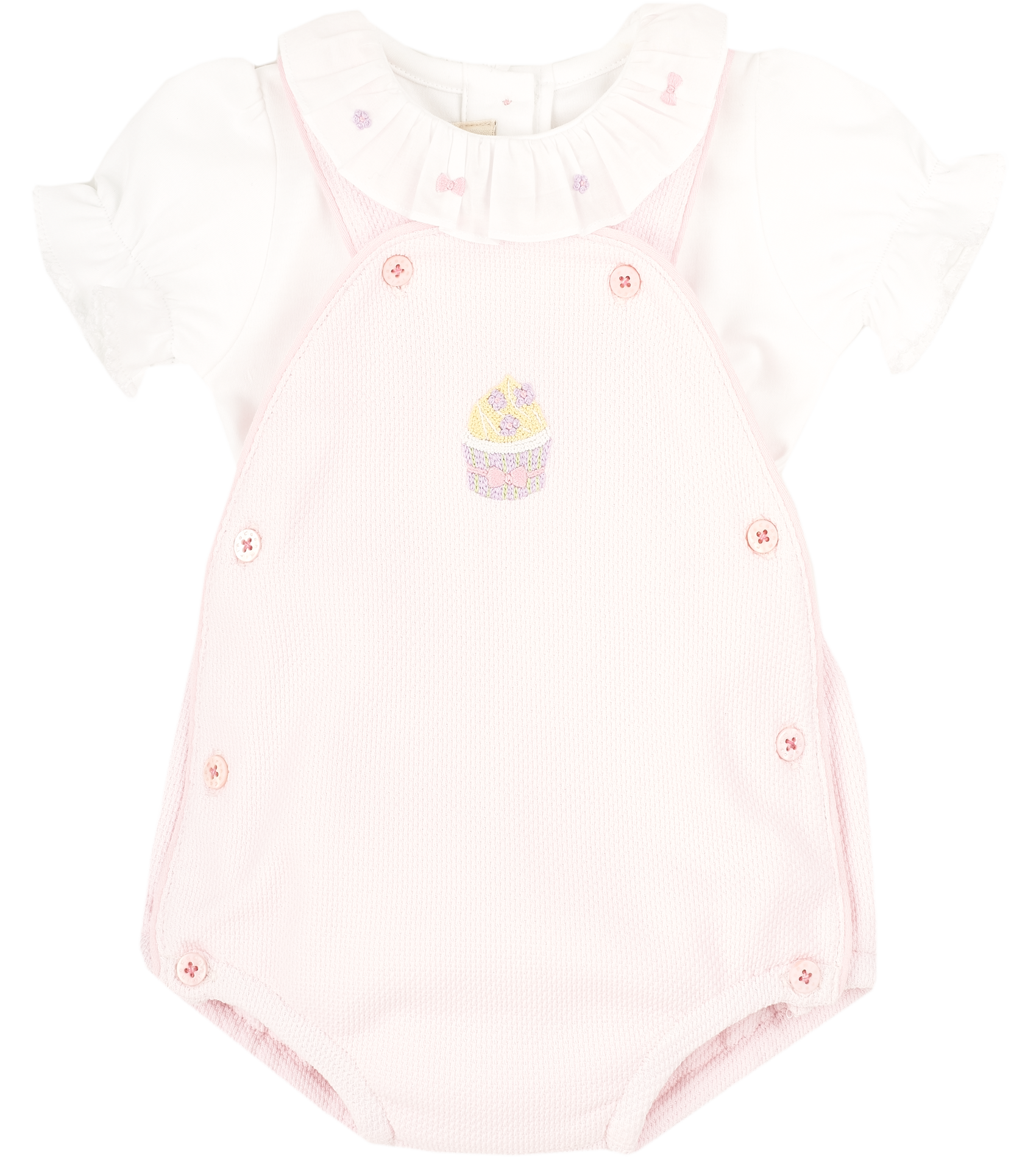 Every little girl deserves bows and cupcakes! Our sweet pima cotton set was designed with just this purpose in mind. Our bodysuit features expertly embroidered bows on a ruffled collar, with a matching pink dungaree showcasing a cupcake as sweet as your little one. This set is short sleeved, easy to wear with thoughtfully placed buttons on a bright warm day.