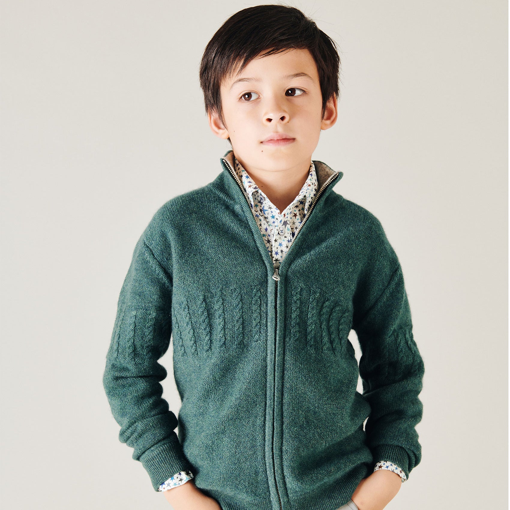 A classic 100% cashmere high neck boy cardigan with cable knit panels, long sleeves, a ribbed hem, and zip fastening. Ideal for all occasions.