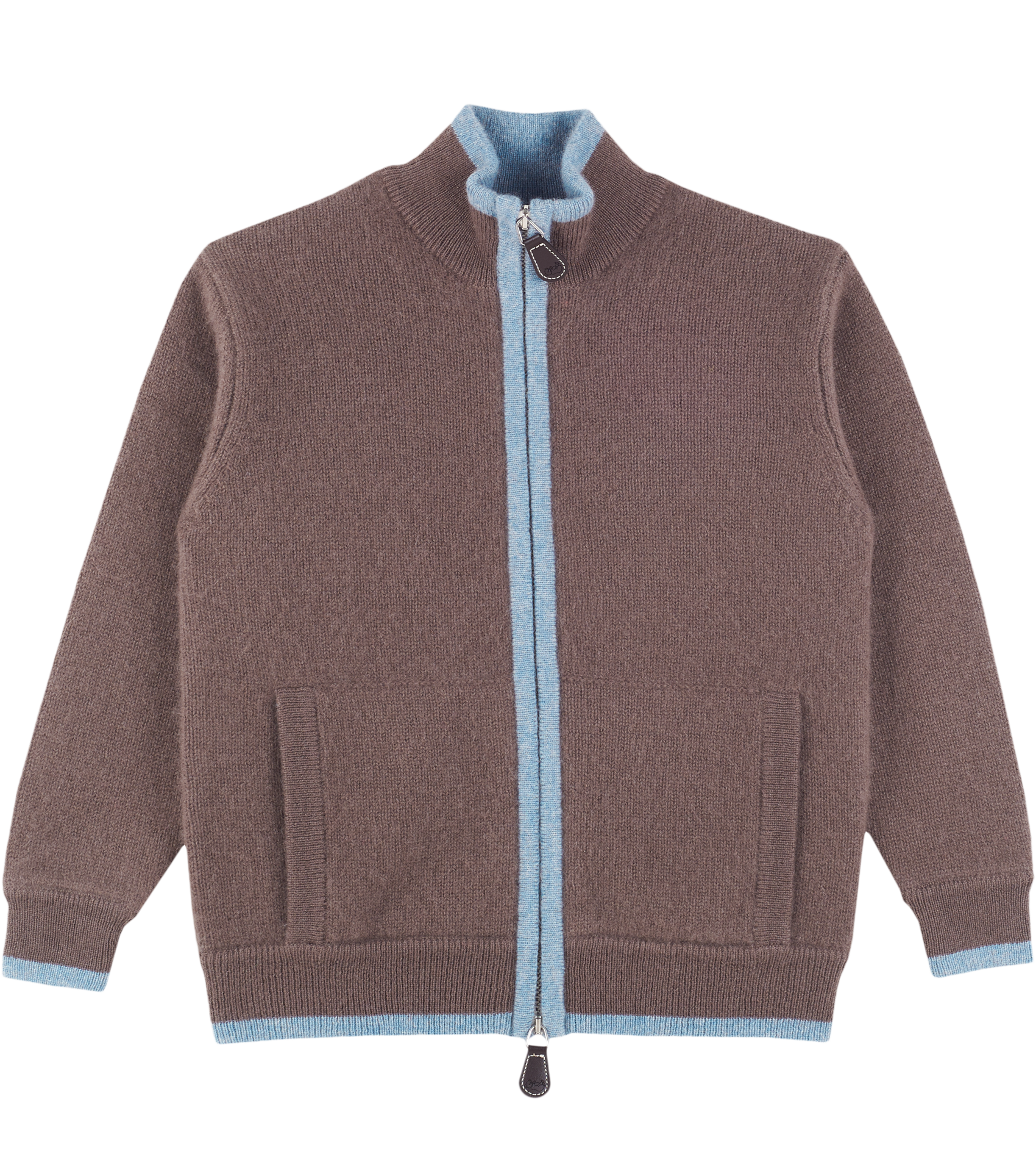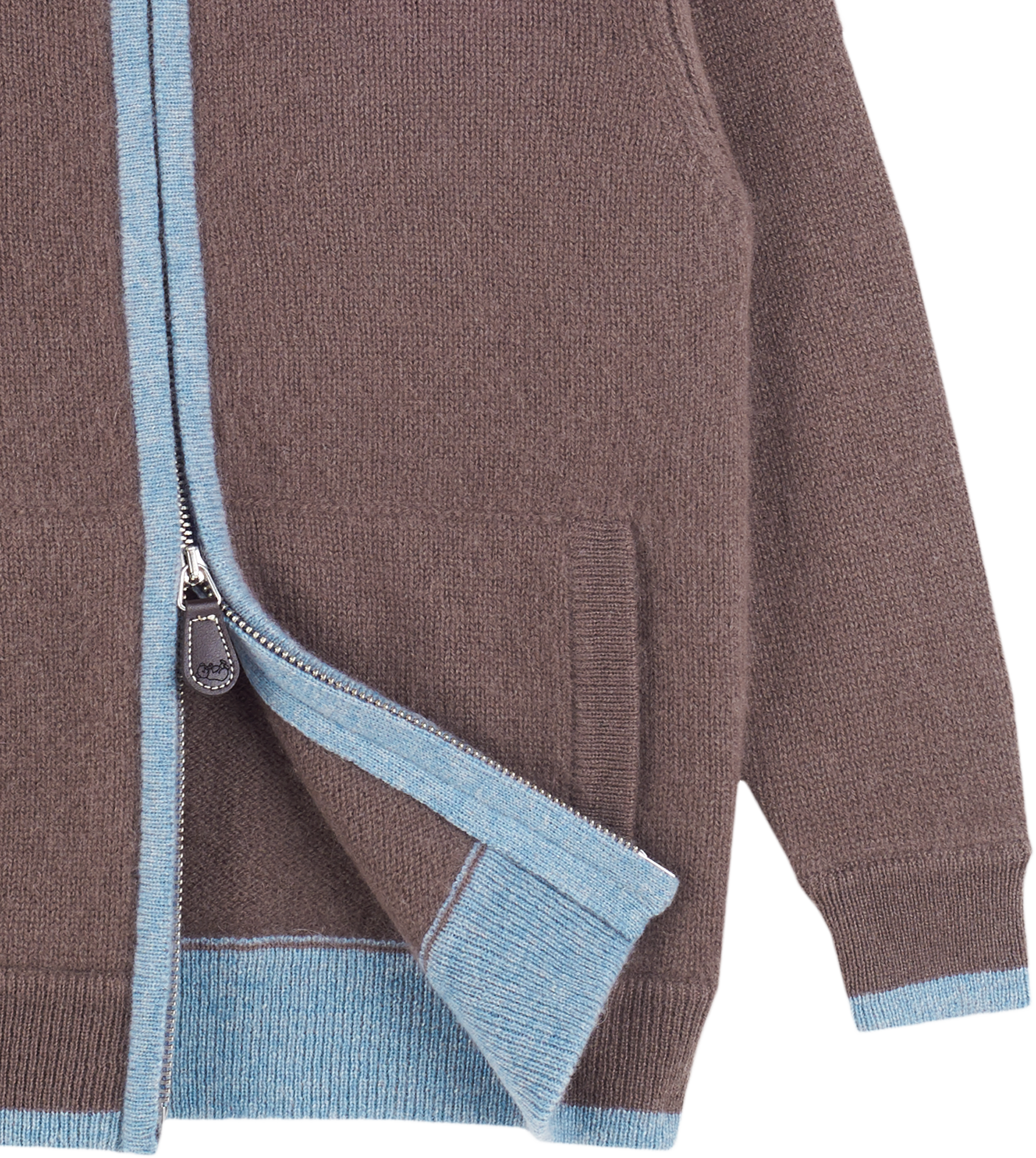 Our super-soft zip-up 100% Mongolian cashmere boy cardigan with contrast colour trim at the collar, cuffs, zip, and waist. A double-ended zip with stitched zip pulls and front pouch pockets complete this stylishly practical jumper.