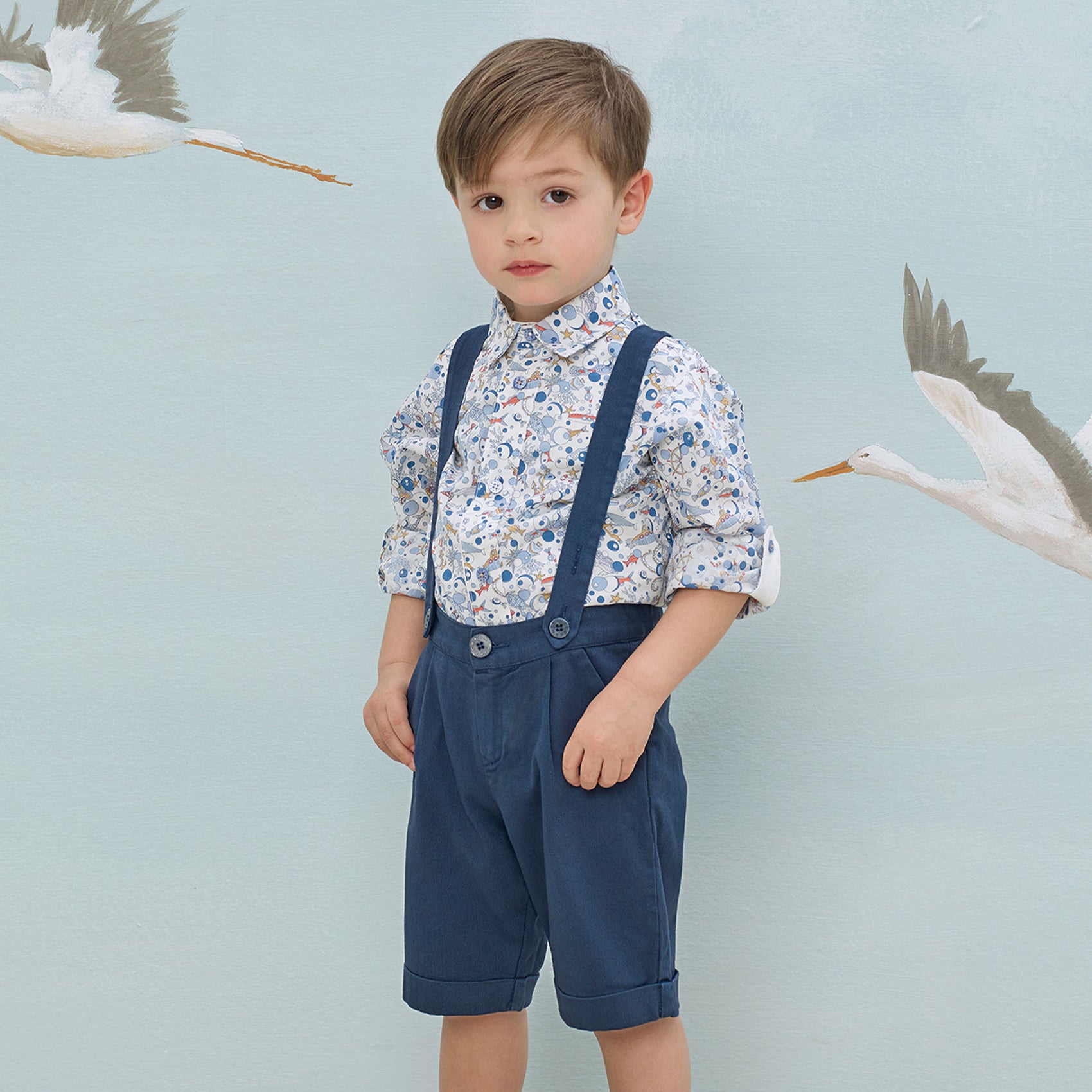 A boy classic collar shirt with sea prints featuring internal contrasting detail, long sleeves and Cashmirino signature buttons. Made with Liberty fabric.