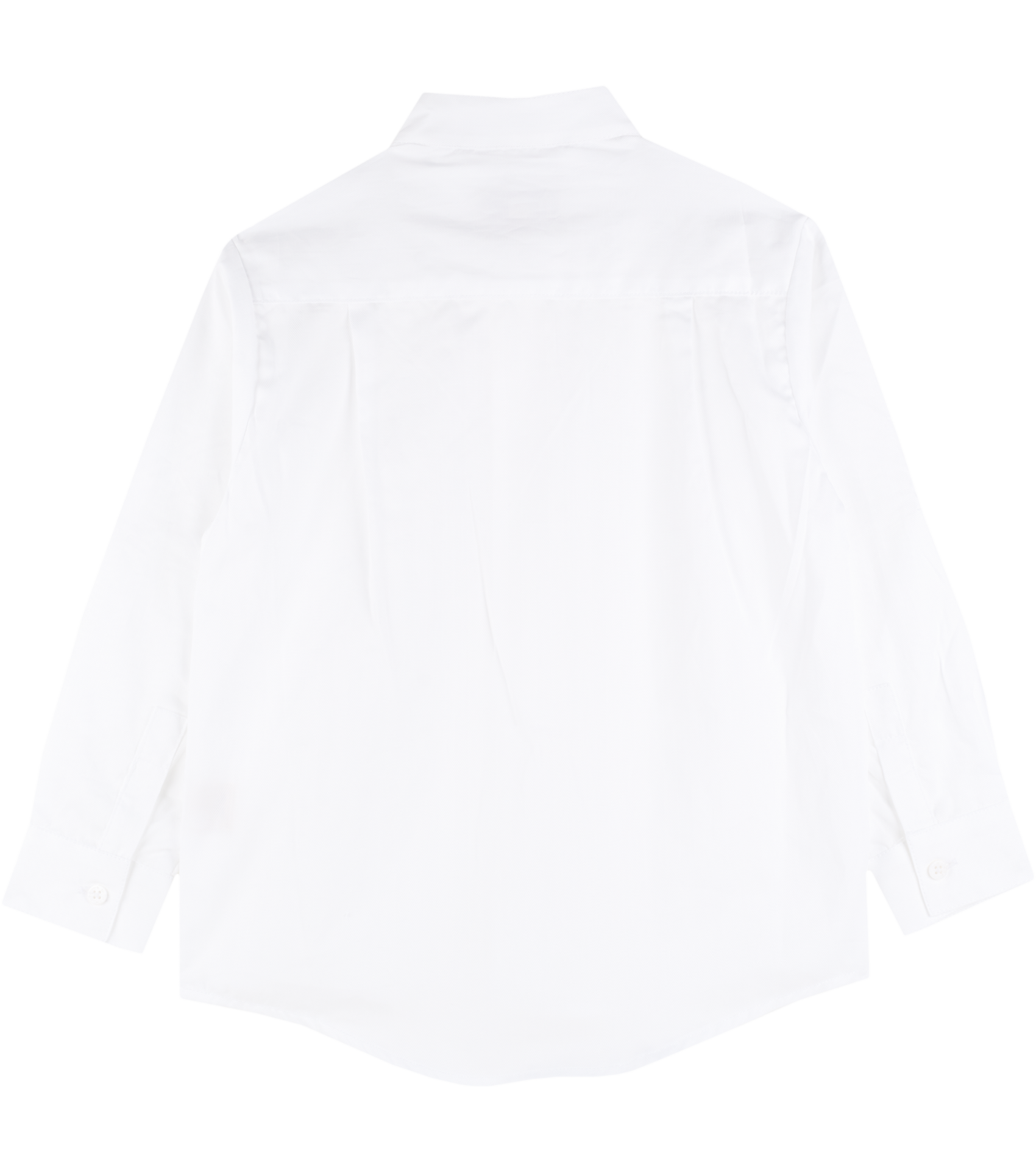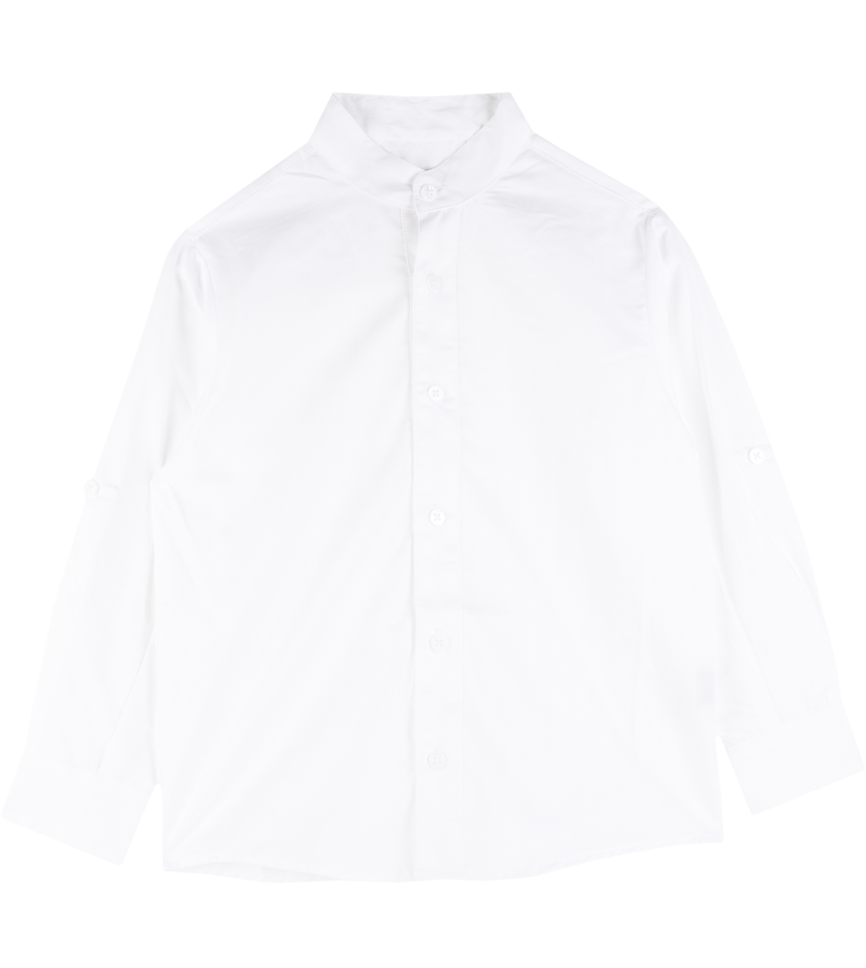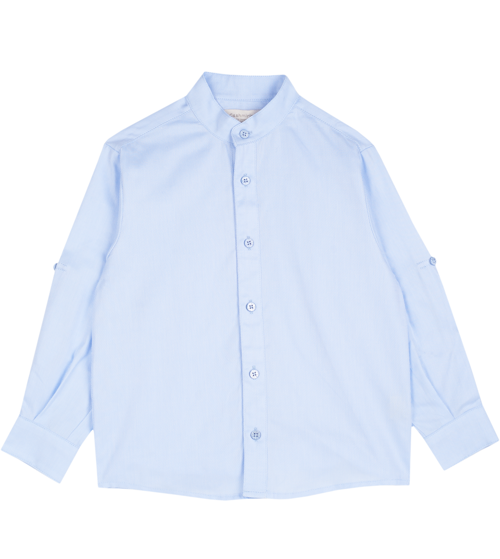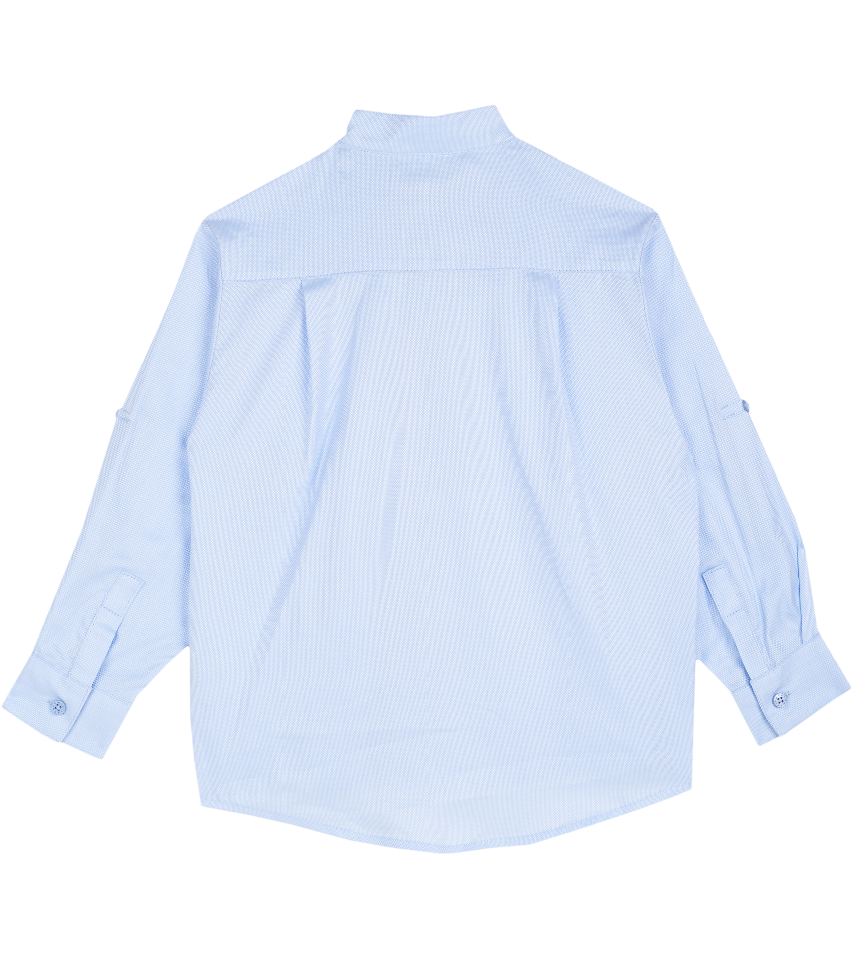 A boy 100% cotton Grandad collar shirt with long sleeves that can be rolled up. Ideal for keeping cool during the summer.