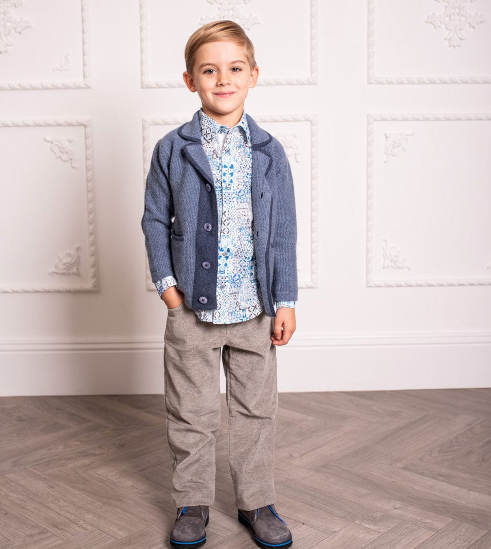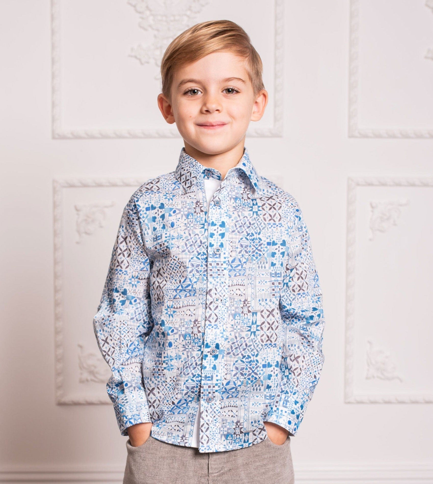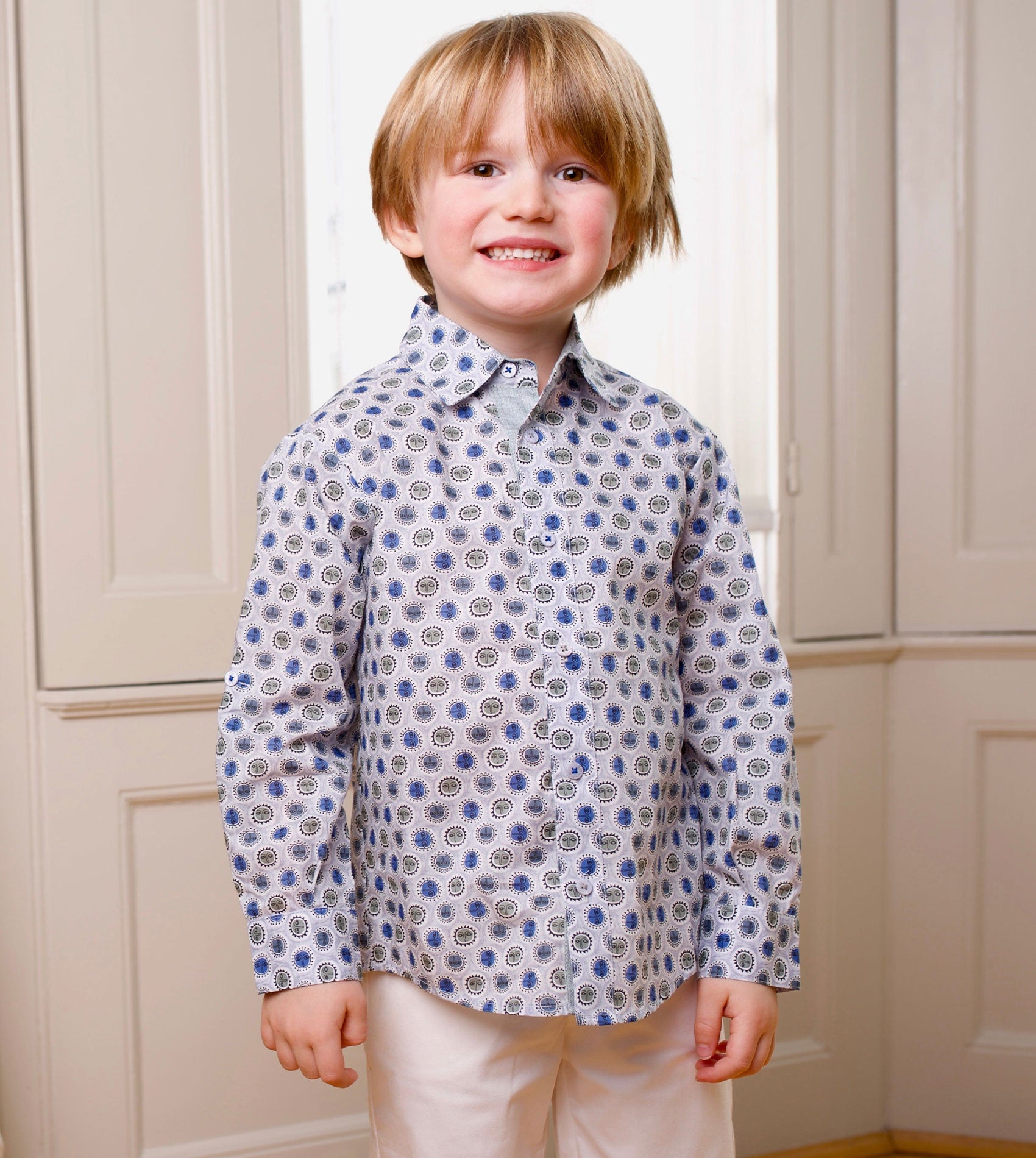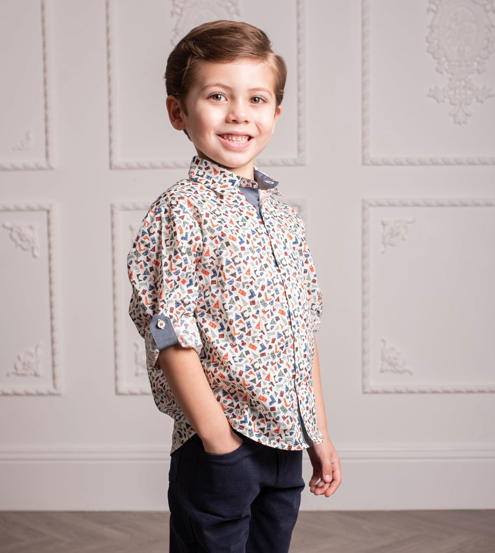 A boy classic collar shirt with geometrical prints featuring internal contrasting detail, long sleeves and Cashmirino signature buttons. Made with Liberty fabrics.