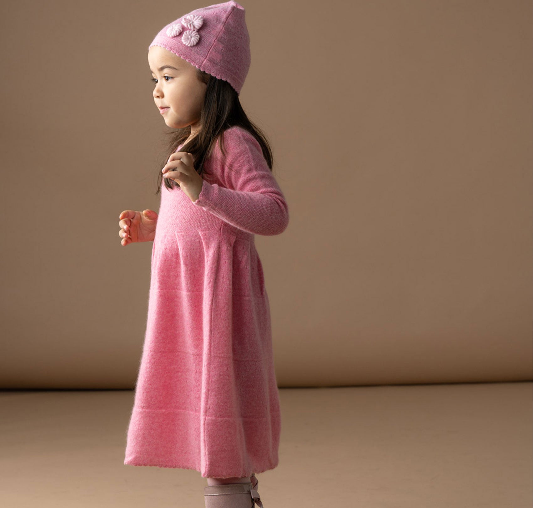 The Clara girl hat is an extremely sweet addition to the Clara Midi Dress. It is naturally breathable and 100% Mongolian Cashmere. Its three beautiful applique crochet flowers make it one of our most eye-catching hats for the cooler months to come.