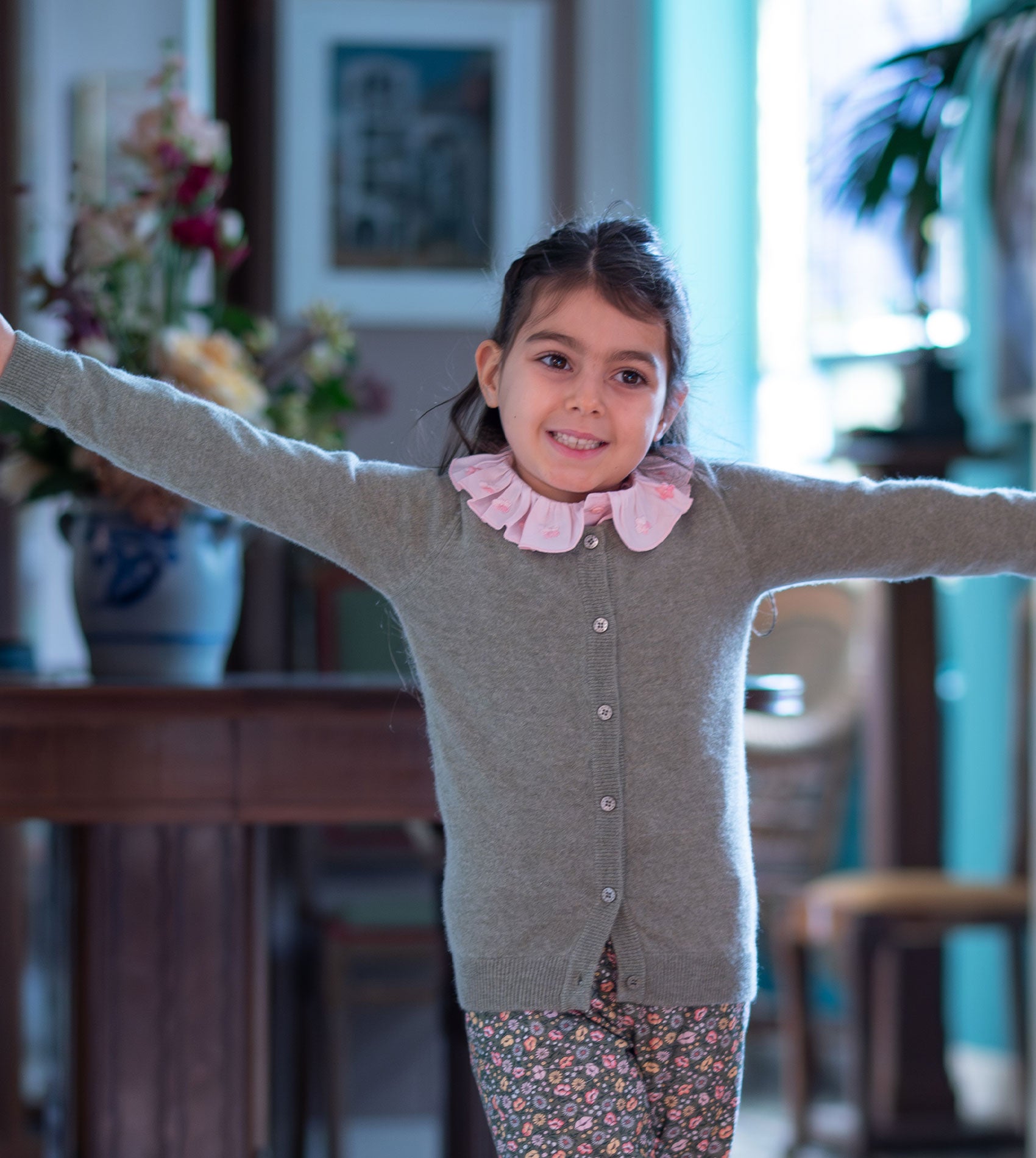 - Delicate, hand-embroidered flowers adorn the collar, adding a unique, artisanal touch