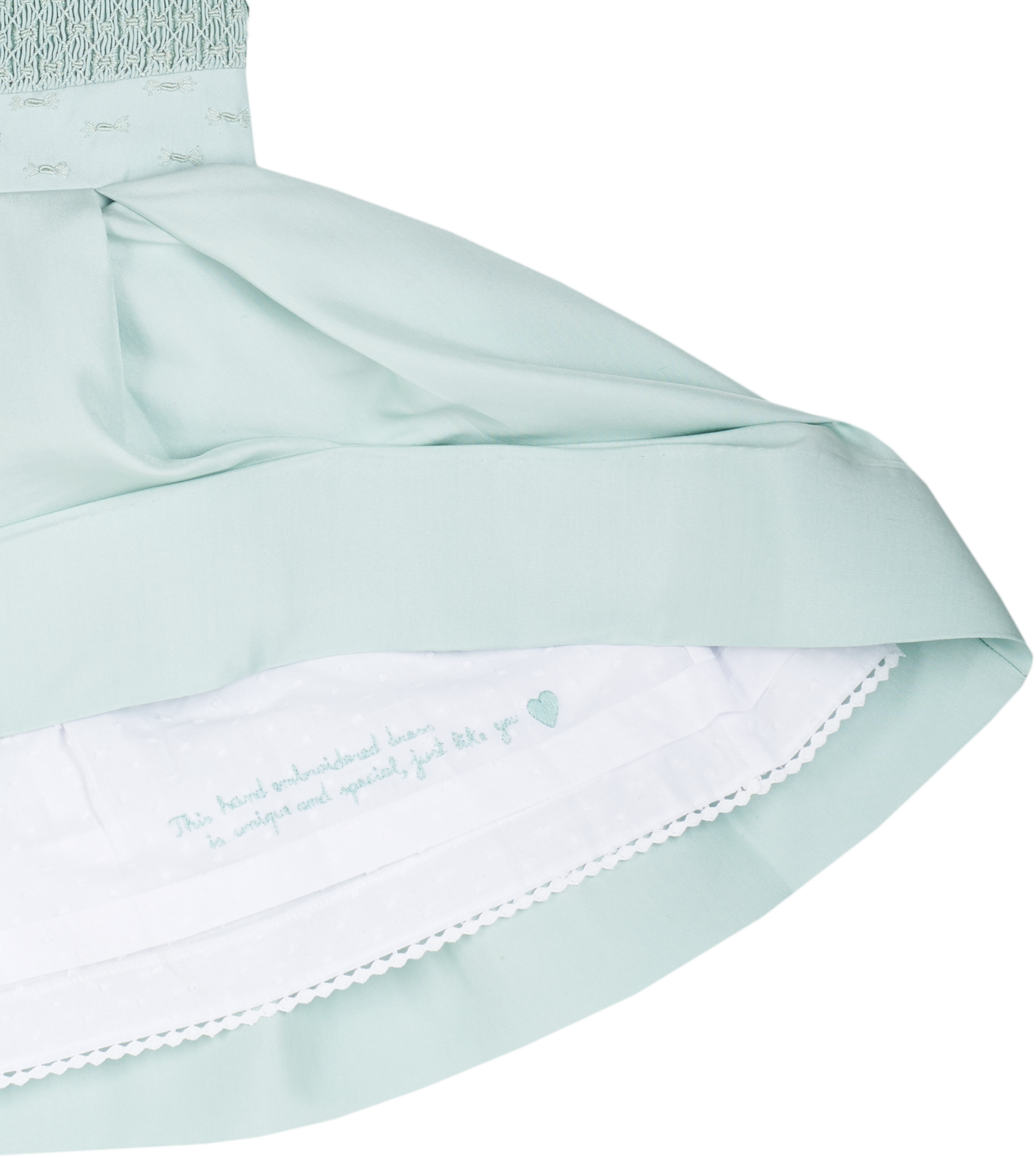 Lined in soft 100% cotton with a crochet-trimmed lace hem, the dress features a hidden back zipper for a seamless fit. Inside, a hand-embroidered message along the hem reads: