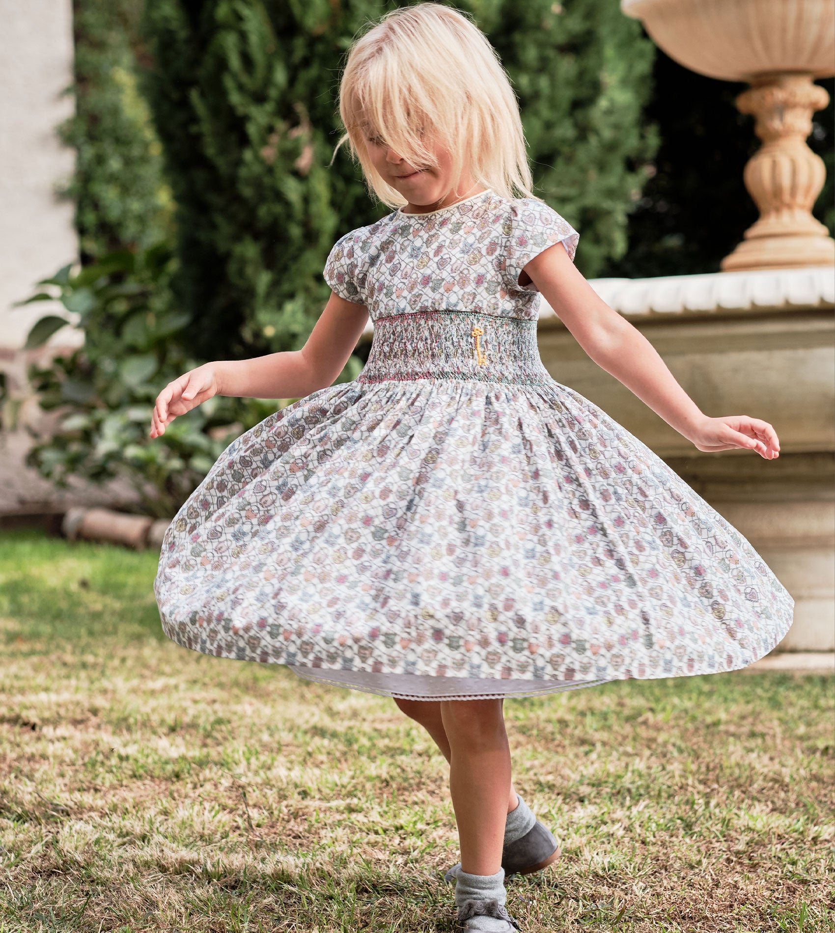 Fresh from our selection of girl's summer outfits, our Veronica cotton hand smocked girl dress is made with Liberty fabrics and features unique hand embroidery and piping detail along the neckline. A layer of white tulle along with the cotton underlining enhance the volume of the skirt.