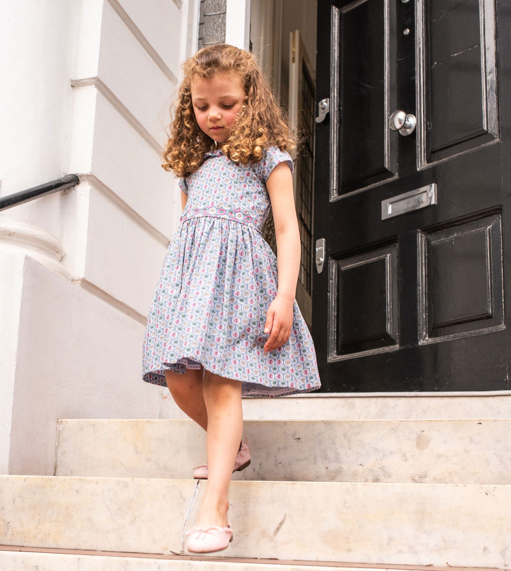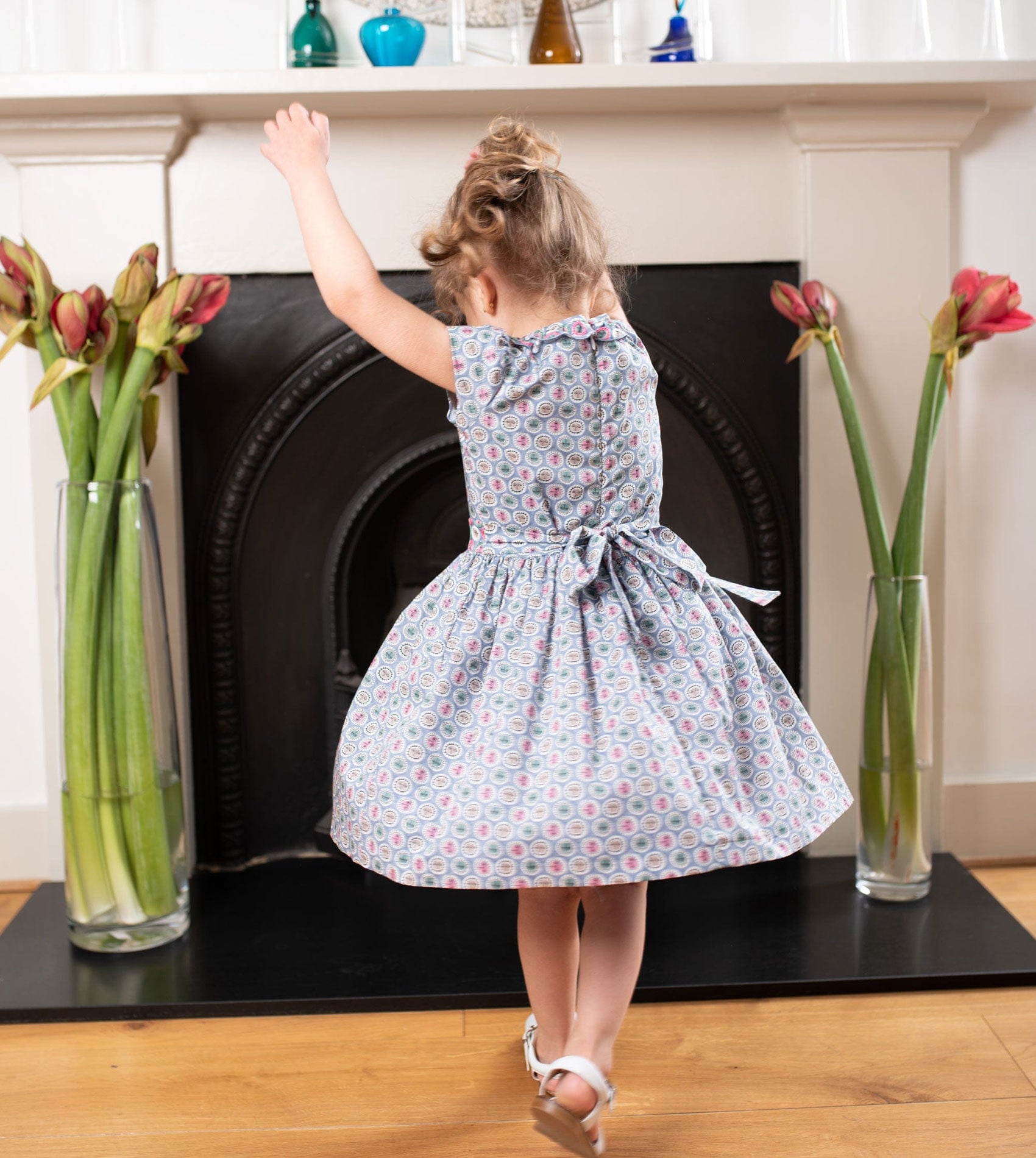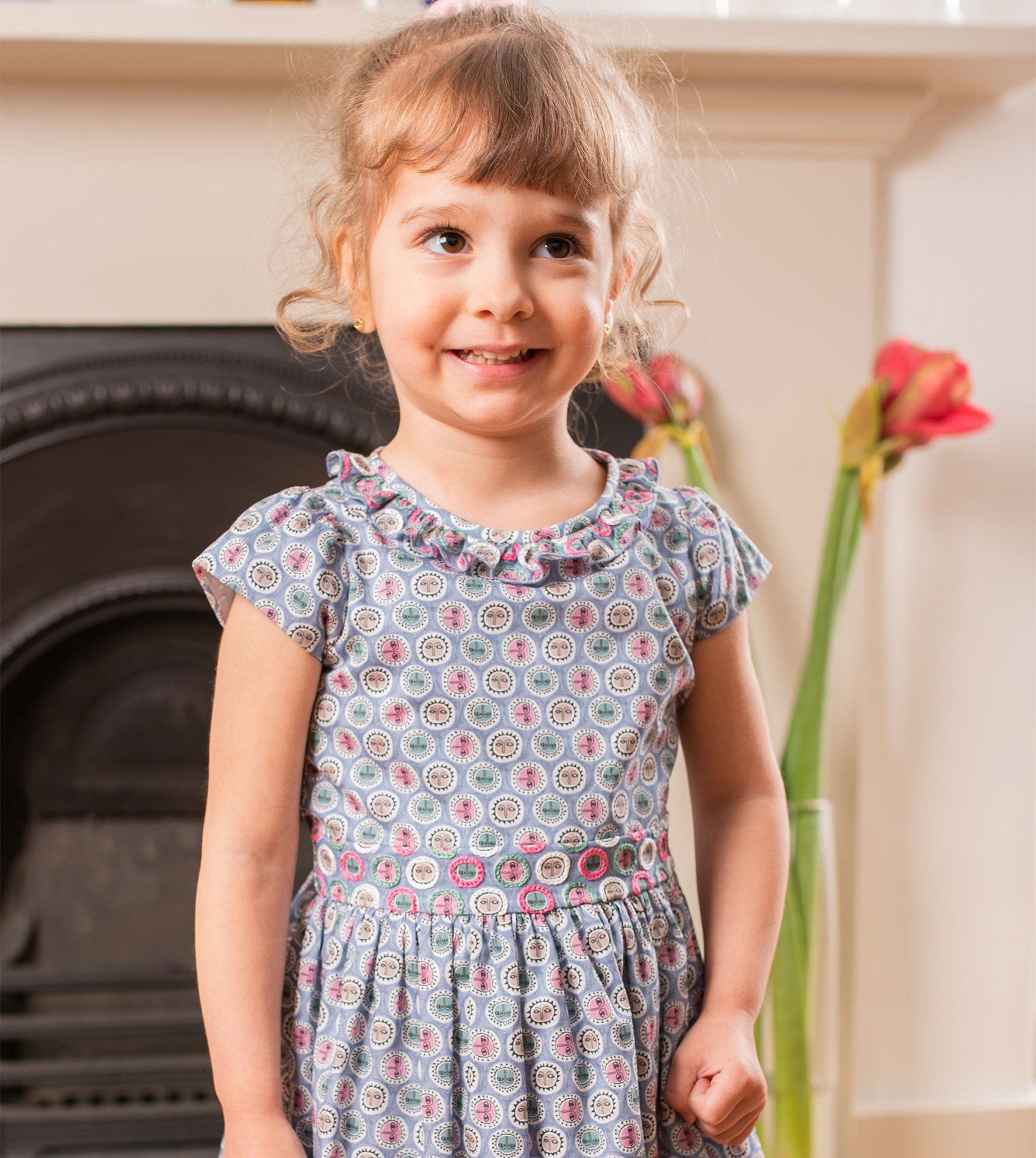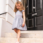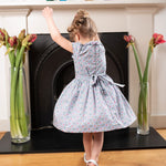 A beautifully crafted Liberty print dress made from lightweight Liberty cotton, designed to feel as special as it looks. This timeless girls’ dress features exquisite hand embroidery at the waist and collar, delicate cap sleeves, and soft ruffled collar detailing for a classic, romantic silhouette. A gently gathered knee-length skirt adds movement, while thoughtful finishing touches elevate the design.