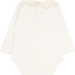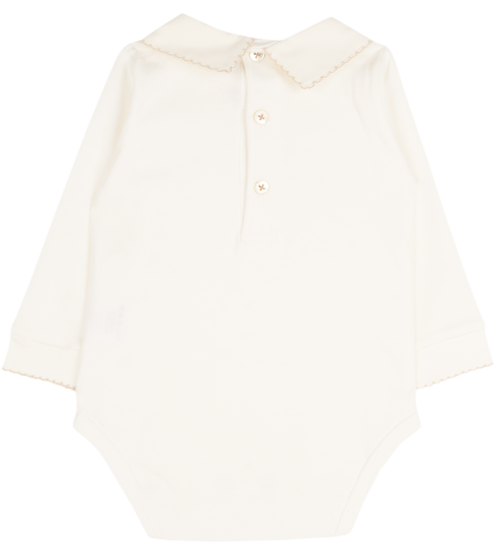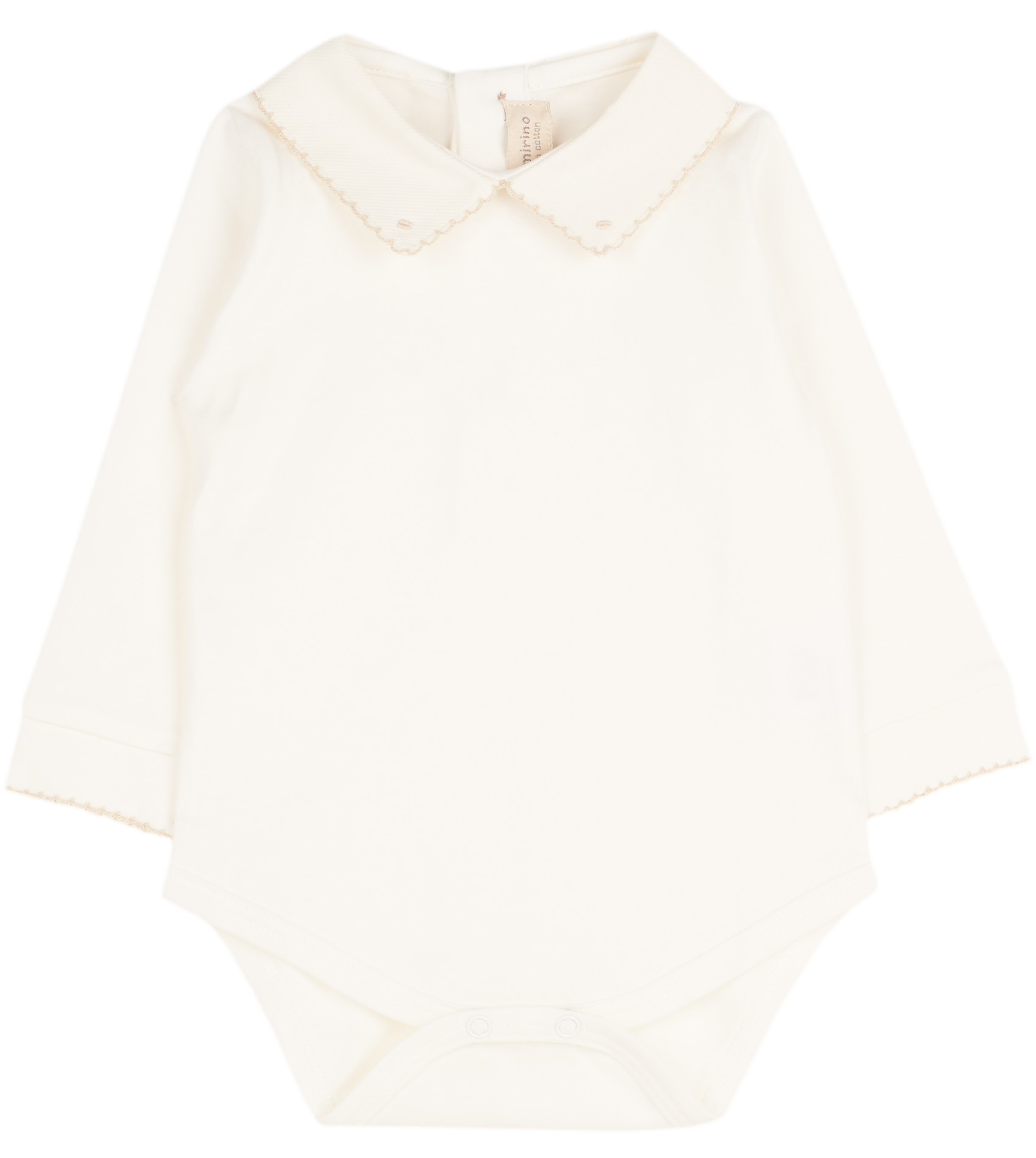 A timeless classic with a touch of elegance, this baby bodysuit is crafted from the softest Pima cotton for ultimate comfort. Featuring a pointed flat collar with delicate hand-embroidered details, it’s designed to bring a subtle, refined charm to your little one’s wardrobe.