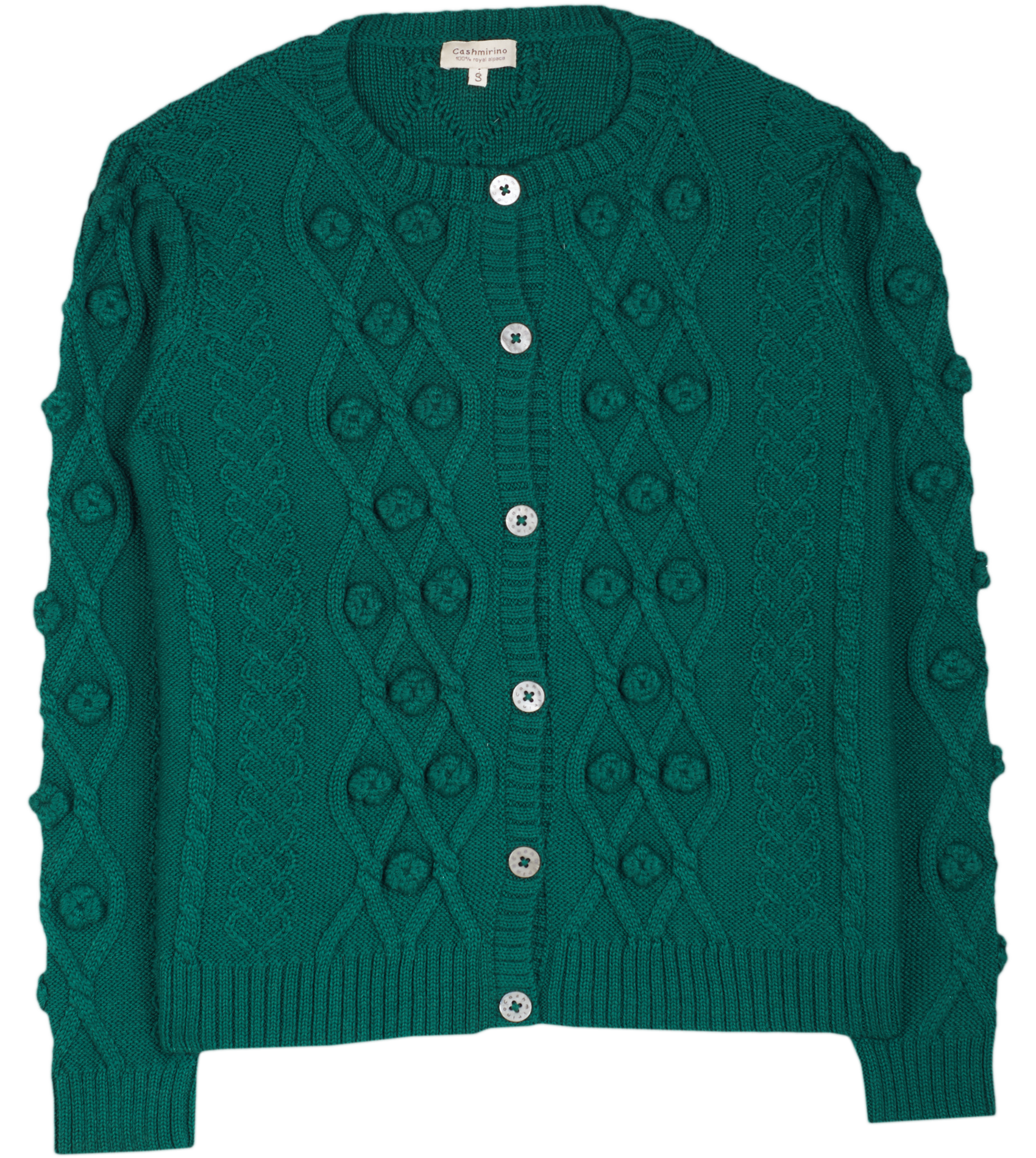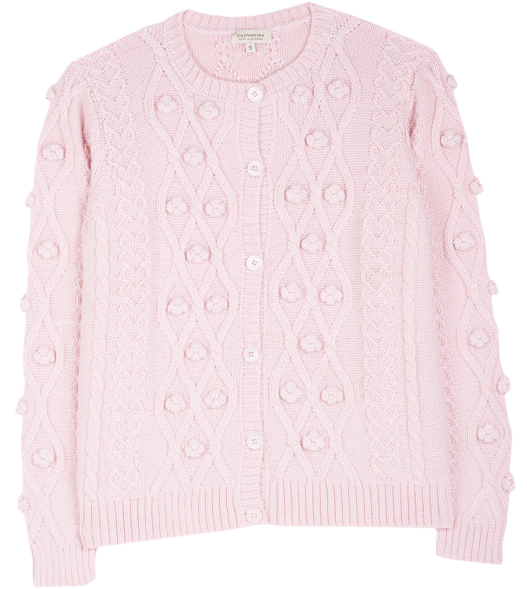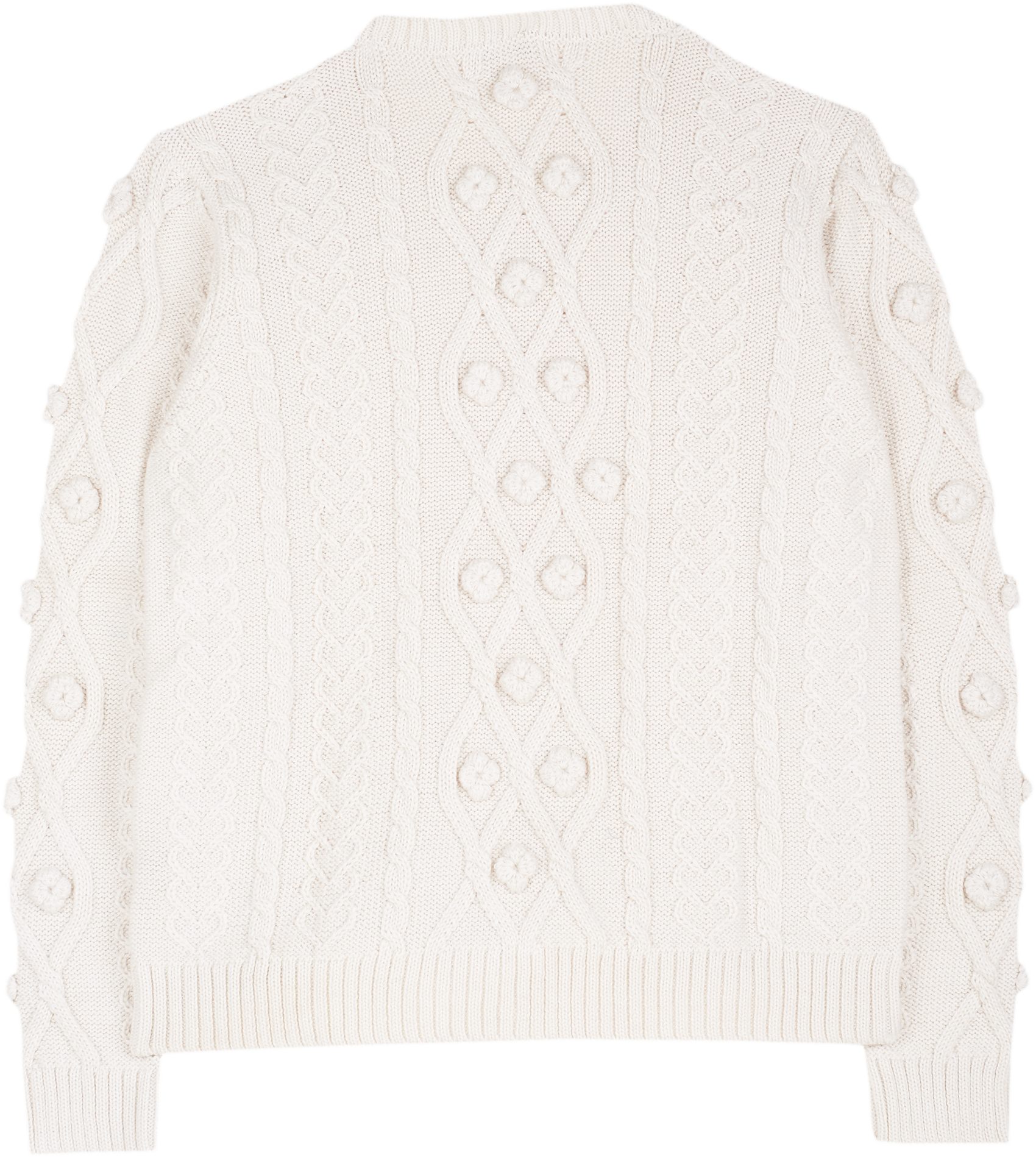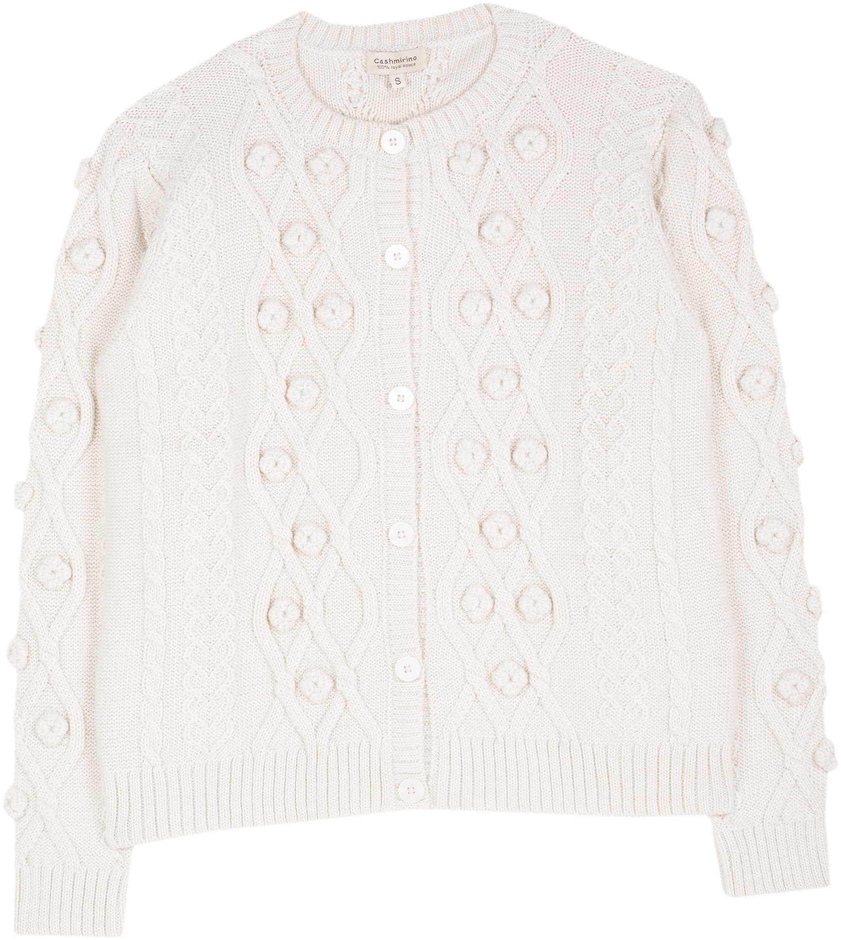 This long-sleeve Aran knit cardigan features an intricate mix of diamond, rope, and heart cable patterns, enhanced with bobbles on the front, back, and sleeves for a playful yet refined texture. Ribbed hems at the cuffs, neck, and waist provide a snug, comfortable fit, while the front opens with our signature Cashmirino buttons, combining practicality with understated elegance.