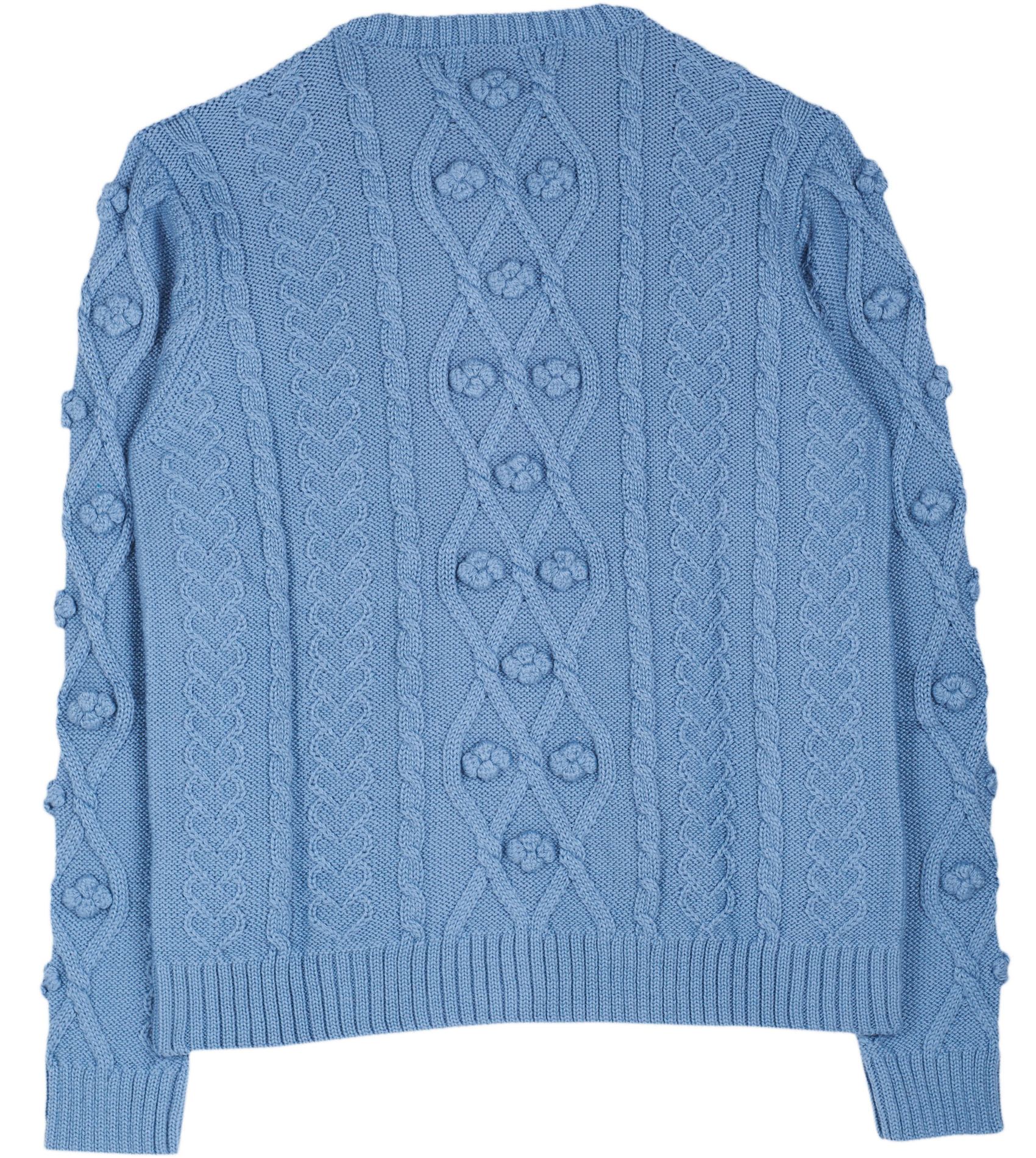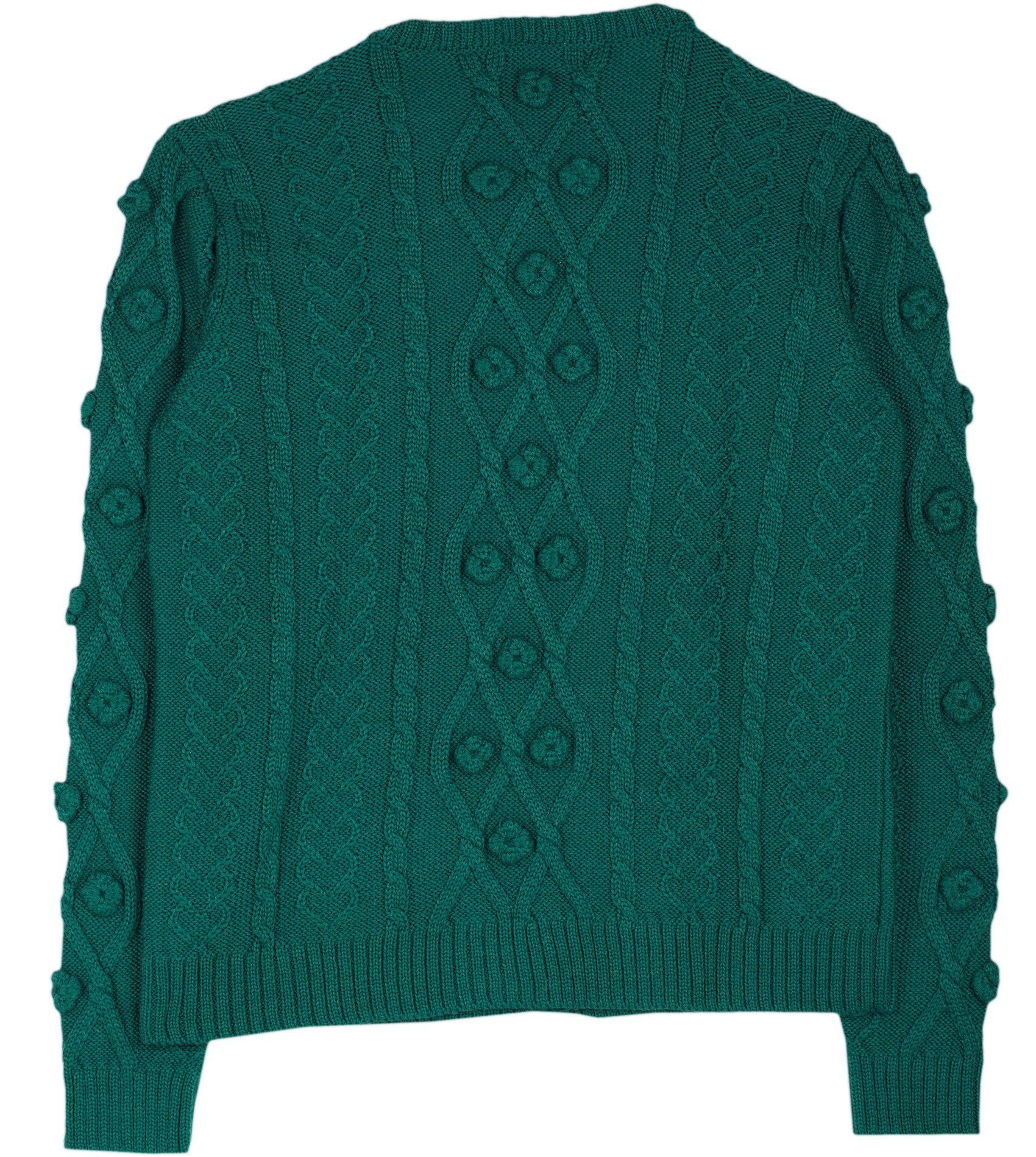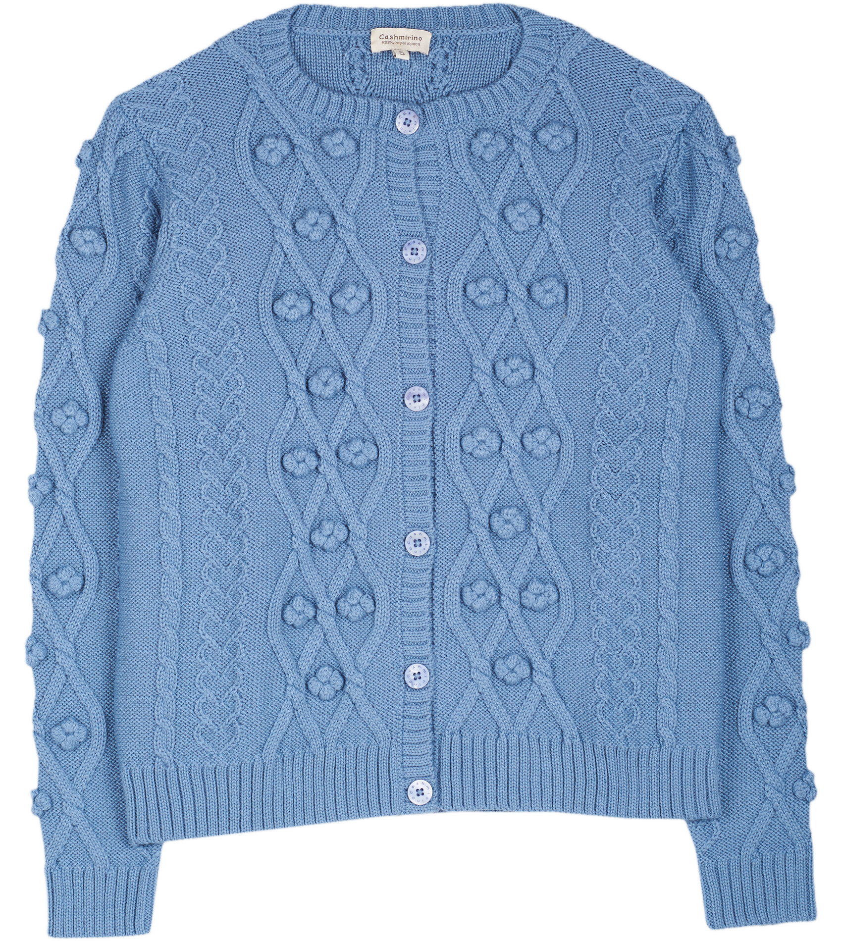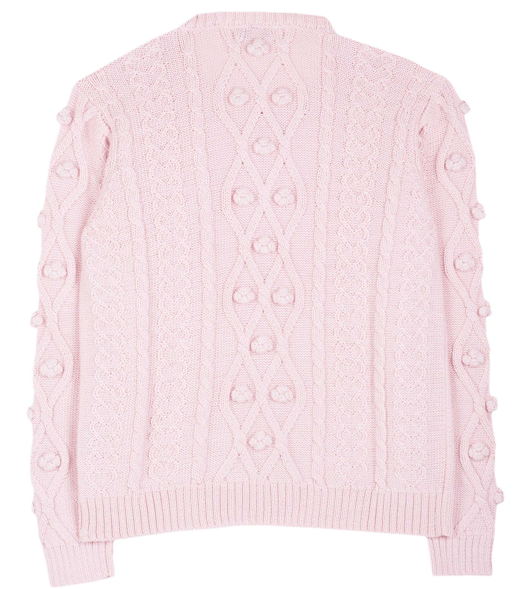 This long-sleeve Aran knit cardigan features an intricate mix of diamond, rope, and heart cable patterns, enhanced with bobbles on the front, back, and sleeves for a playful yet refined texture. Ribbed hems at the cuffs, neck, and waist provide a snug, comfortable fit, while the front opens with our signature Cashmirino buttons, combining practicality with understated elegance.