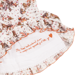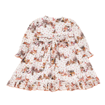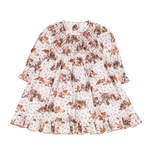 The hand-smocked bodice adds timeless craftsmanship, flowing into a softly gathered skirt that allows freedom of movement. Long sleeves with elasticated frill cuffs and a playful ruffle hem complete the whimsical look. Paired with matching bloomers, the Amrita Set is perfect for both special occasions and everyday adventures.