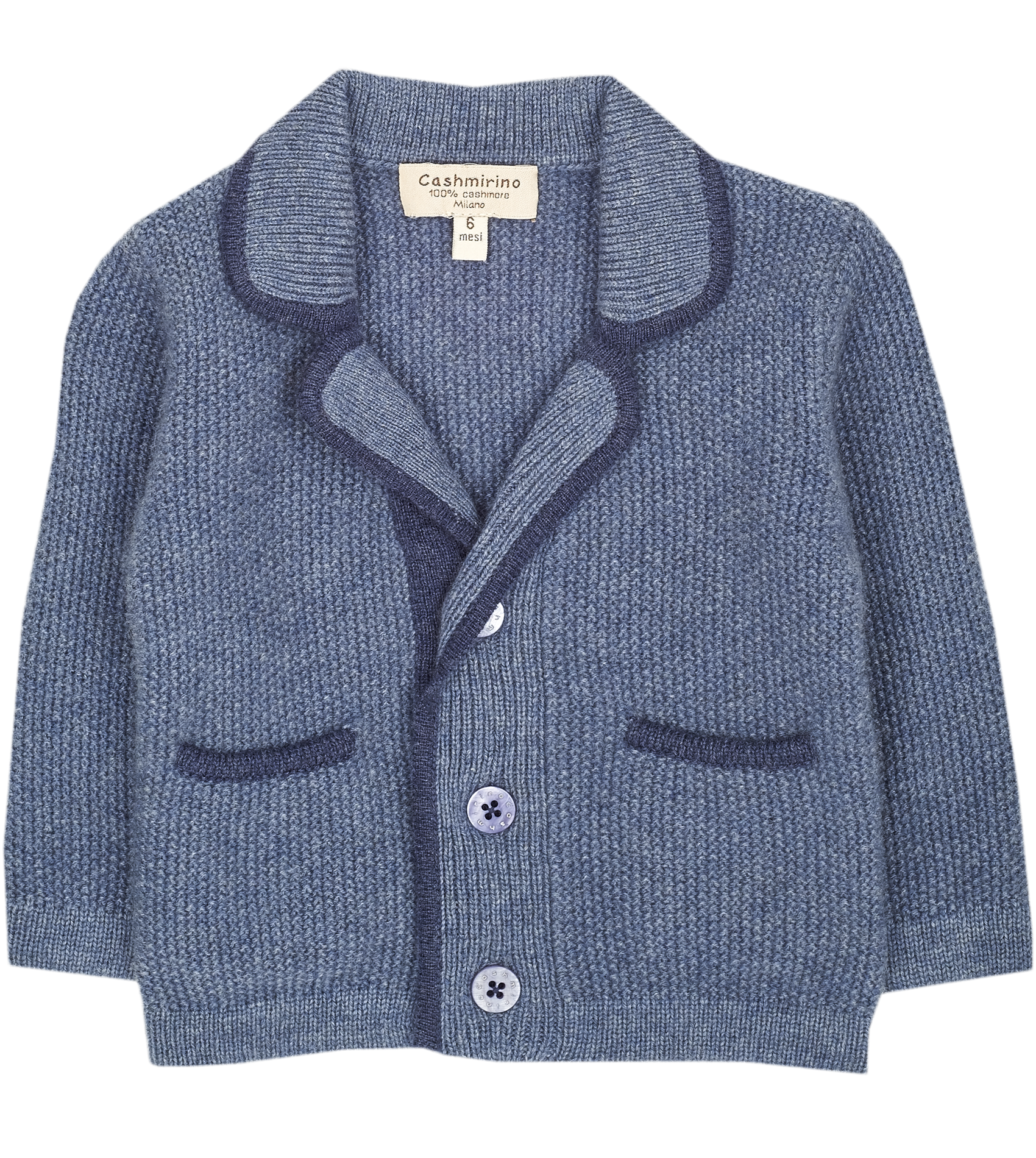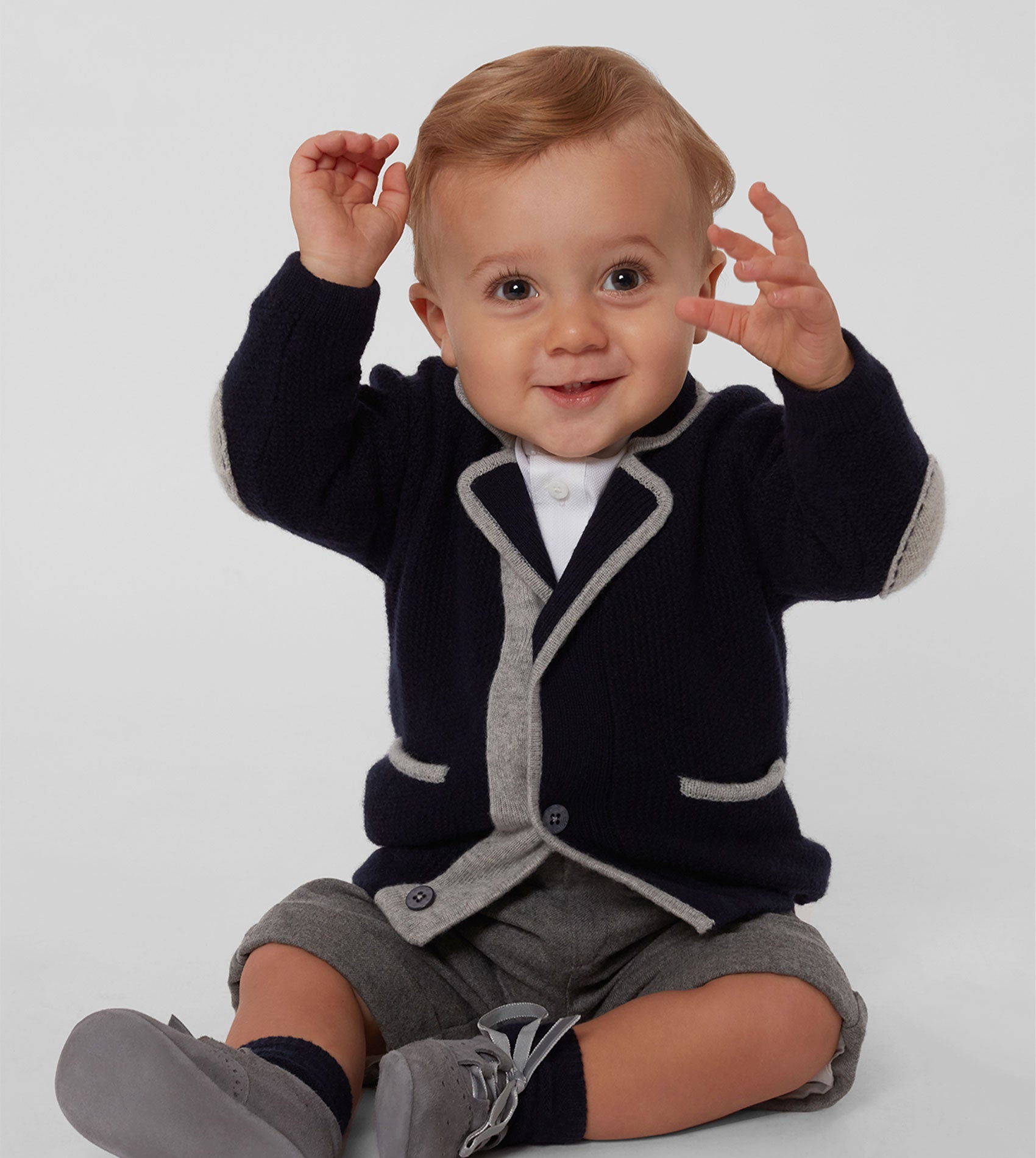 Smarten up your little one’s wardrobe with this beautifully tailored baby boy blazer, crafted from 100% pure cashmere. Designed for comfort and timeless style, it features contrasting lapels, elbow patches, and charming pockets — all finished with our signature Cashmirino buttons.