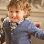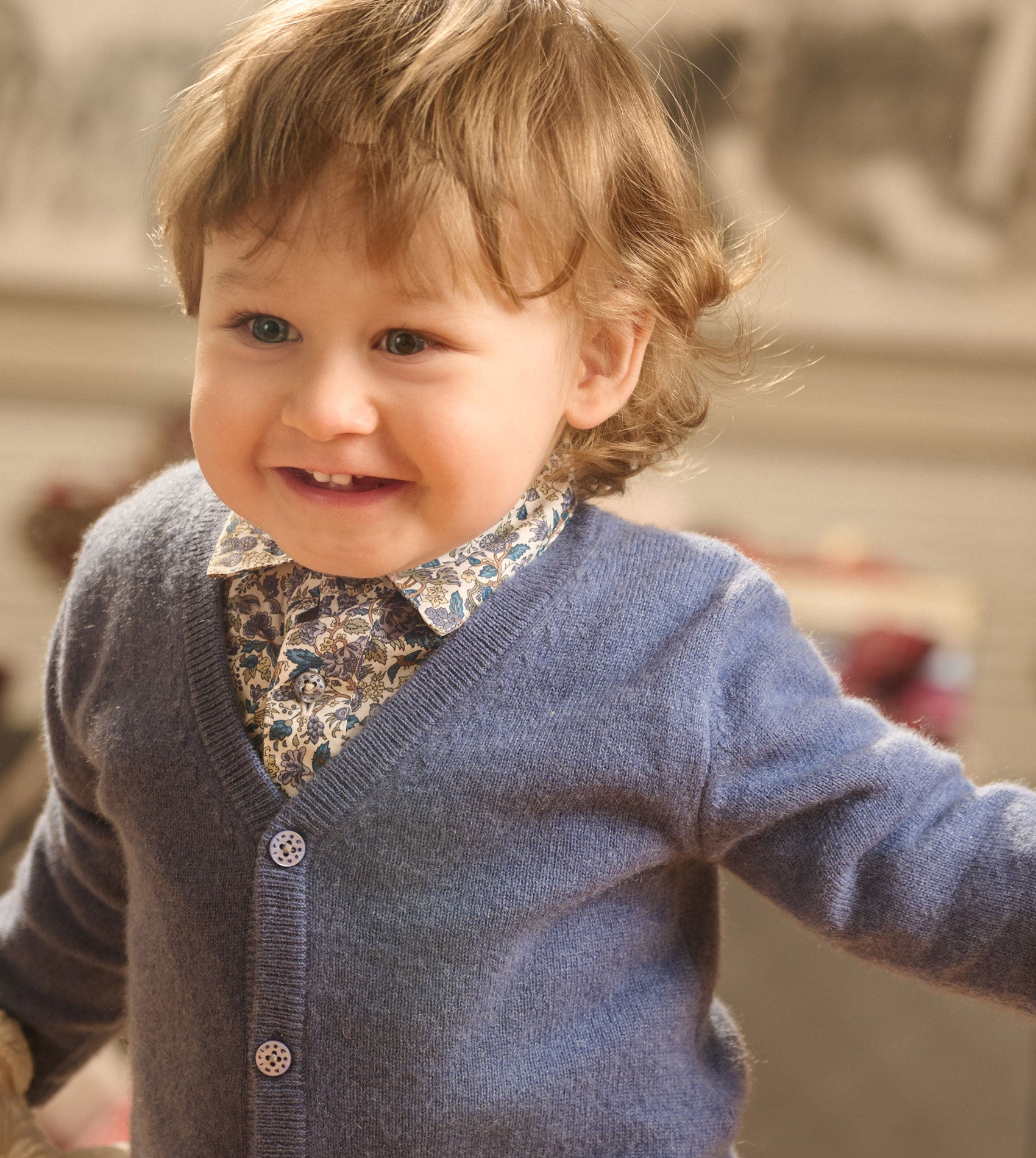 A classic 100% lightweight cashmere baby boy V-neck cardigan with long sleeves, a ribbed hem and button fastening. Ideal for all occasions. This lightweight cardigan can be used in autumn or spring or as a layer in winter.