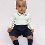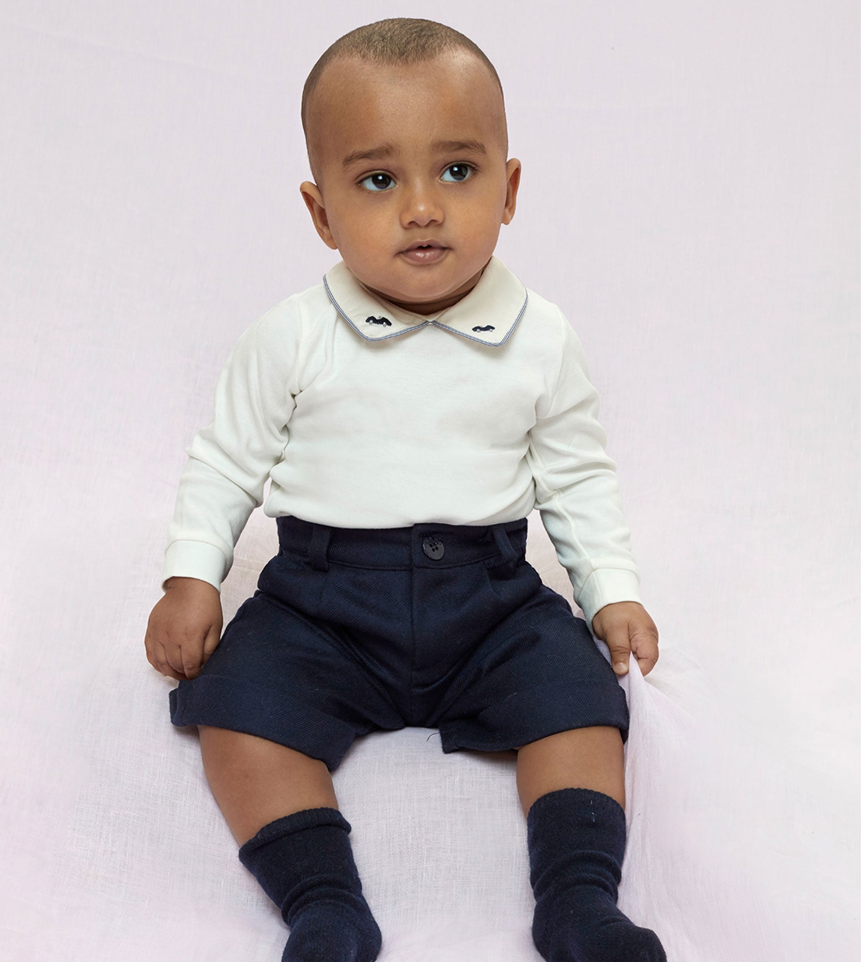 100% Pima Cotton baby boy long-sleeve Bodysuit with a classic collar, car hand-embroidery and border detail.