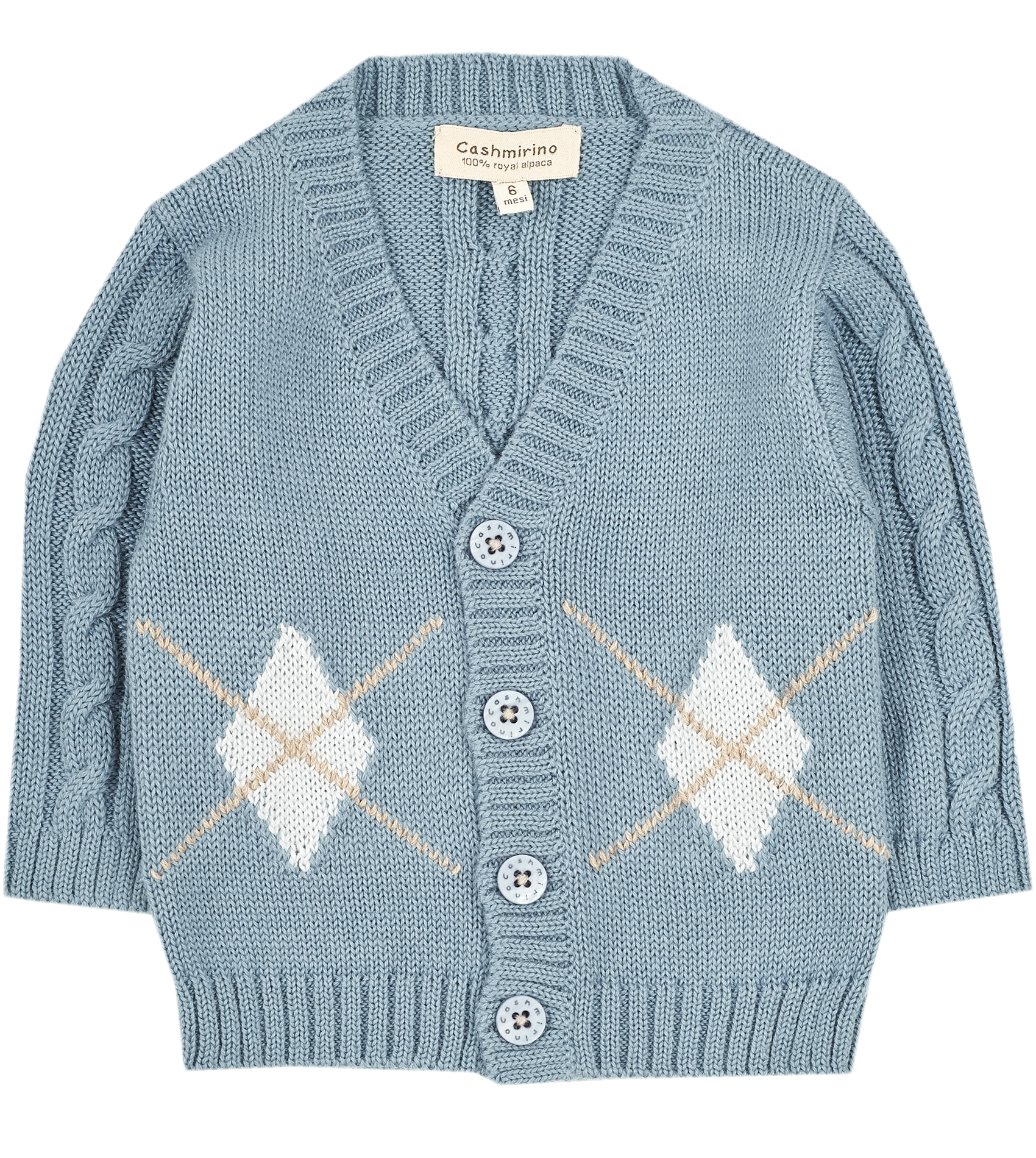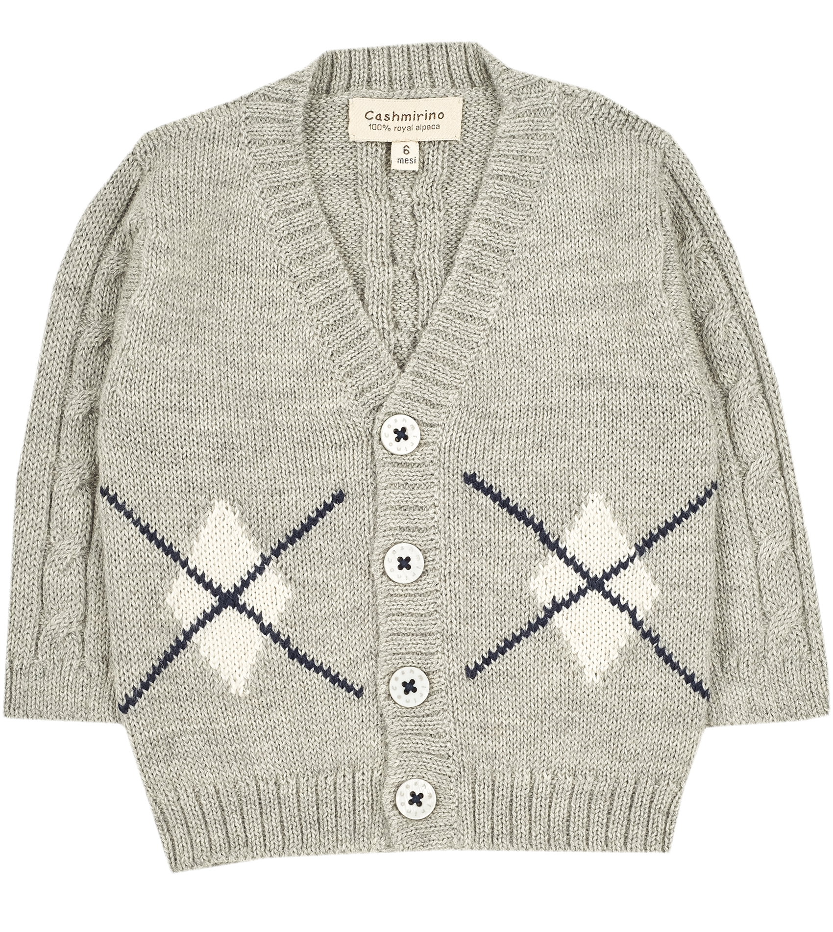 The perfect combination of a dash of daring, a sprinkle of courage and a lot of heart. Our 100% Royal Alpaca cardigan is here to knock your socks off with its bold contrasting front detailing, lovely cable knitted stitching on the arms and back, a beautiful V-neck collar and Cashmirino's signature buttons to fasten for the cherry on top.