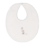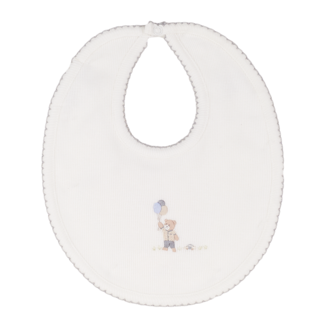 Our little embroidered bear can join your little one for breakfast, lunch and dinner. This delightful piece features an adorable bear, carefully and meticulously embroidered by hand - a testament to our dedication to craftsmanship and attention to detail. Easy to remove and put on with popper fastening and the perfect way to avoid any spills.