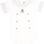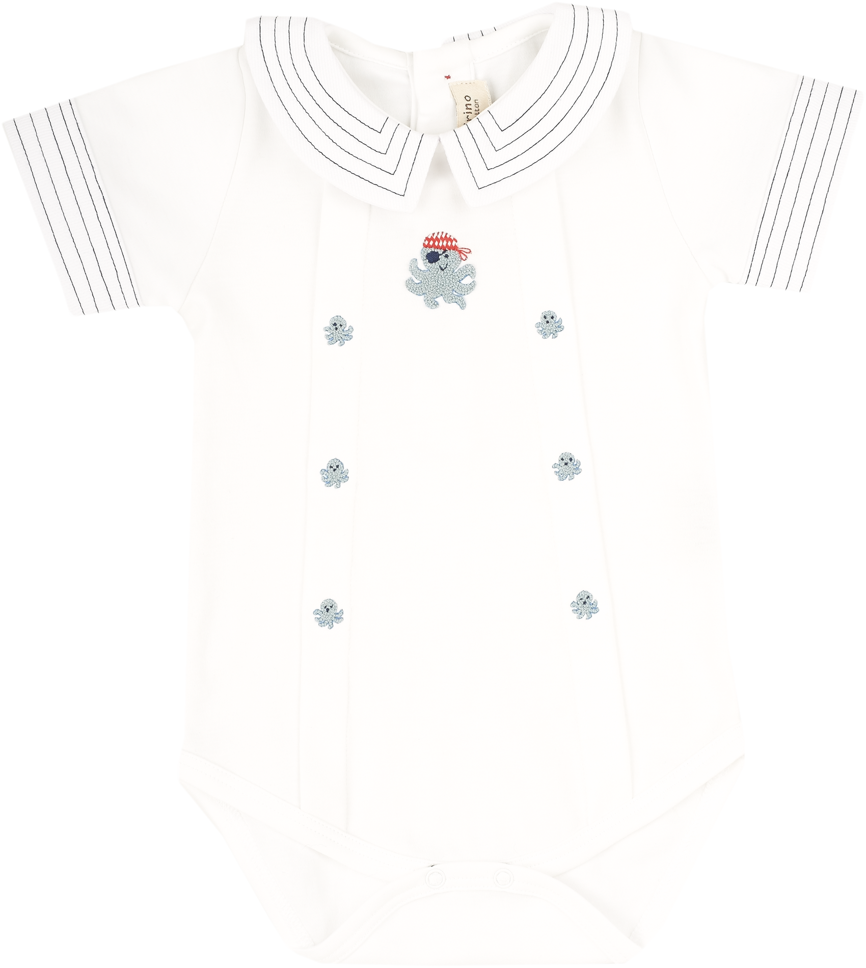 Aye Aye Captain! The Orlando bodysuit is set to sail with intricately hand embroidered octopuses in light Pima Cotton. It features sailor shorts with contrast stitching, buttons and a delightfully designed collar. This set can be paired with a matching embroidered bib, sold separately, to give a finished wholesome look on a warm day.