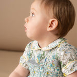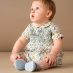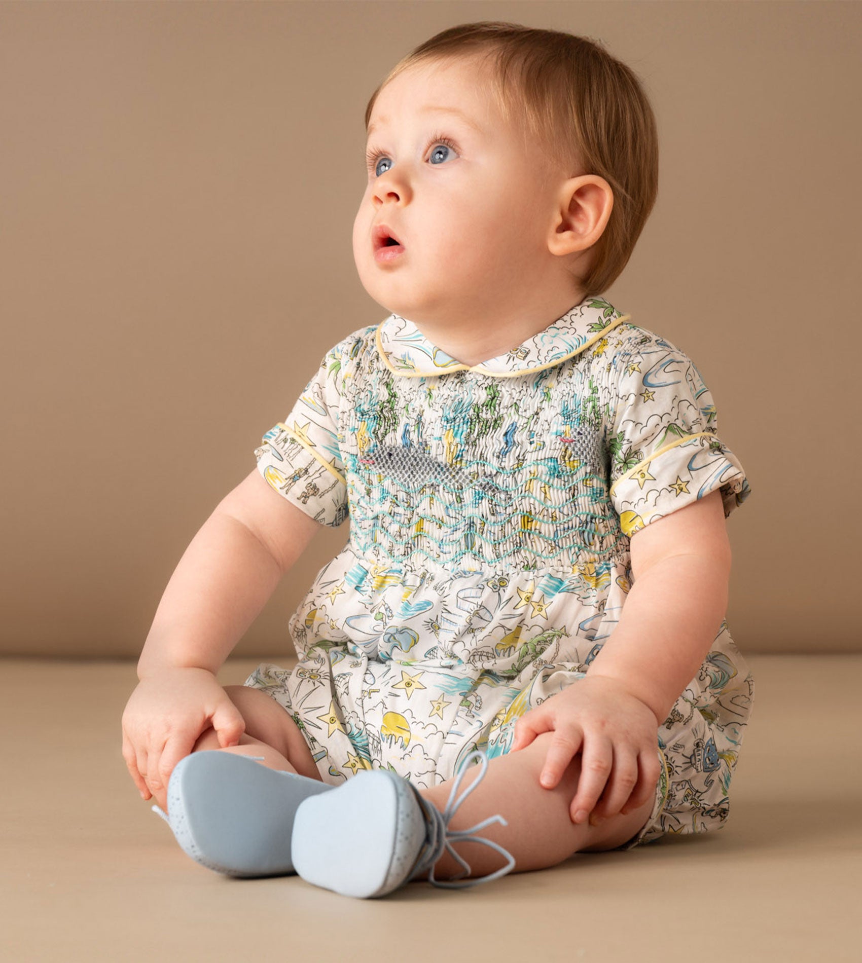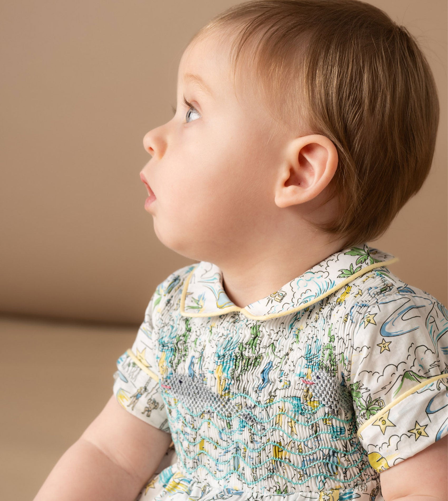 Made from the finest 100% cotton Liberty fabric, the romper features a beautifully hand-smocked chest panel, adorned with hand-embroidered dolphins playfully navigating ocean waves—a nod to LA’s iconic seaside charm. Soft yellow piping on the collar and cuffs adds a vibrant finishing touch, while the short sleeves and balloon shorts ensure breathable comfort for warmer days.