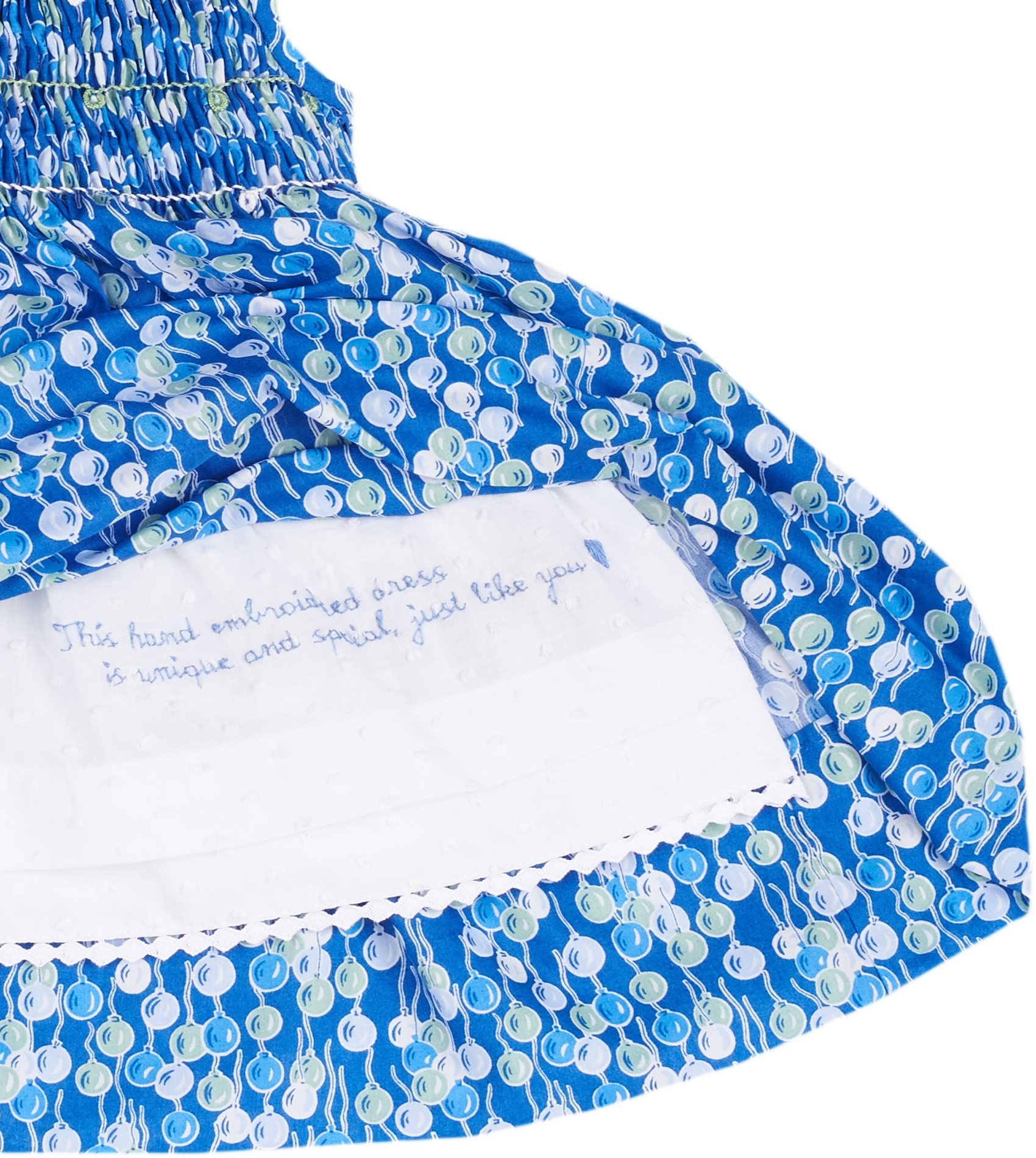 The Alexandra Dress is a beautifully crafted piece designed to celebrate timeless elegance and thoughtful details. Made from 100% cotton for a soft and breathable feel, this dress features exquisite hand-smocking and a delicate all-over print in vibrant blue tones. The sleeveless design ensures comfort, while the full skirt allows graceful movement.
