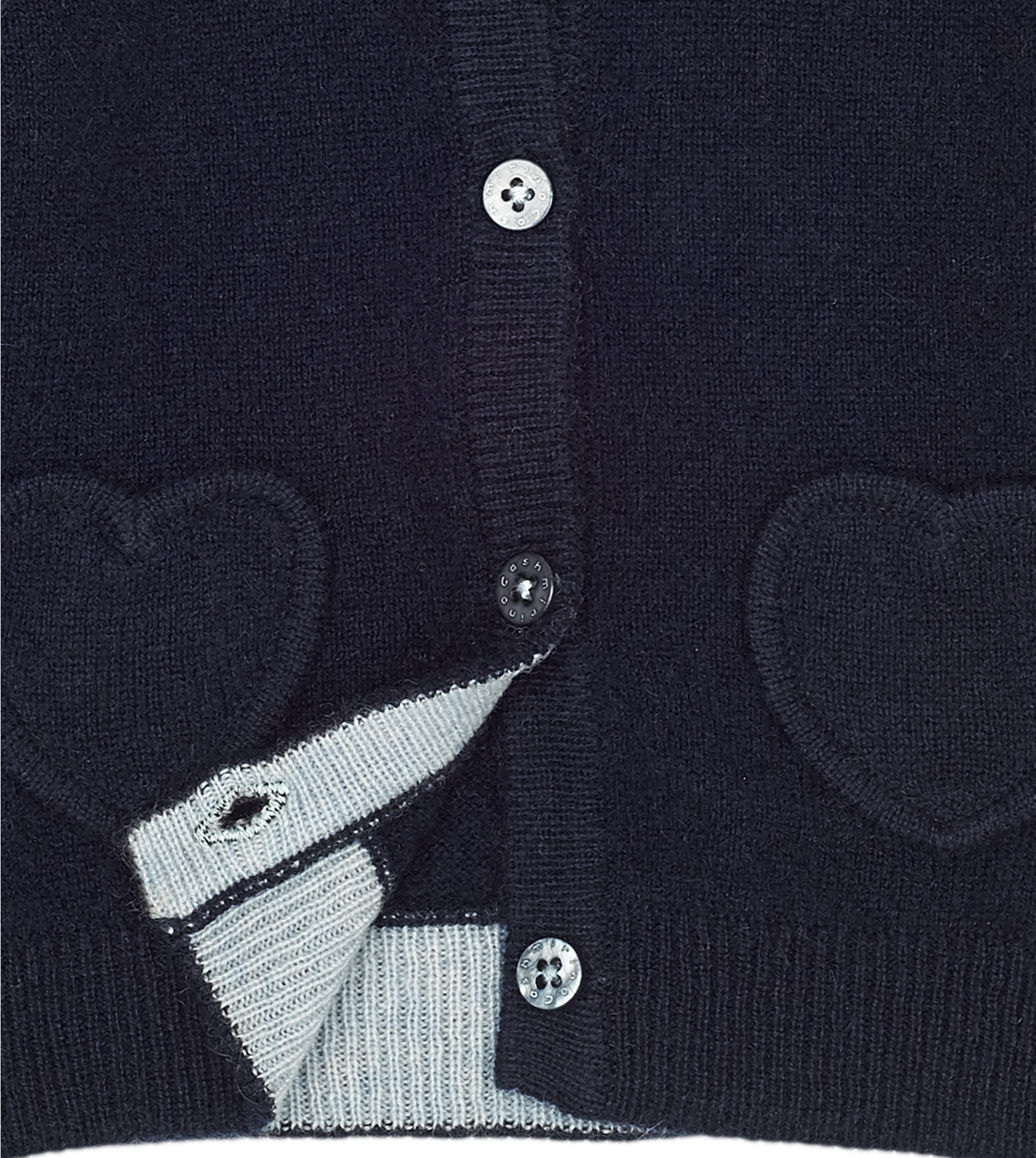 This charming button-up cardigan features a subtle contrast trim on the collar, cuffs, and waistband, adding a refined pop of colour. Heart-shaped pockets add a playful touch that makes this piece even more irresistible.