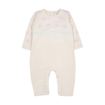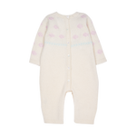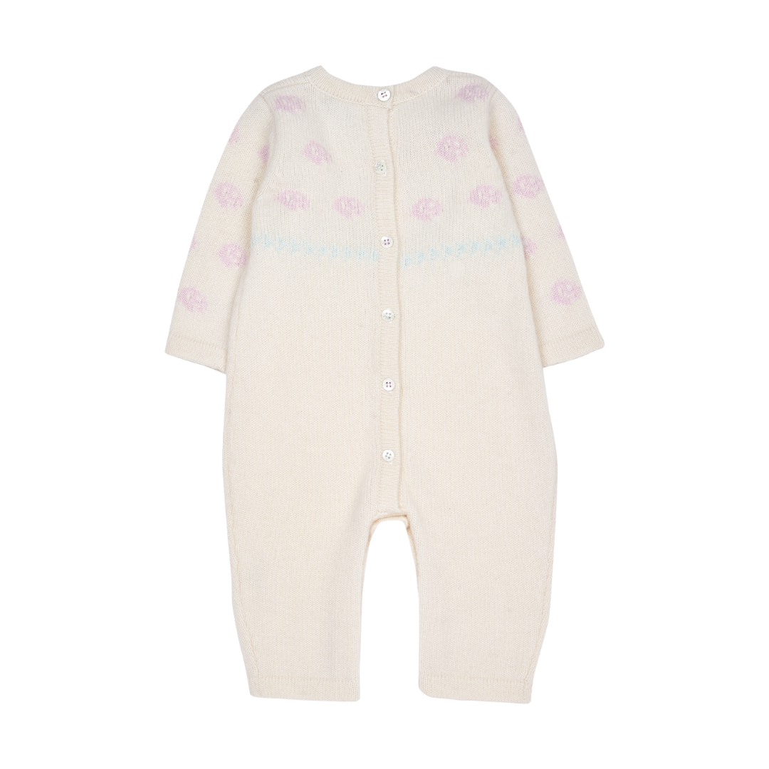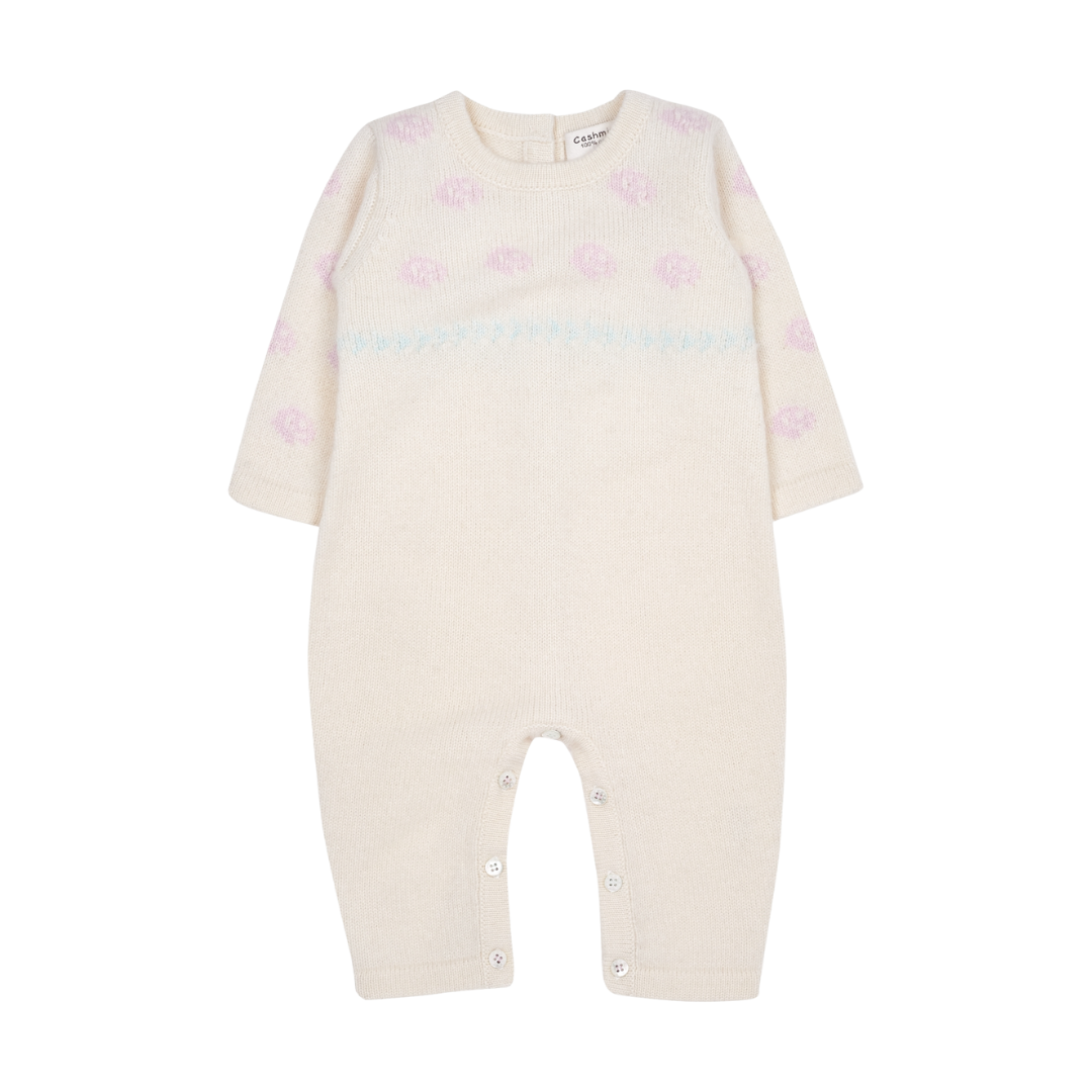 Long-sleeve cashmere romper featuring a subtle floral motif across the chest and sleeves. This one-piece design offers a back button closure for easy dressing and snap buttons along the legs for convenient diaper changes. Crafted from soft cashmere, it provides a gentle and cosy feel, ideal for keeping babies comfortable.