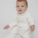 A stylish baby girl doll top with the word 'love' written in rose floral and hand embroidered, a peter pan collar, long sleeves and matching leggings with feet set. Crafted from the finest 100% Pima cotton.