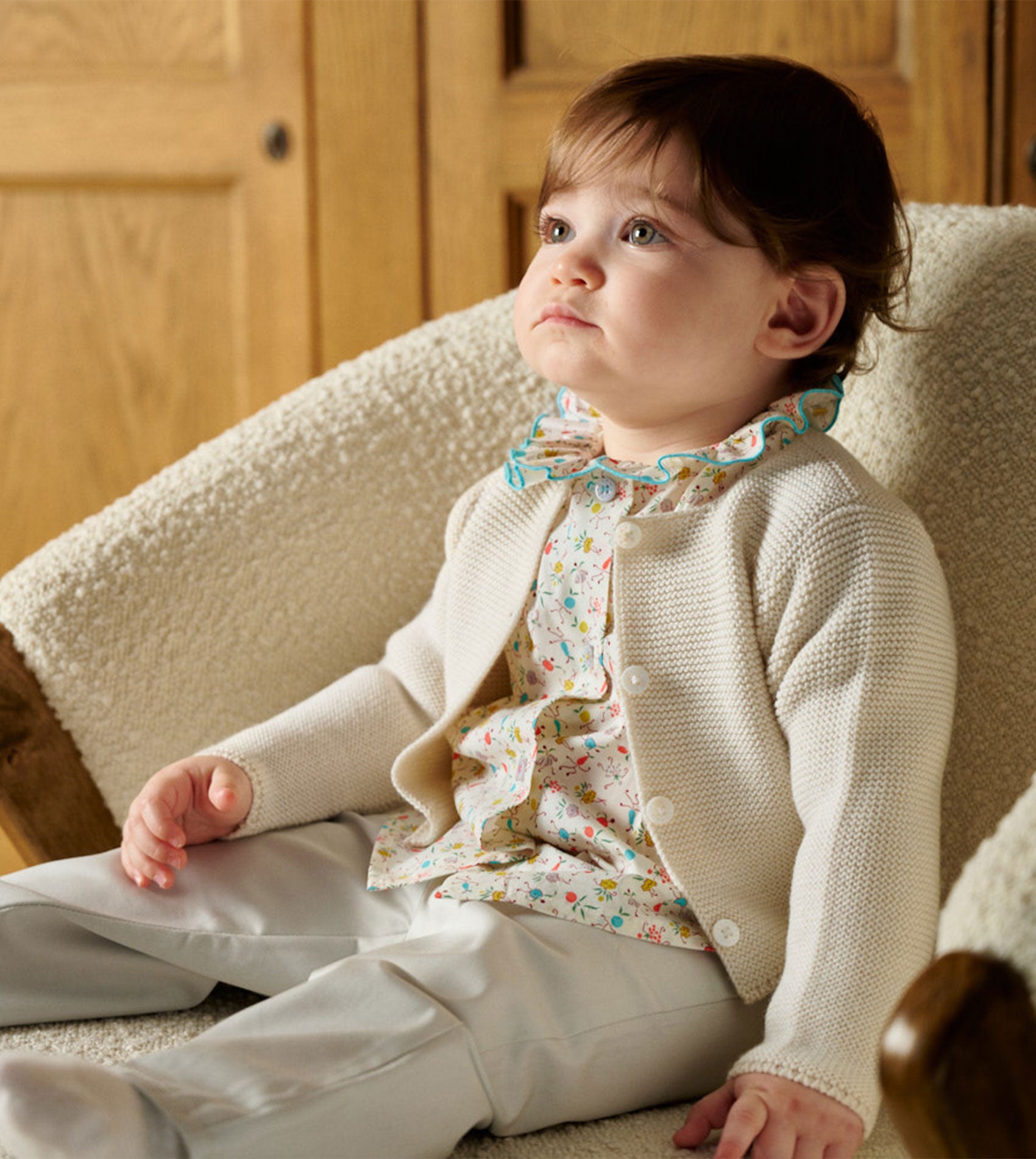 Timeless and elegant, this cropped baby girl cardigan is crafted from 100% Peruvian Royal Alpaca—a luxuriously soft, naturally hypoallergenic fibre that’s perfect for delicate skin. Its clean, minimalist design is beautifully simple, making it a versatile piece for both everyday wear and special occasions.