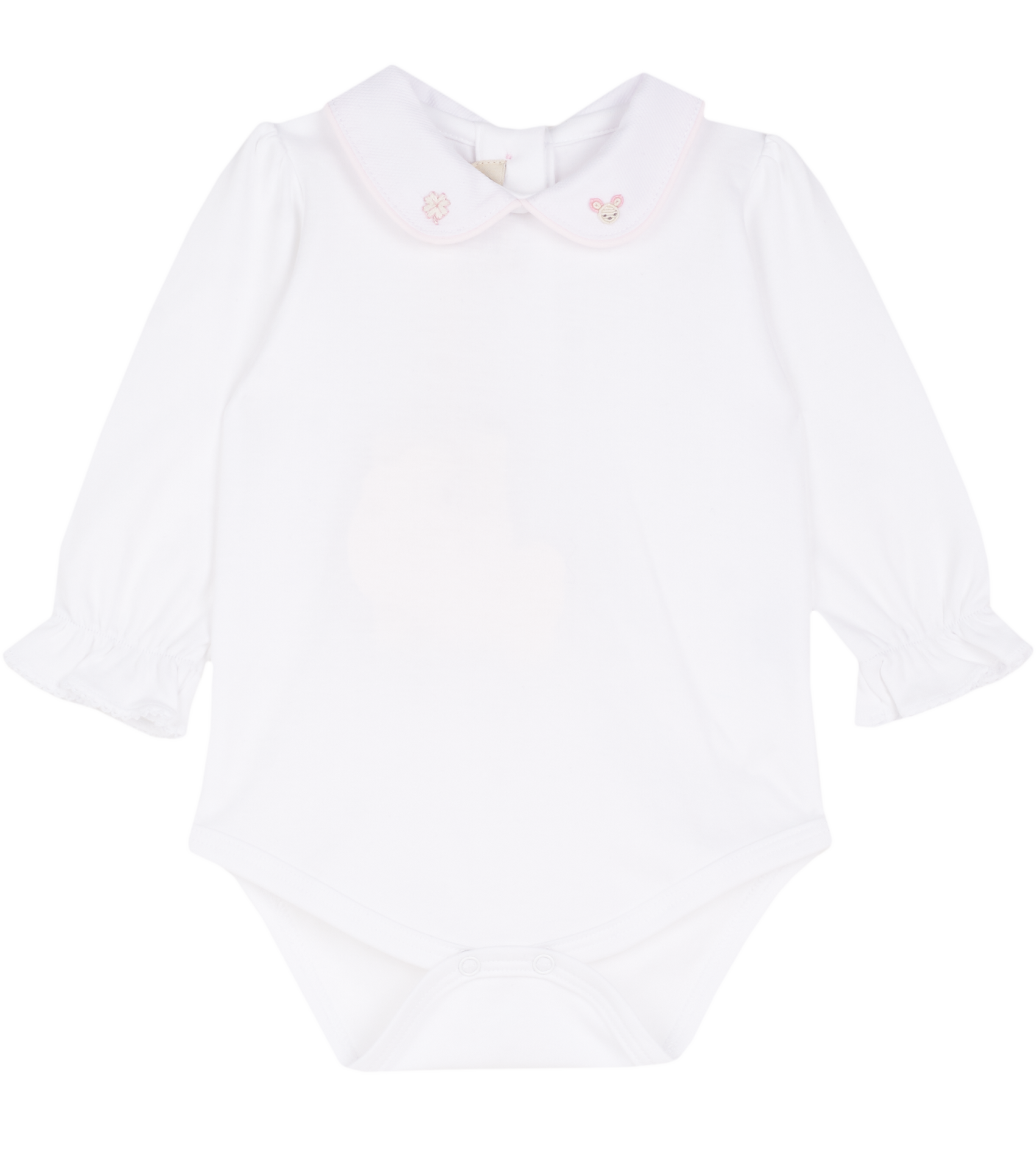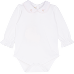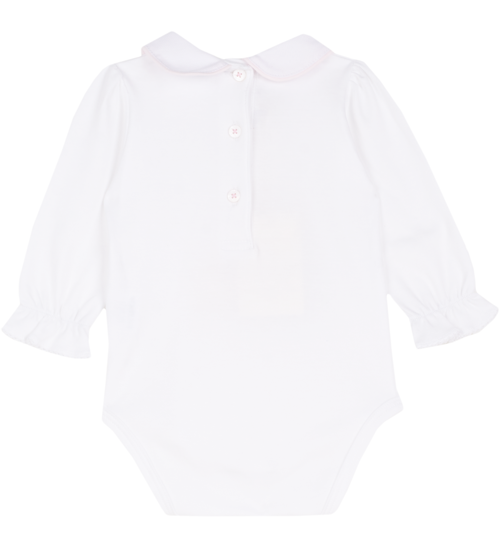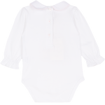 A Baby Girl bodysuit made from luxuriously 100% soft Pima cotton featuring a contrasting classic collar with trim detail and irresistible hand embroidery. Popper, button fastening, long sleeves, and piping detail.