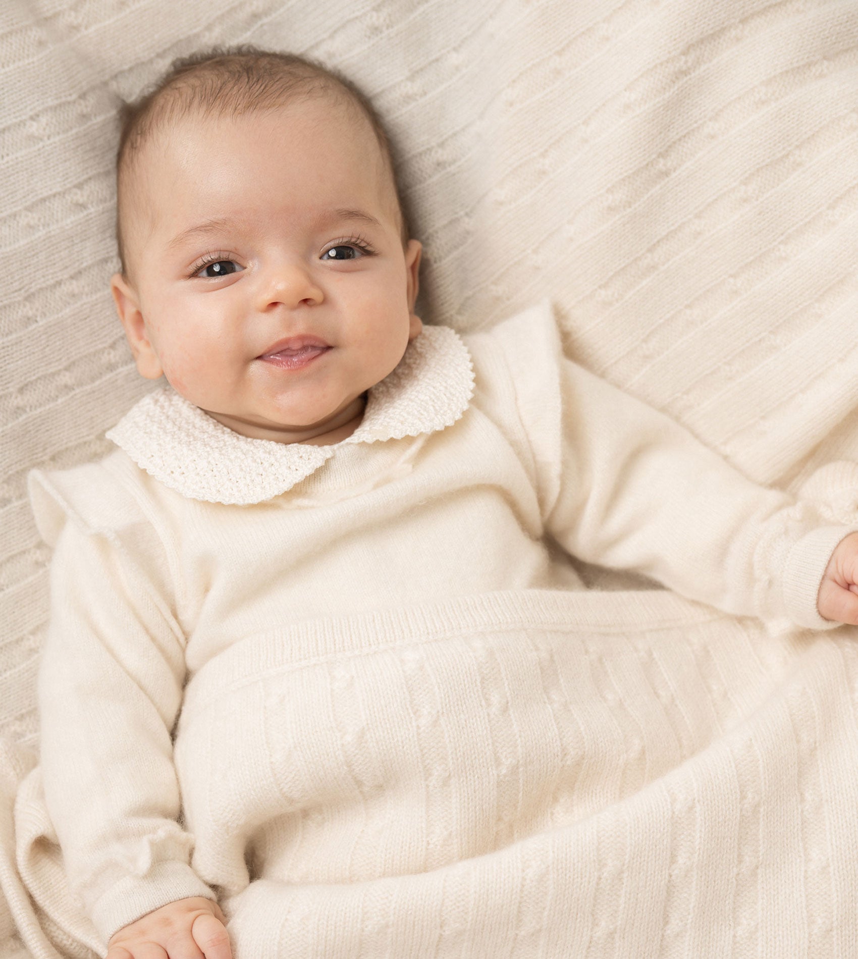 A beautiful long-sleeve cotton baby girl bodysuit, featuring a delicate crochet-detail collar and cuffs. Crafted from 100% soft Pima cotton, it includes convenient button fastenings. Perfect for layering under our Baby Girl Isabella Cashmere Romper with Frill, and easily paired with our Peyton Blanket for extra warmth and comfort.