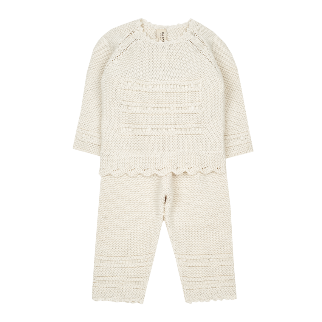 Paired with cosy elasticated-waist trousers for a secure and comfortable fit, the set is ideal for both everyday wear and special occasions. Subtle embroidery on the trouser legs adds a charming finish, and Cashmirino’s signature buttons complete the look with elegance and refinement.