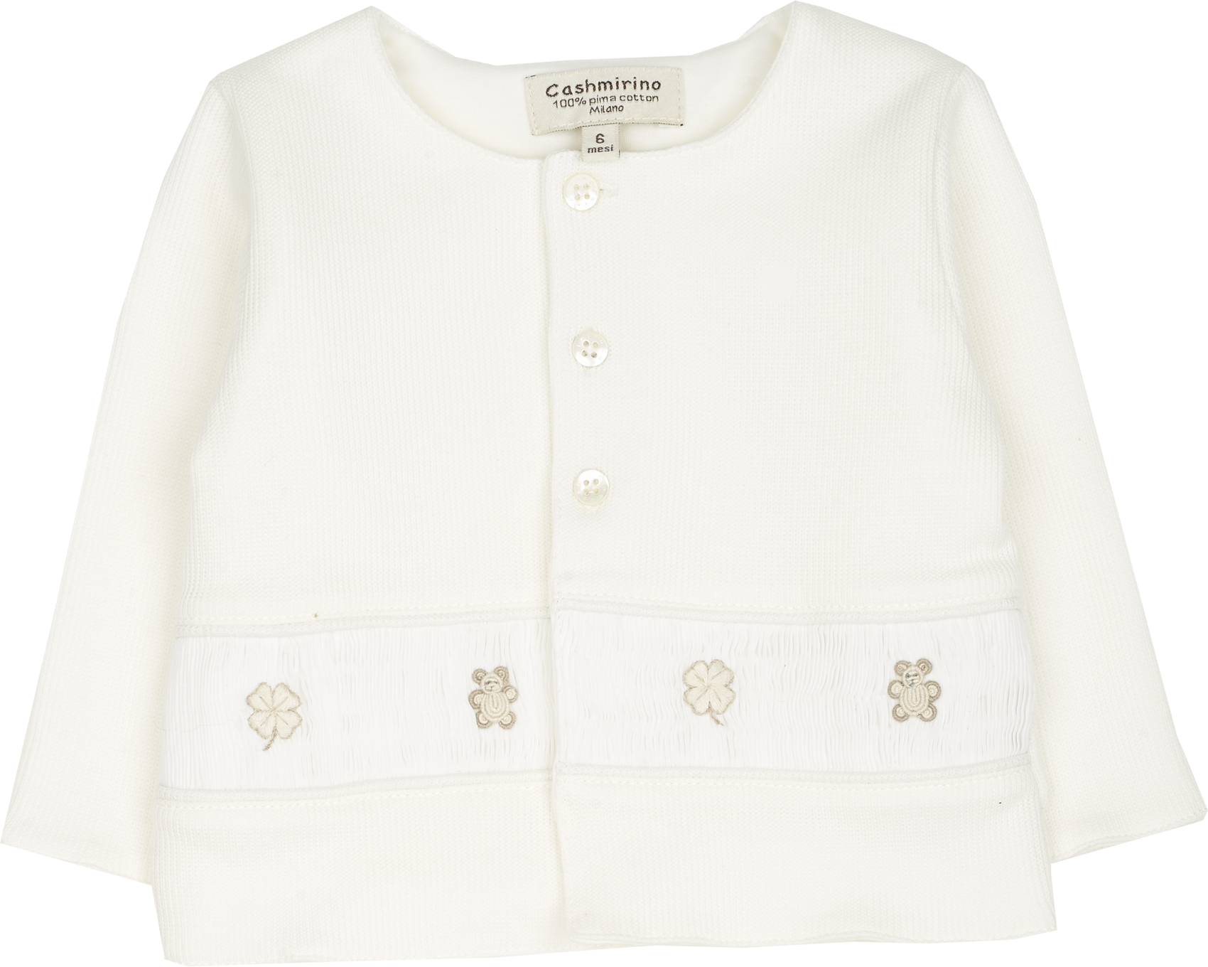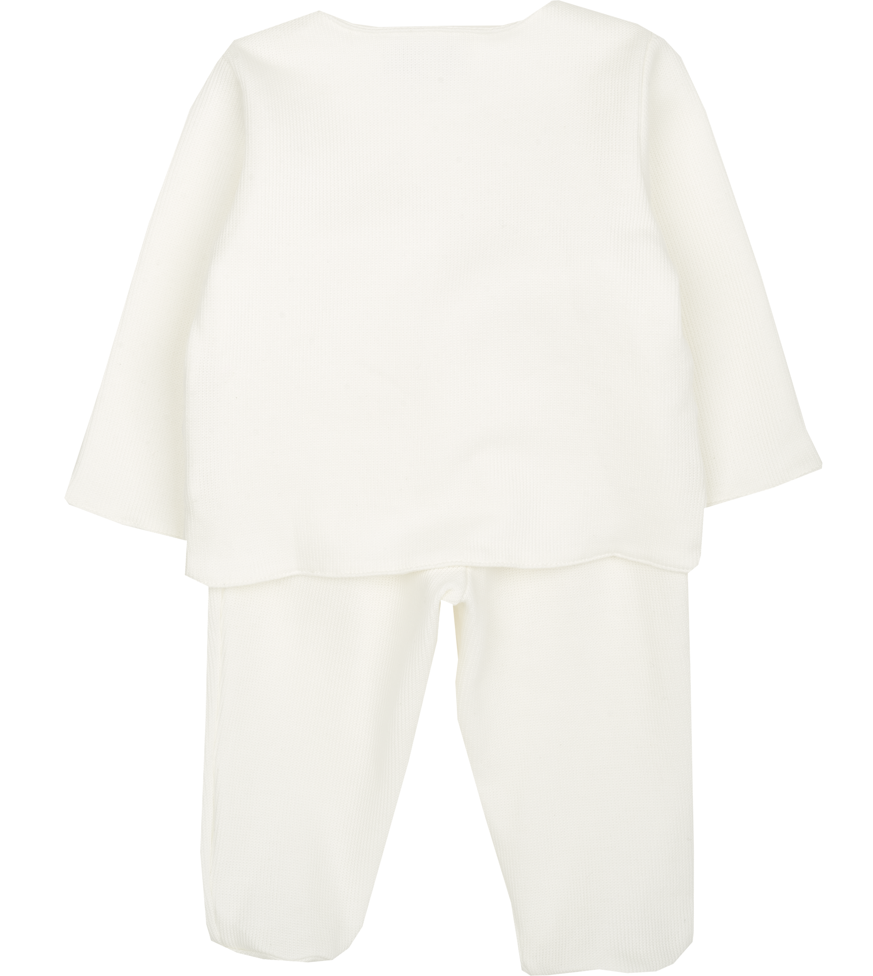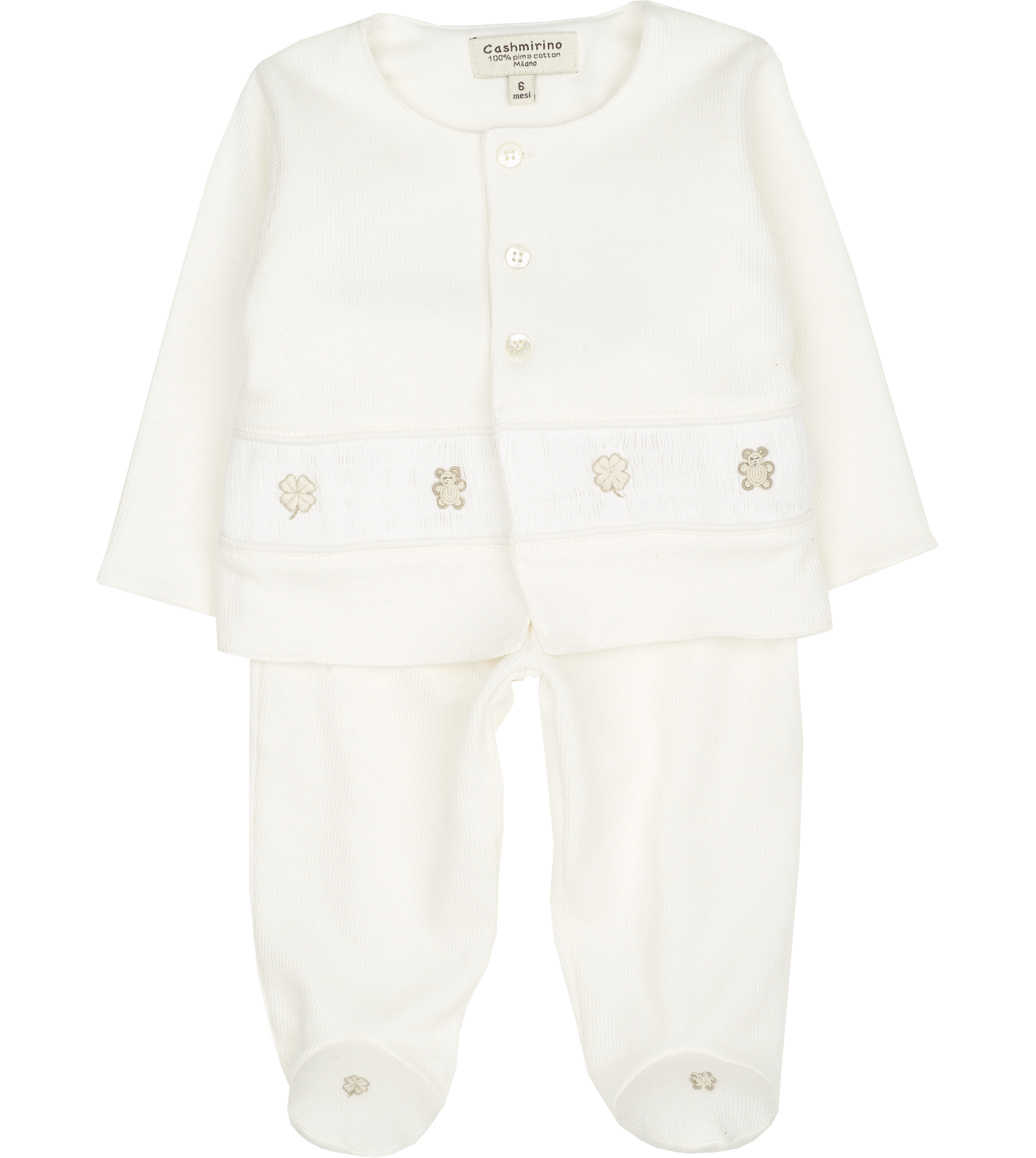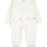 A beautiful two-piece set with bear embroidery. Made from 100% soft and breathable cotton this set is gentle on your little one's skin. Signature Cashmirino bears adorn the front and feet of the set.