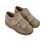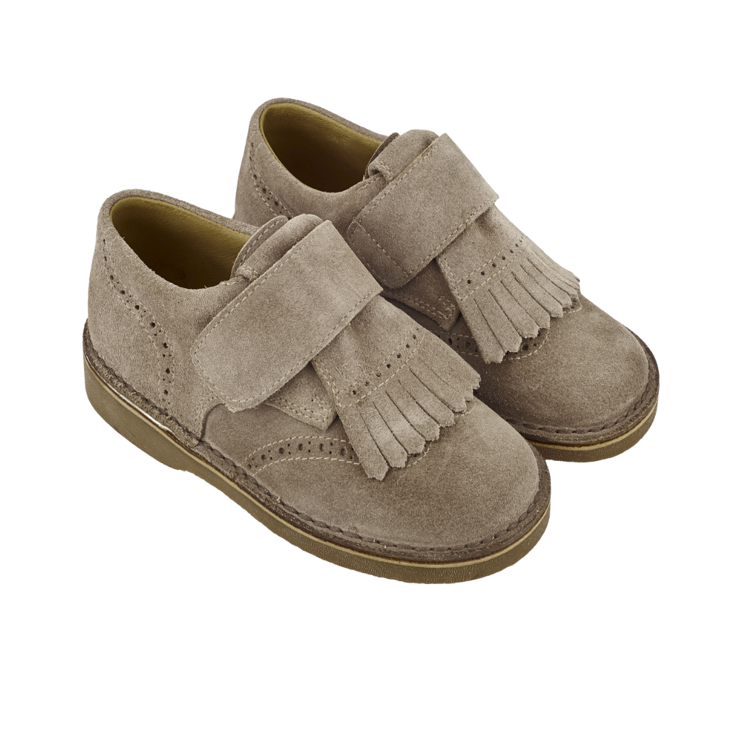 A pair of boy brogue shoes crafted from 100% suede uppers, cushioned leather insoles and rubber outsoles. This stylish design is complete with tassels and cut out detail.