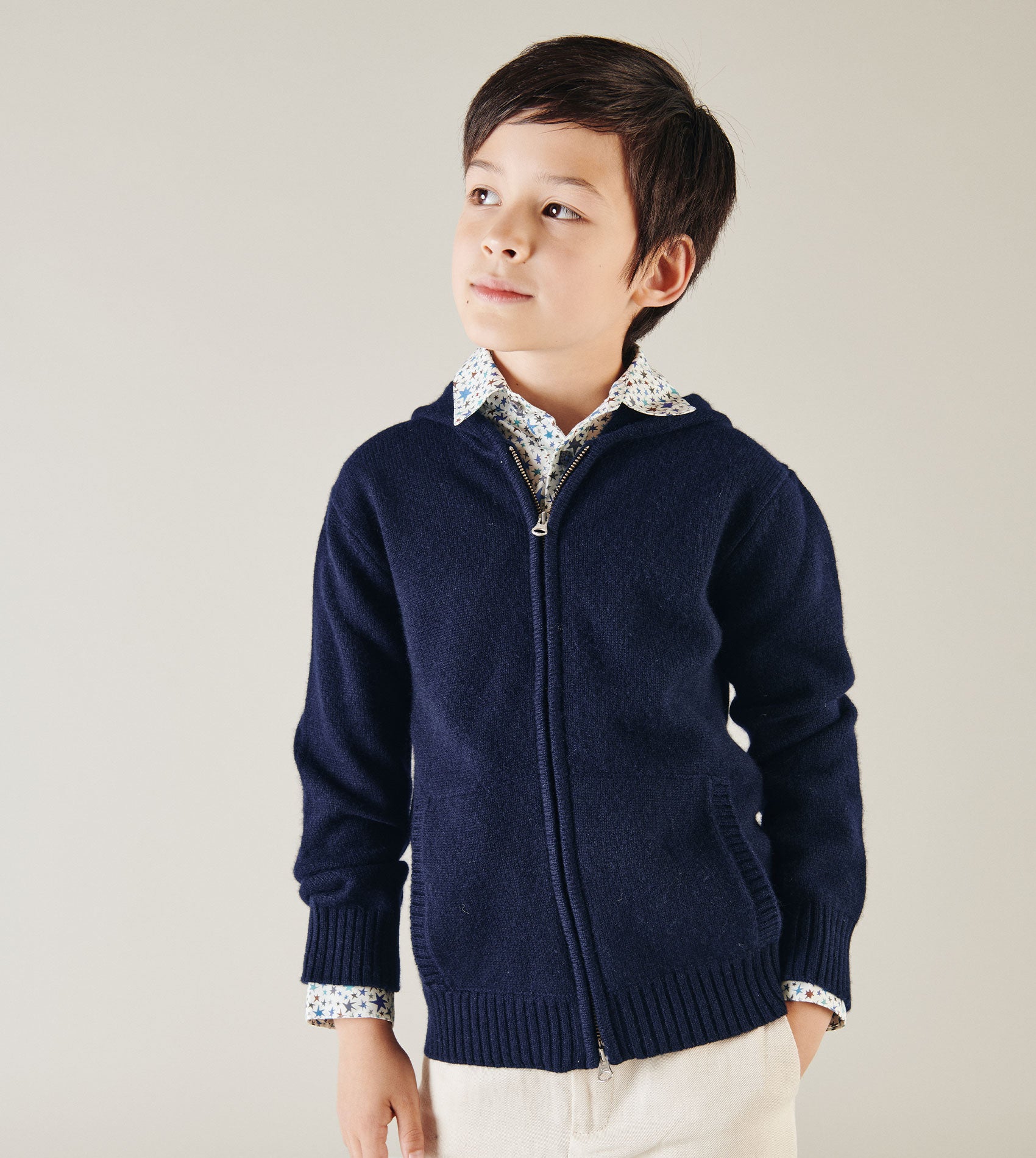 Simple, stylish, and 100% luxuriously soft cashmere, this cardigan hoodie is perfect for keeping little ones cosy on crisp winter days. Zip up and fasten the toggle for extra warmth, while practical pockets and contrasting elbow patches add both charm and function. A cosy classic that’s as clever as it is comfy.