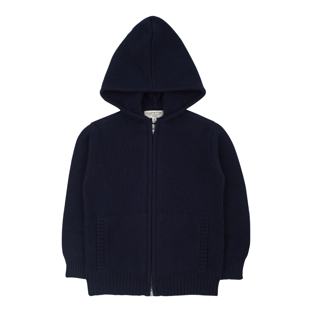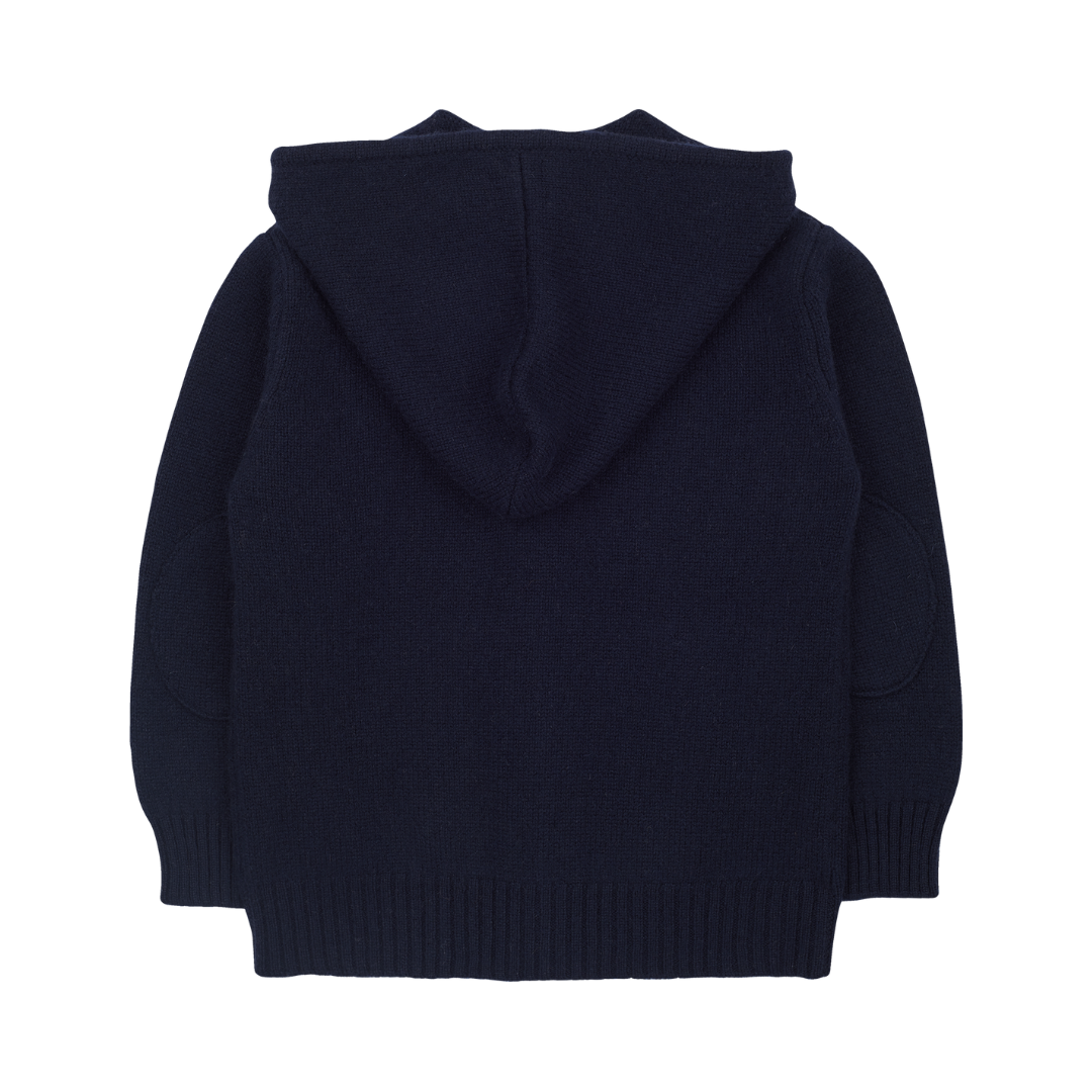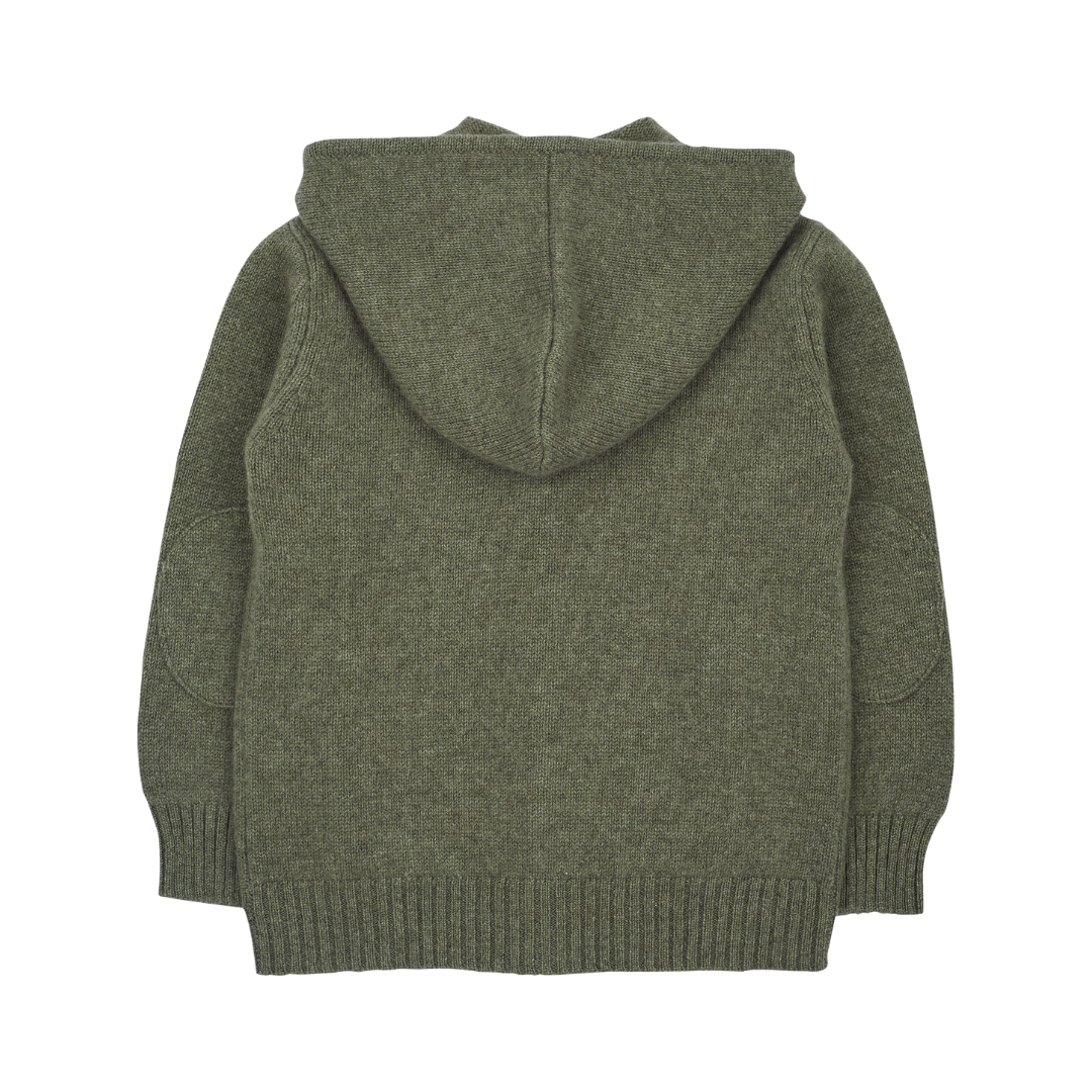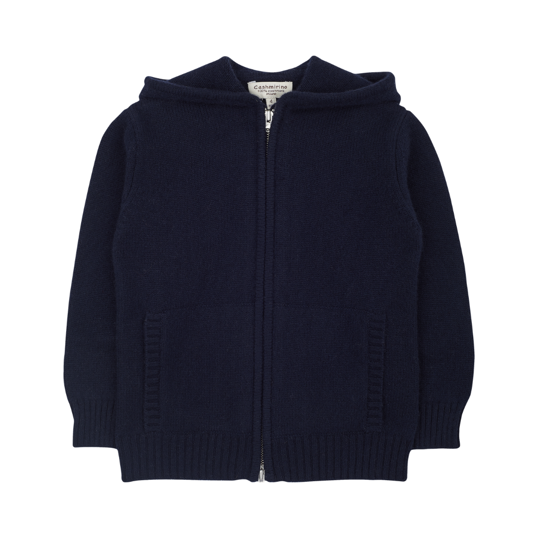 A cashmere boy cardigan hoodie featuring a zip front fastening, two large front pockets, hoodie, long straight sleeves, elbow patches and a ribbed hem.