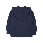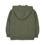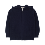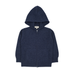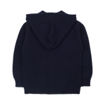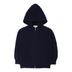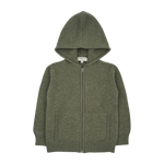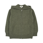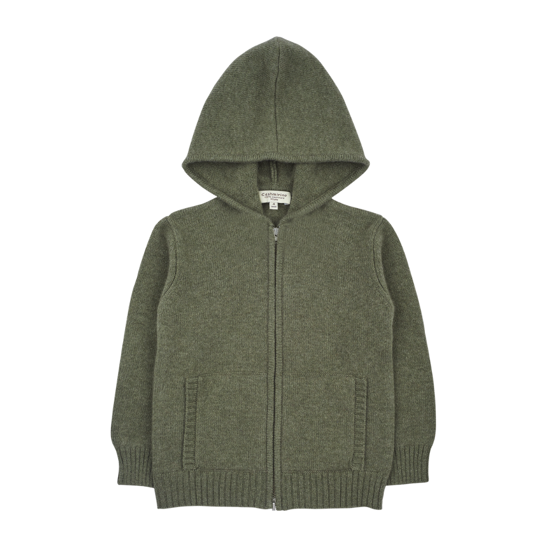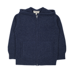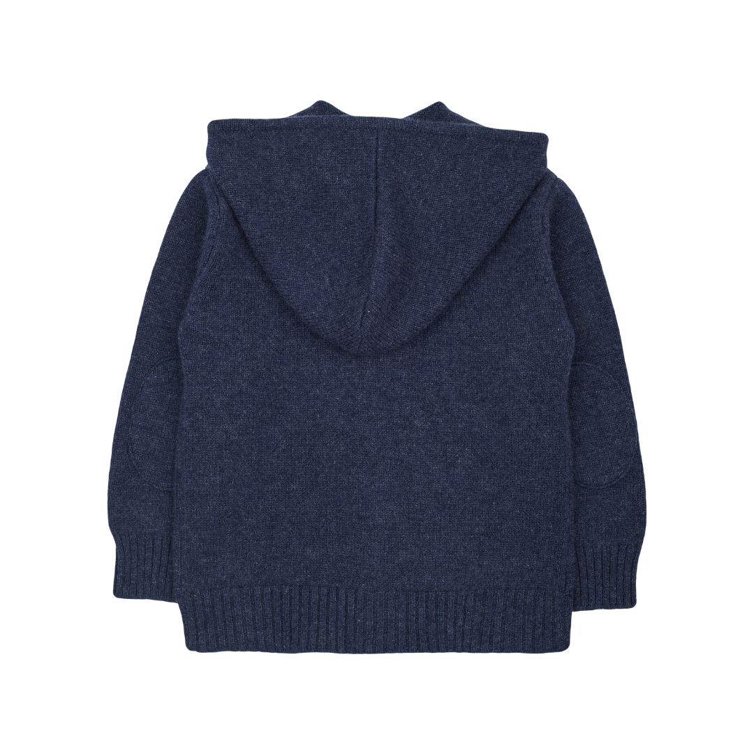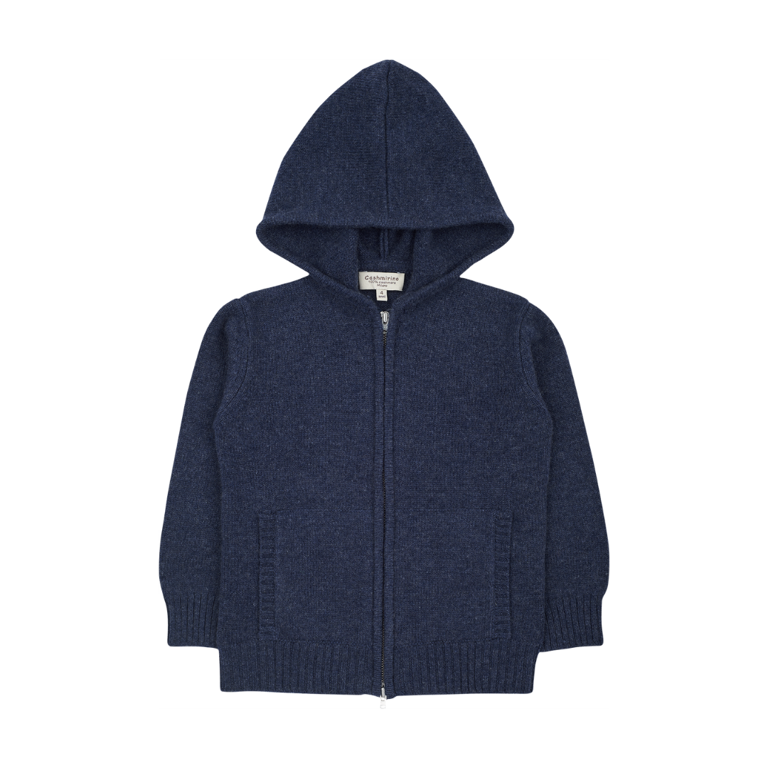 A cashmere boy cardigan hoodie featuring a zip front fastening, two large front pockets, hoodie, long straight sleeves, elbow patches and a ribbed hem.