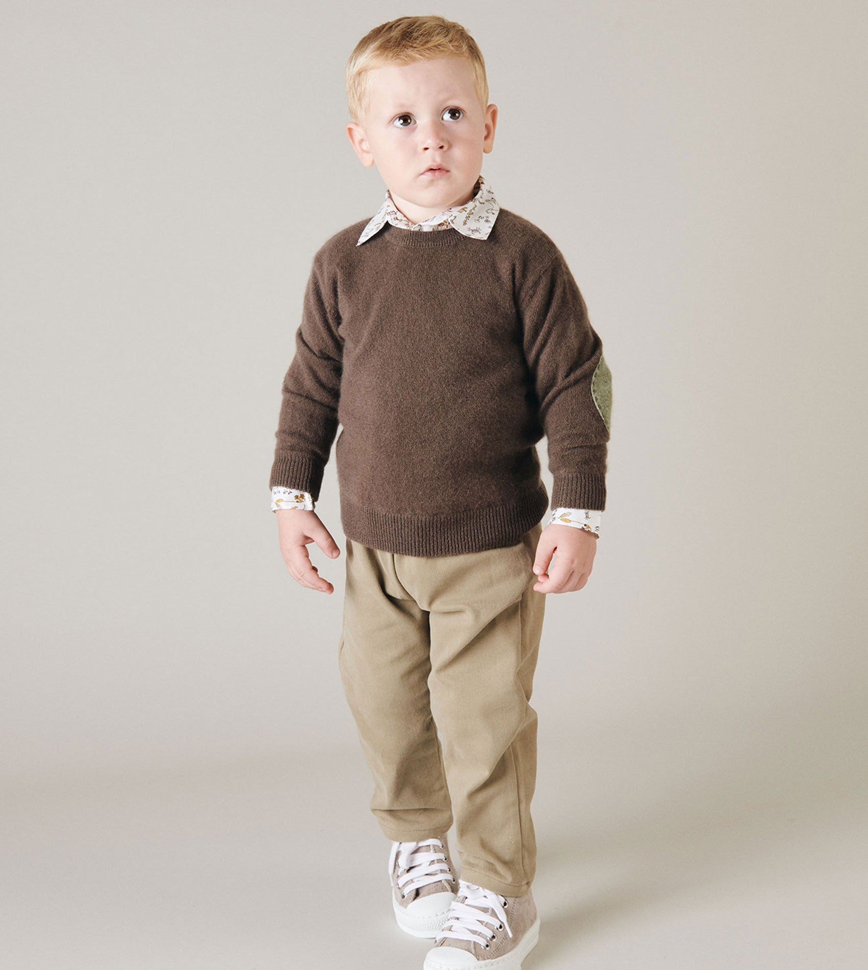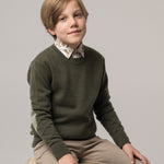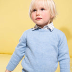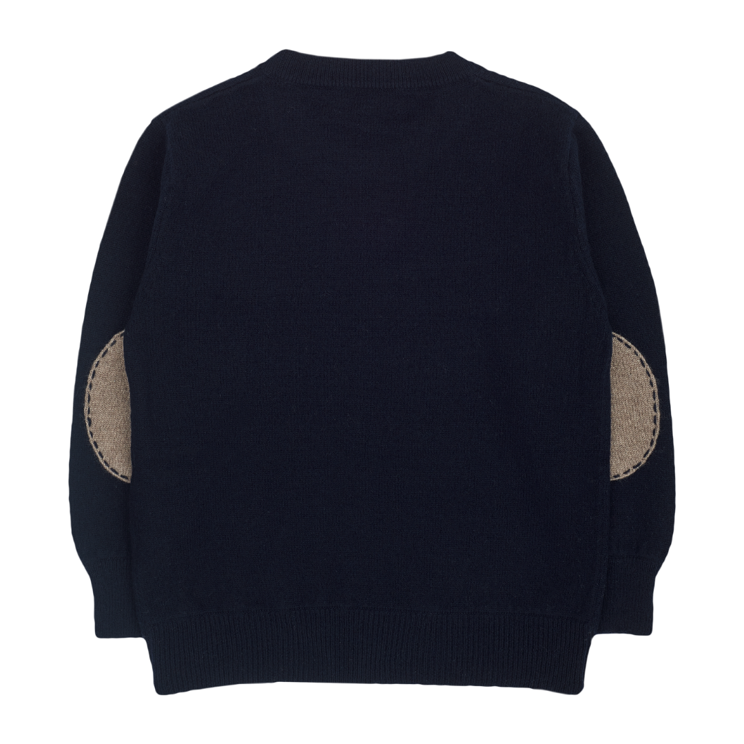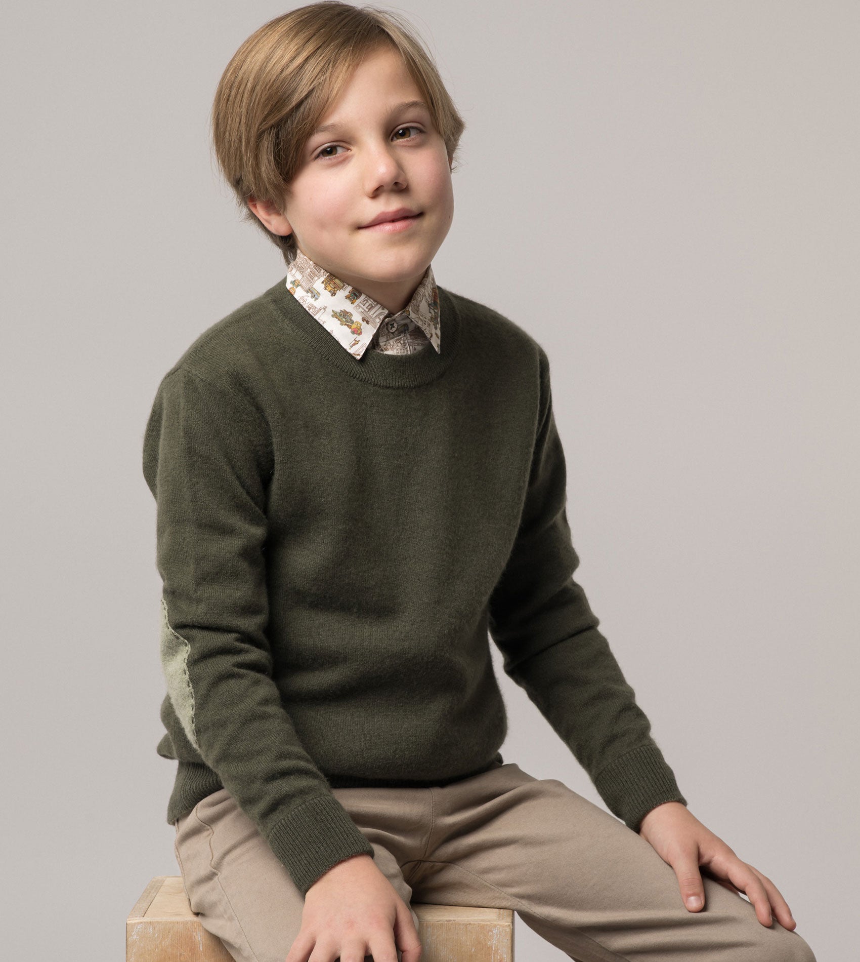 A timeless essential for every young gentleman's wardrobe, this boys' crew neck jumper is expertly crafted from 100% lightweight cashmere — soft, breathable, and gentle on delicate skin. Designed with comfort and style in mind, it features long sleeves, a classic ribbed hem, and subtle contrasting details on the inside and elbow patches for a refined touch.