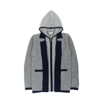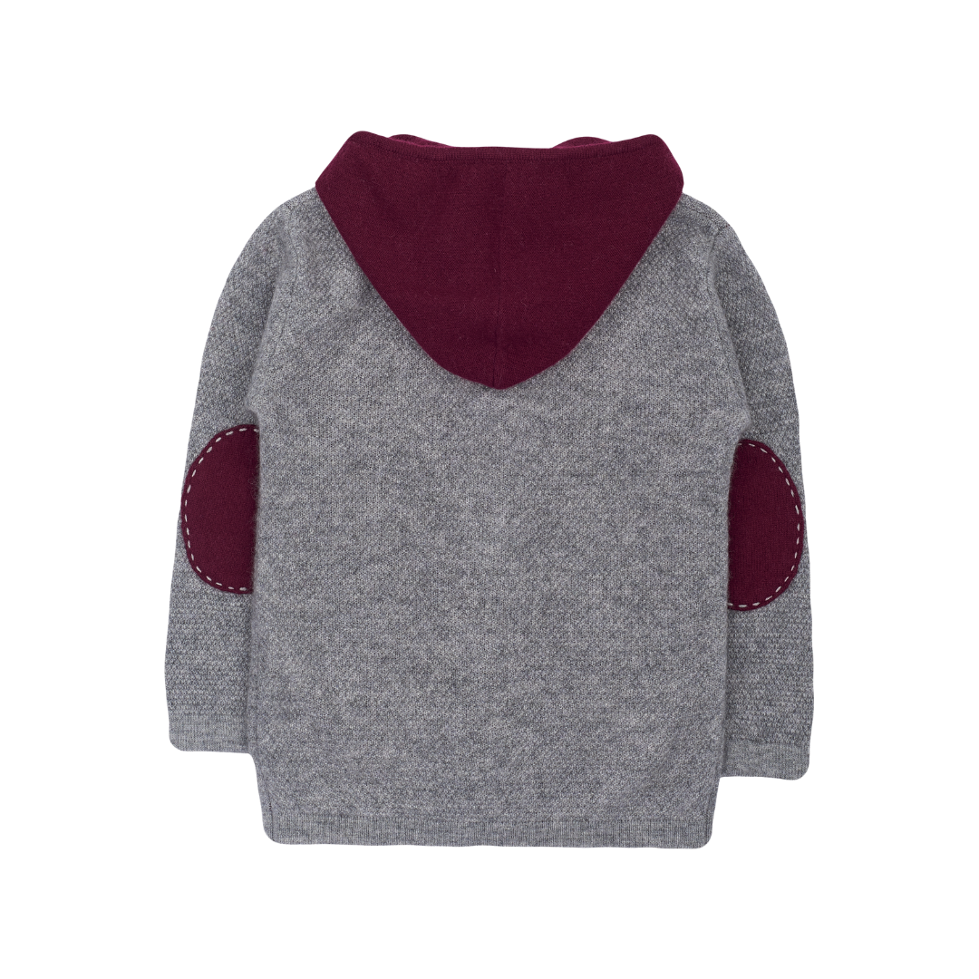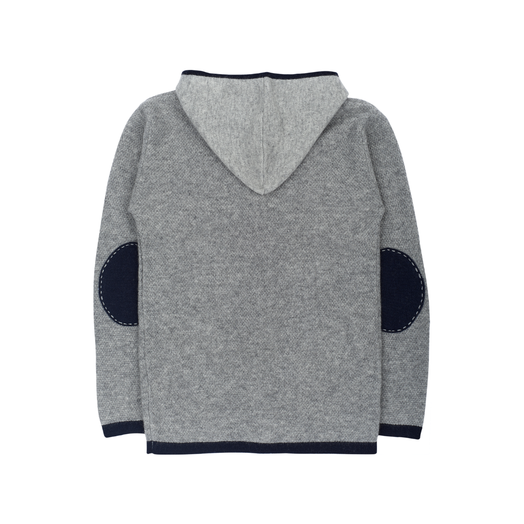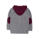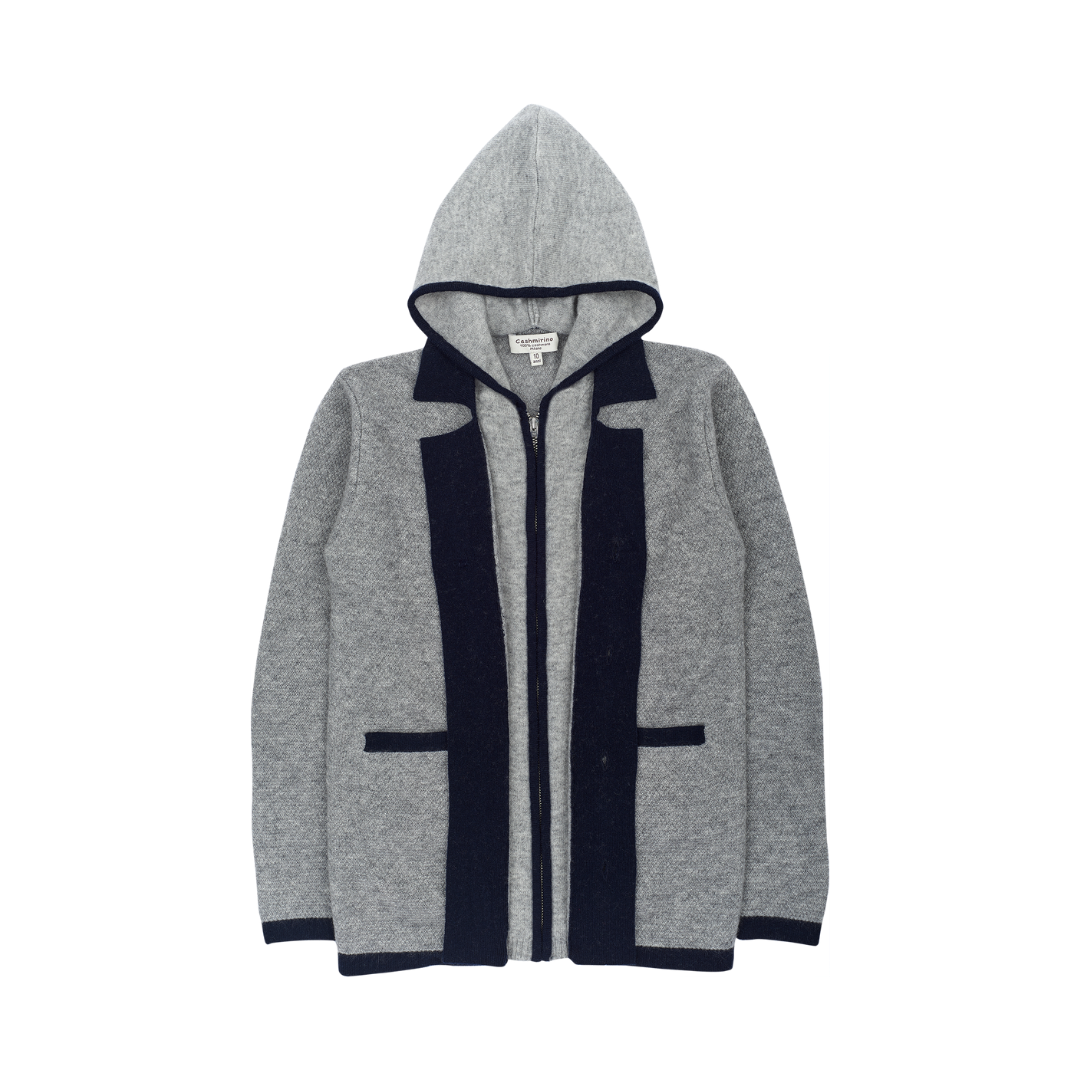 A coat cardigan made from 100% cashmere. A contrasting coloured hoodie is attached underneath which is fastened through a zip. Featuring contrasting coloured lapels, front pockets and elbow patches.