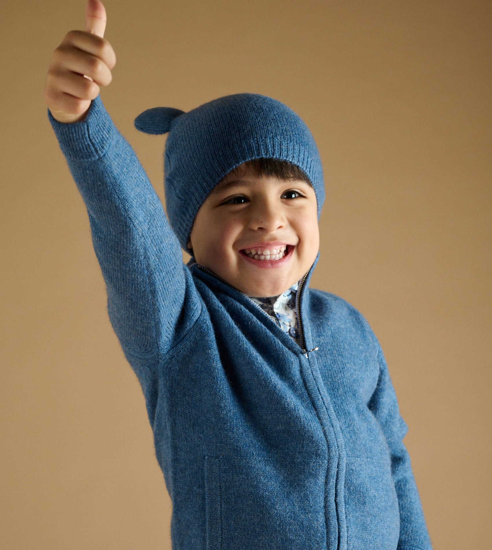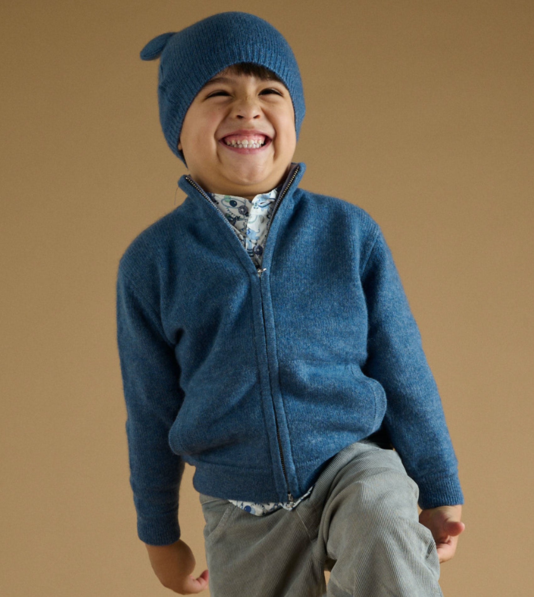 A timeless 100% cashmere high neck boy cardigan fitted with easy to use front pockets, internal contrasts, and comfortable long sleeves. This is also a great piece if you're in need of smart clothes for boys. Ideal for a sporty and preppy look, in warmer months this is a good substitution for a jacket and is also great worn under jackets on very cold days.