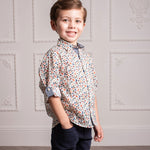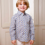 A boy classic collar shirt with geometrical prints featuring internal contrasting detail, long sleeves and Cashmirino signature buttons. Made with Liberty fabrics.