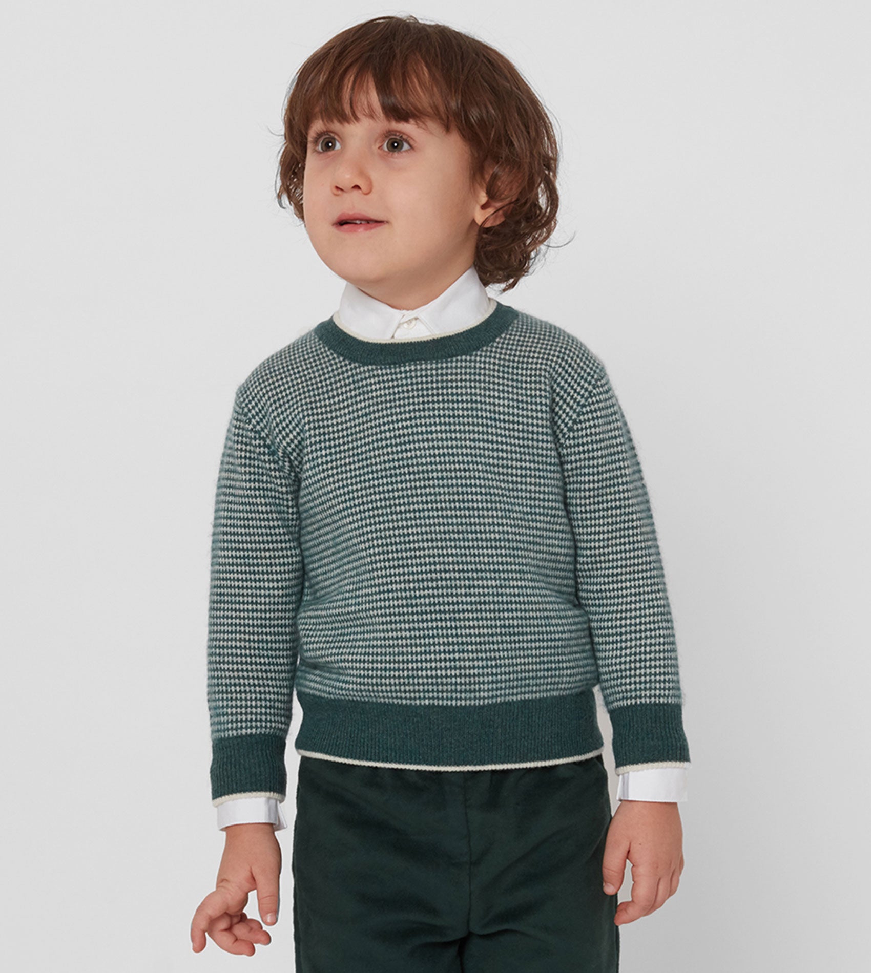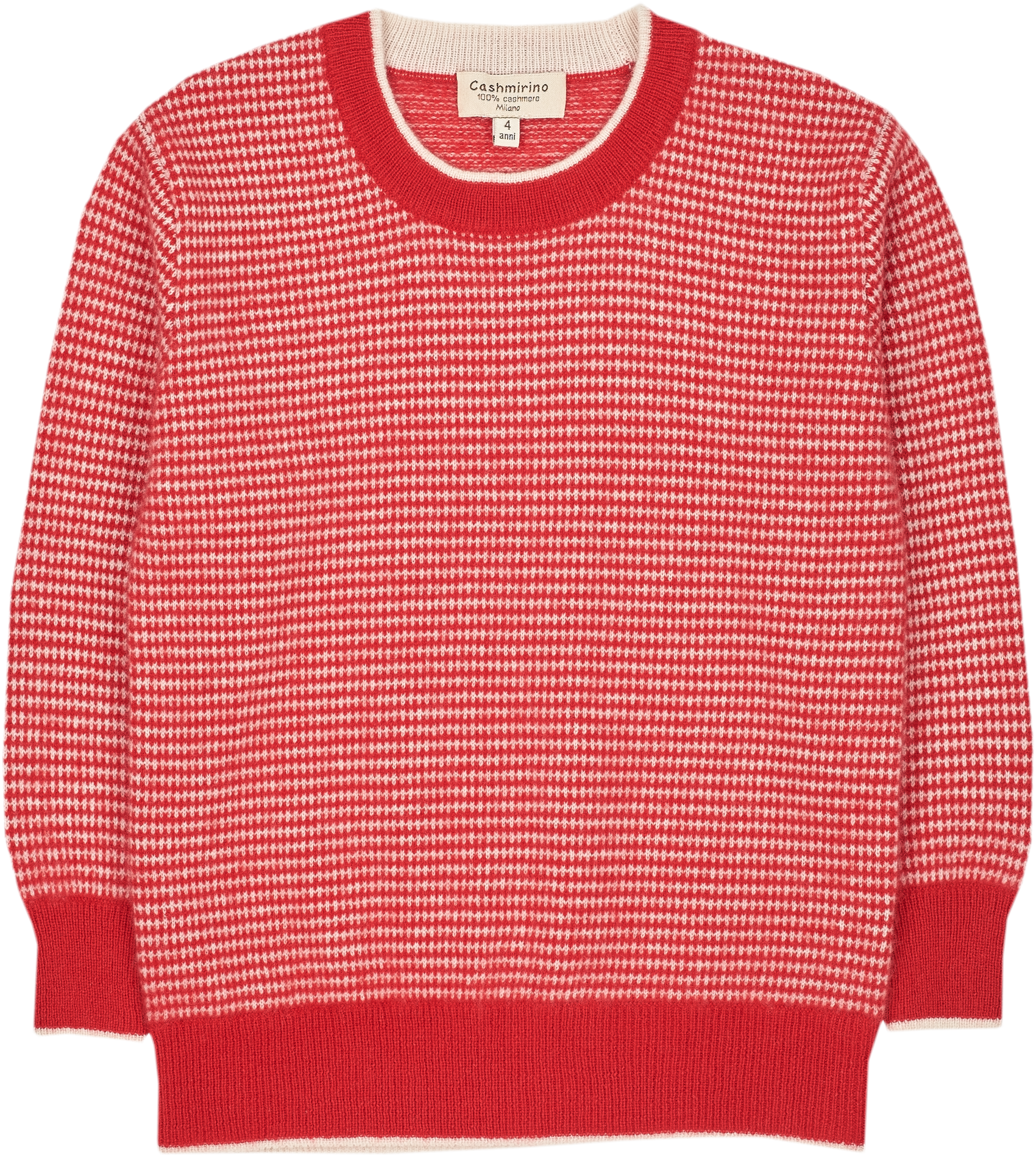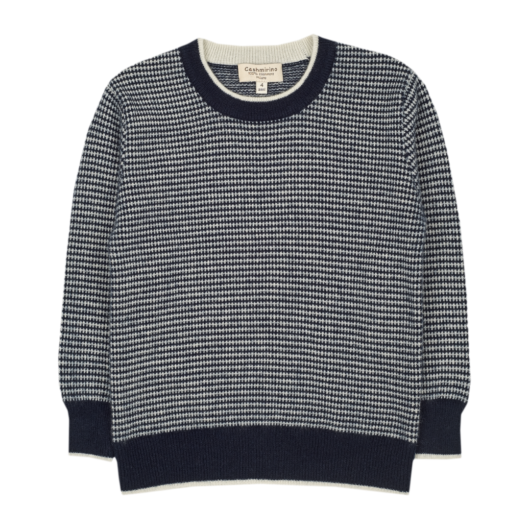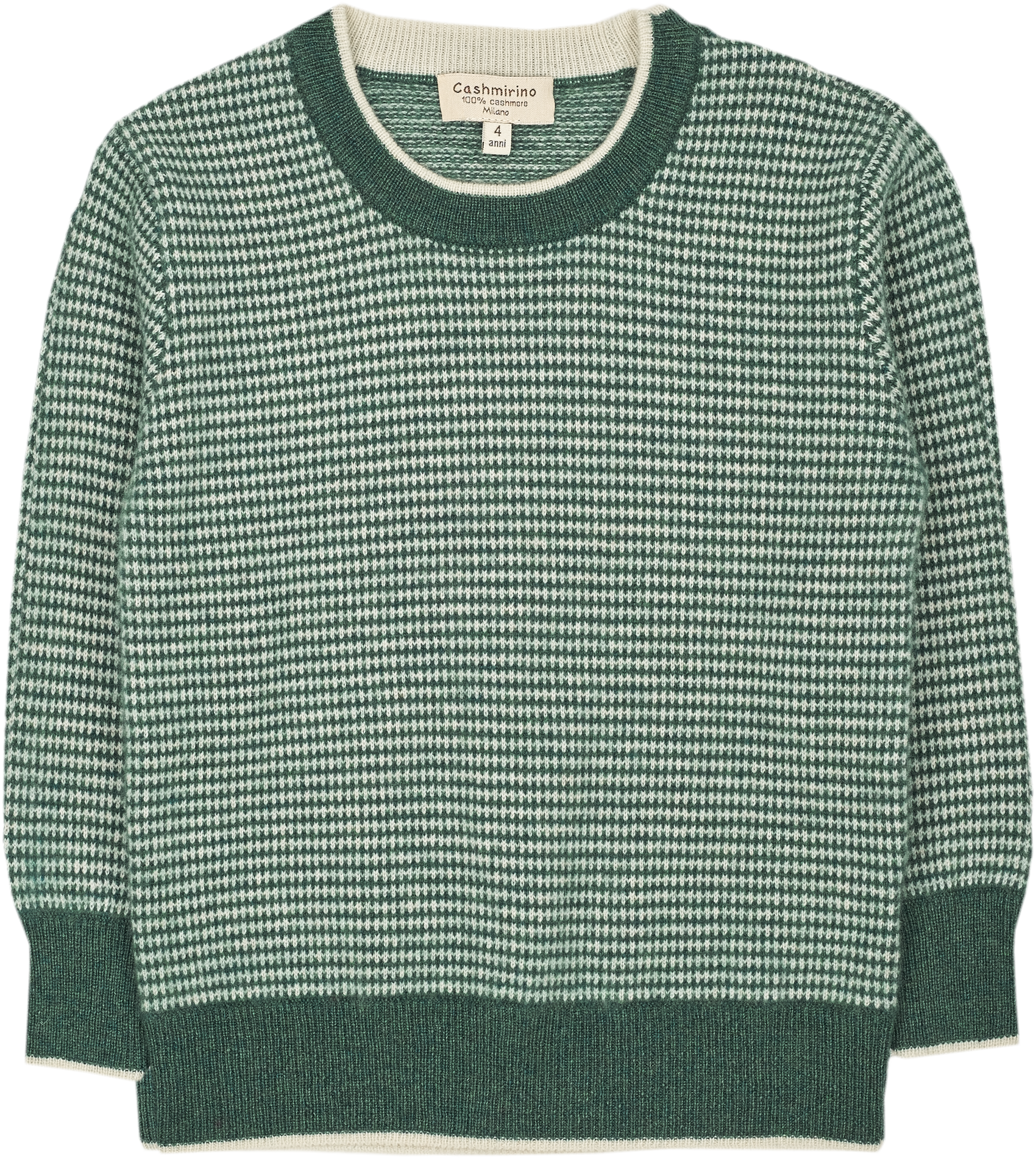 The perfect statement piece for your little one, made of 100% Mongolian Cashmere. This boy jumper features a bold contrasting neckline, sleeves and hemline, along with internal contrasts in a stunning houndstooth pattern. This lightweight jumper can be used in Fall or Spring or as a layer in Winter.