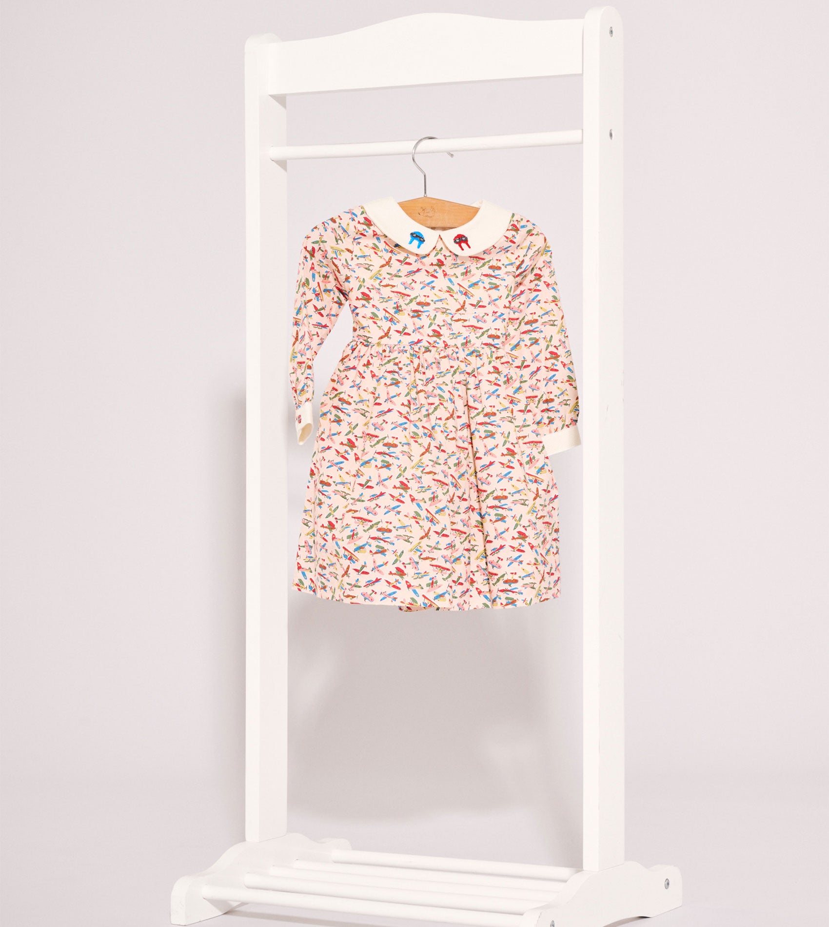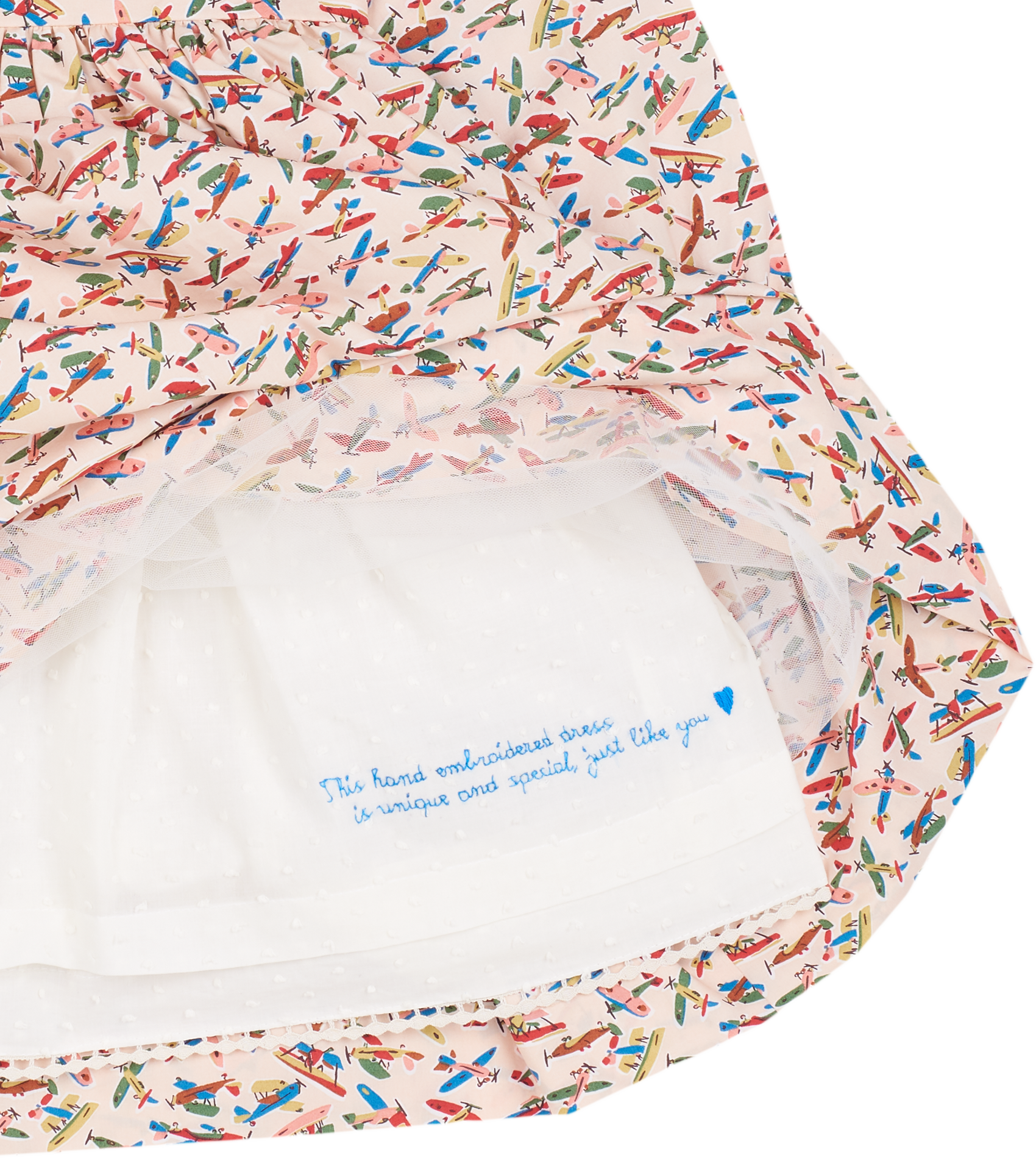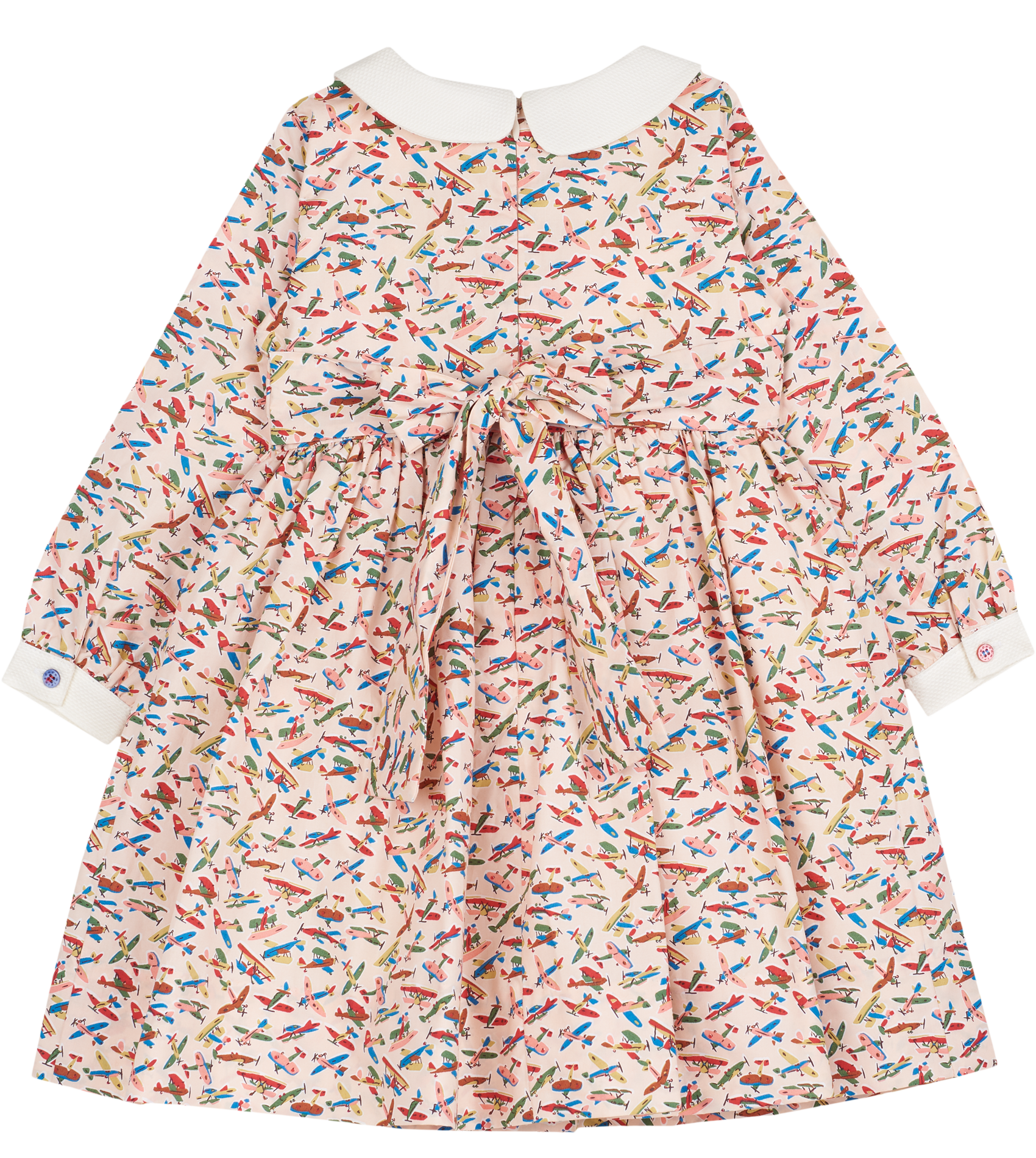 The Ameline Dress blends timeless elegance with playful charm. Made from soft Liberty print cotton, it features a vintage-inspired flying plane pattern that sparks a sense of adventure and nostalgia.