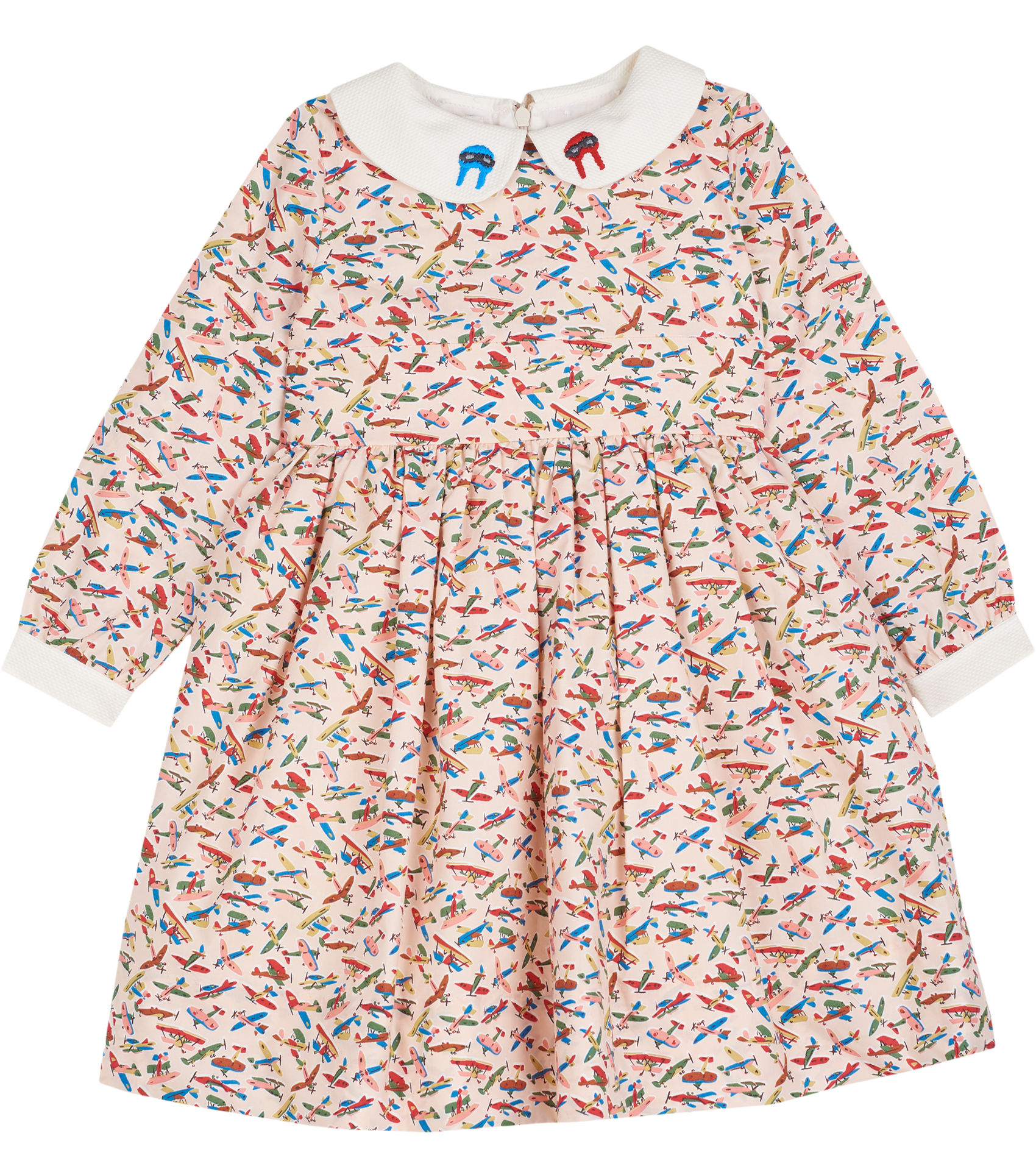 A standout detail is the hand-embroidered Peter Pan collar, delicately stitched with two pilot helmets — a whimsical touch that makes this dress truly unique. Contrasting cotton piqué on the collar and cuffs adds classic refinement, while long sleeves and a knee-length cut make it perfect for cooler days.
