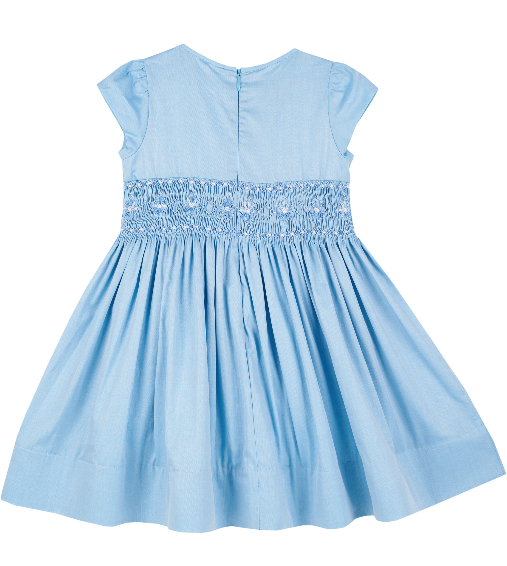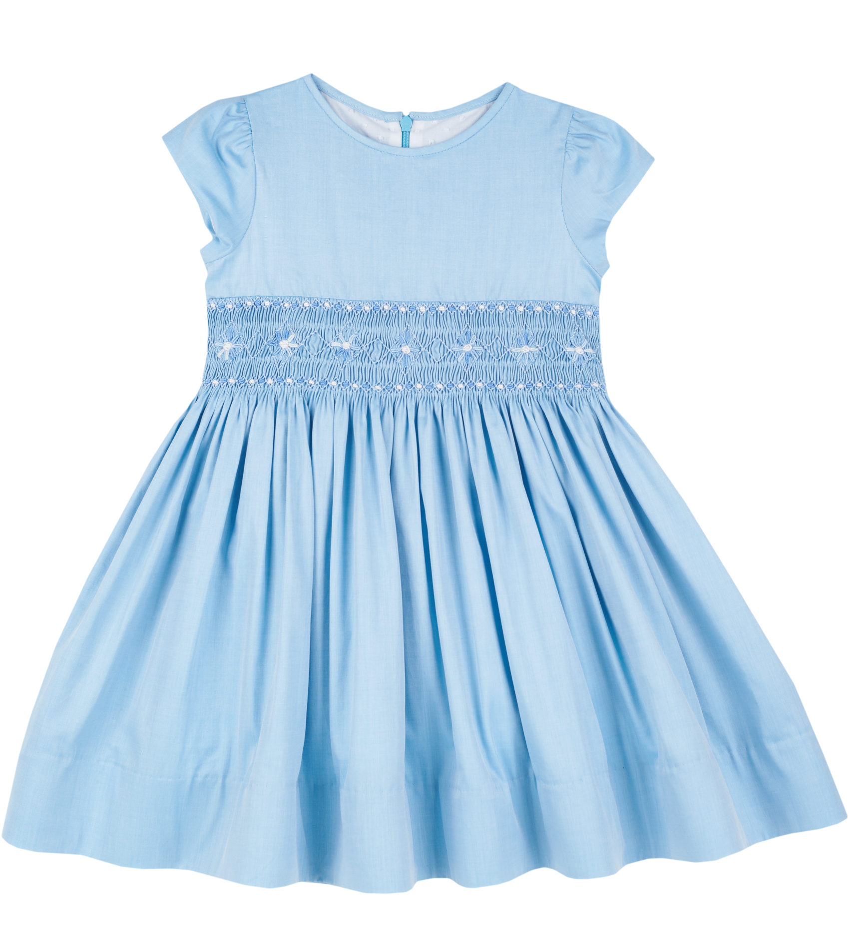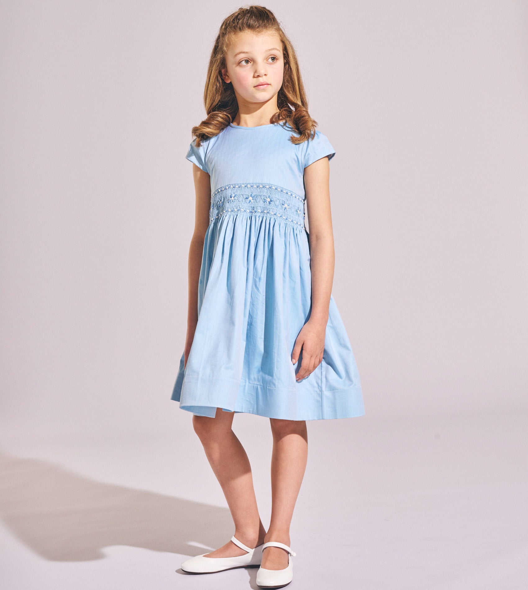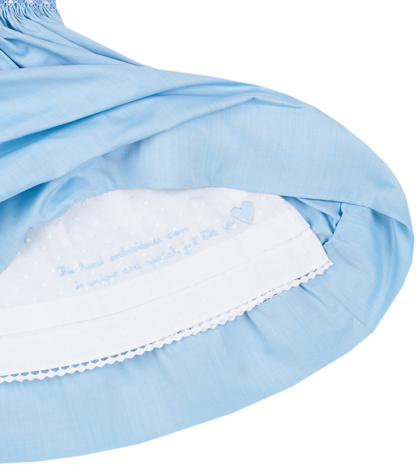 The Azurine Dress is a timeless celebration of childhood charm, beautifully crafted from soft, breathable 100% cotton. In a delicate shade of azure blue, it features hand-smocking and intricate hand embroidery across the bodice — subtle details that reflect true craftsmanship and quiet elegance.