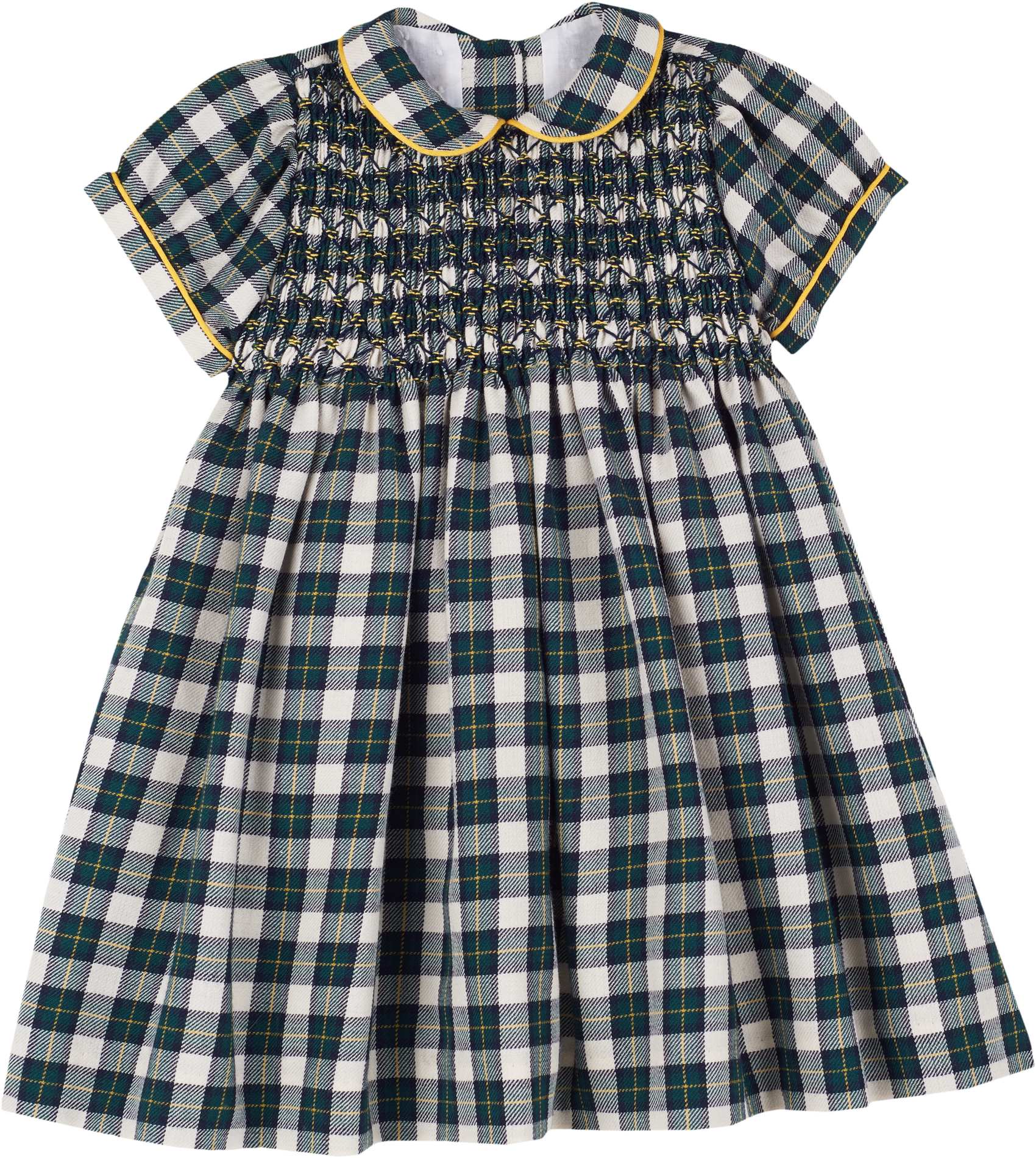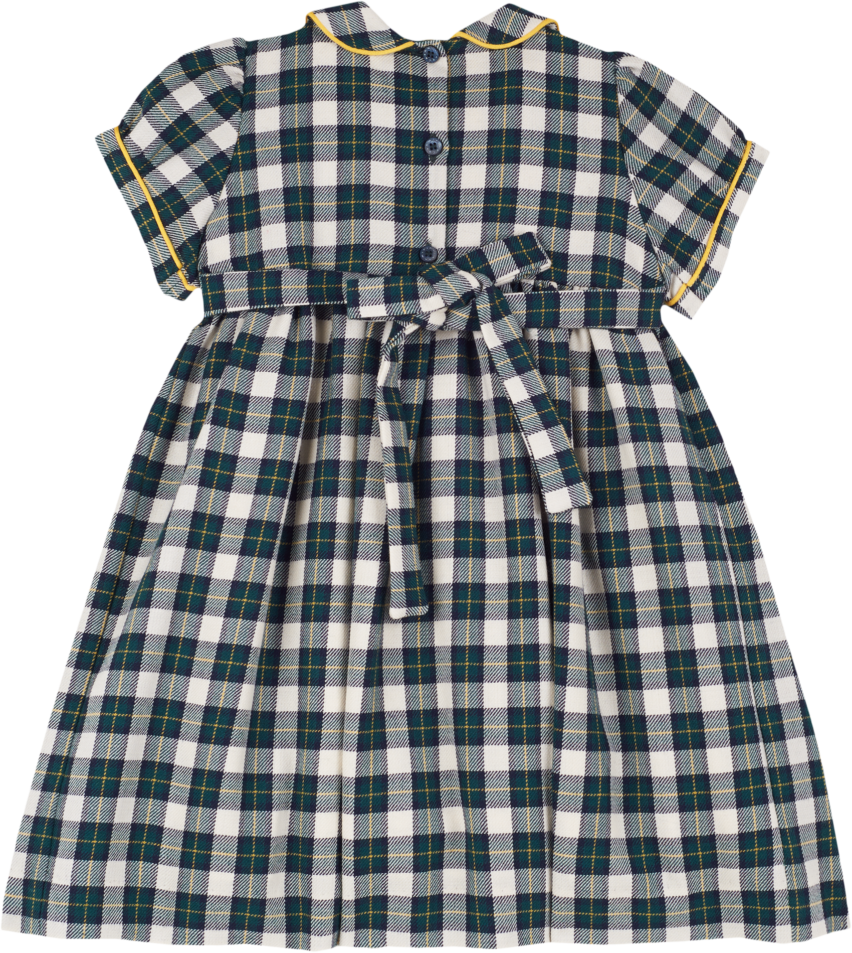 - Bold yellow piping along the edges highlights the dress’s structure and adds a playful yet sophisticated contrast to the tartan.