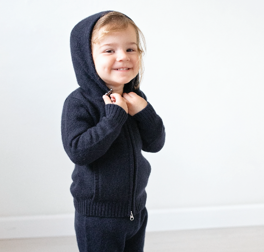 This girl’s cardigan hoodie blends everyday practicality with timeless elegance—making it a go-to for semi-formal dressing or relaxed winter layering. Knitted from 100% cashmere, it’s wonderfully soft and warm, with thoughtful details like elbow patches, handy pockets, and a zip-up hood for extra protection on blustery days.