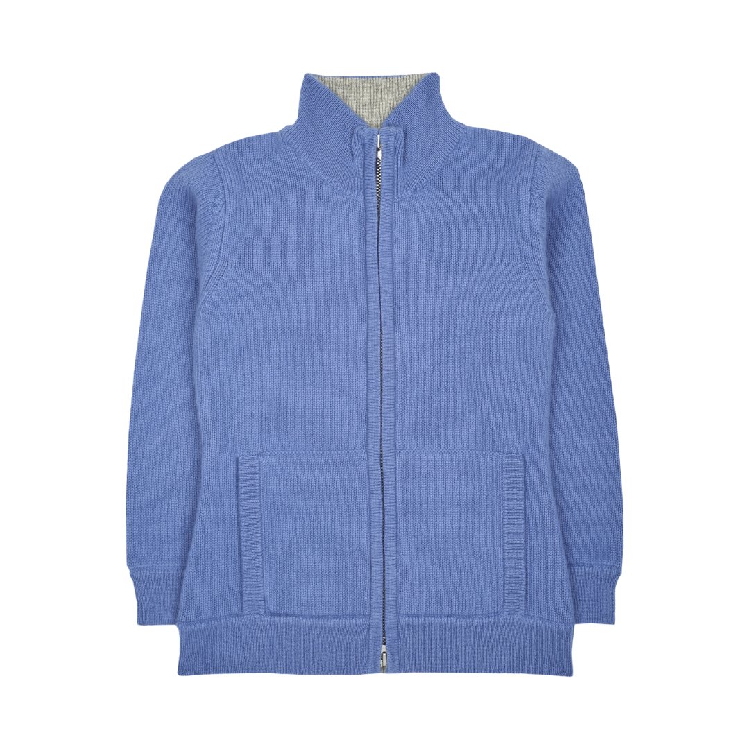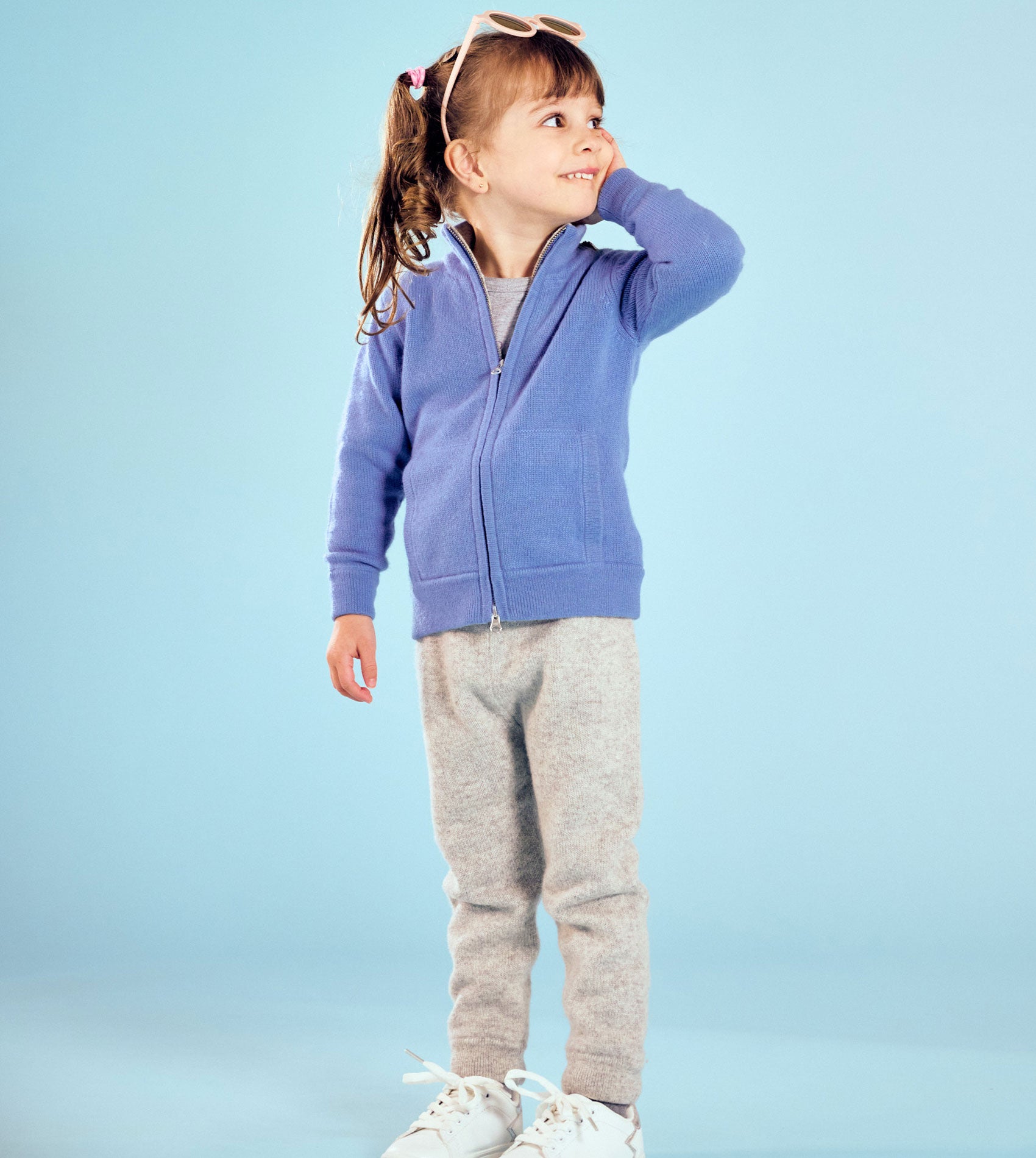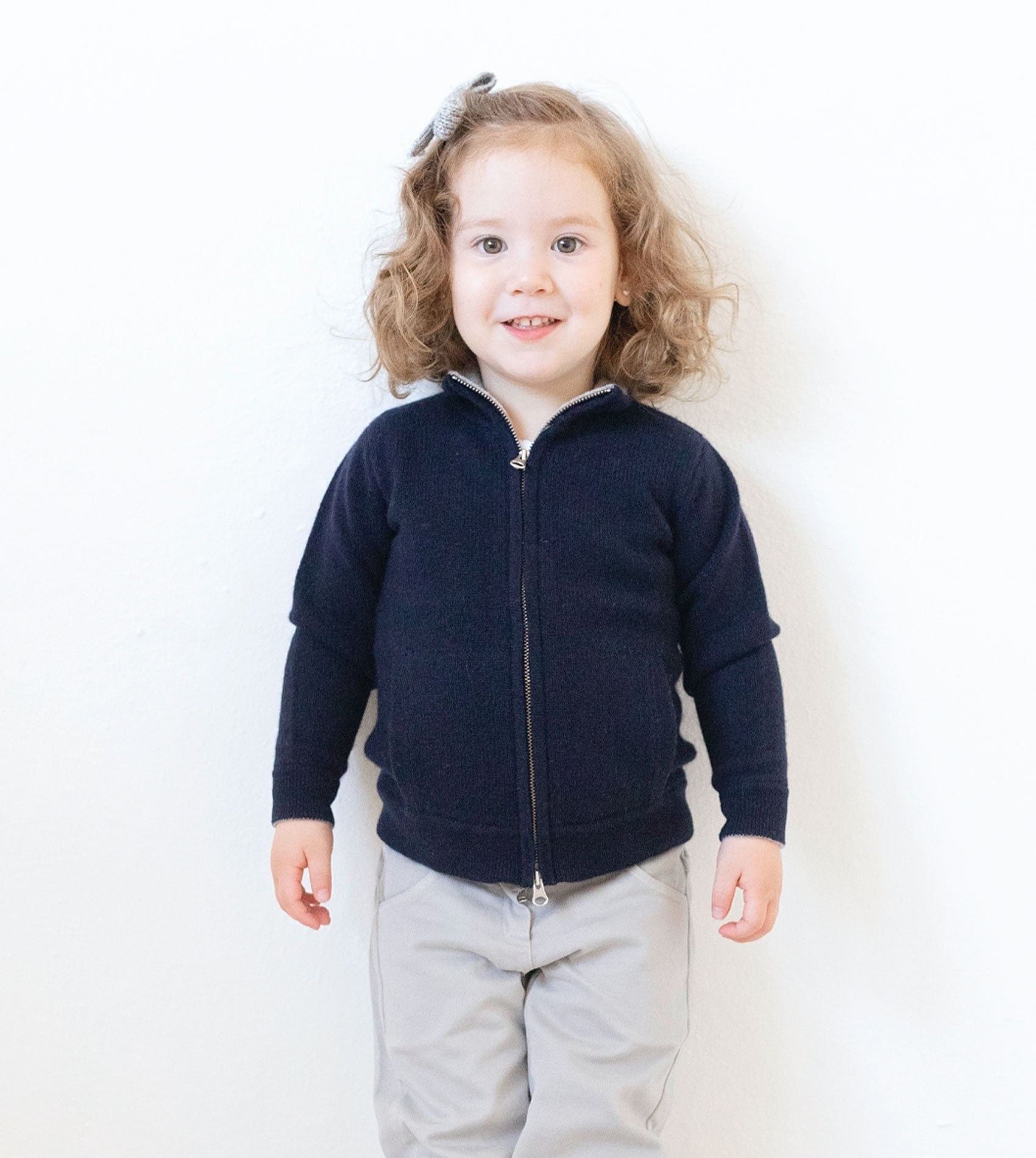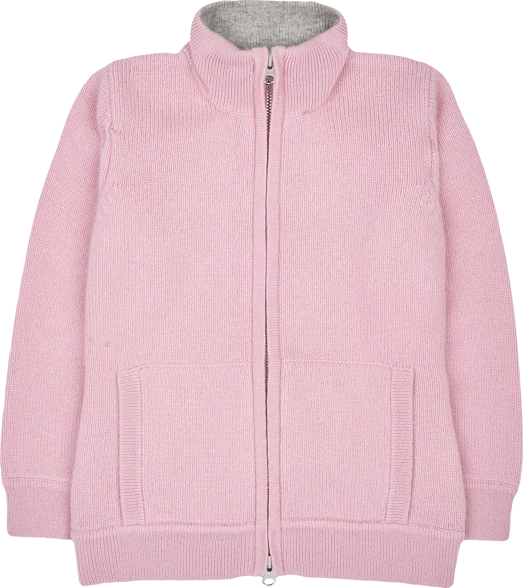 A stylish high neck girl cardigan with front pockets perfect for little explorers looking to collect shells and other natural treasures as well as stylish internal contrast and warm long sleeves. Made from 100% cashmere. Available in a range of sizes.