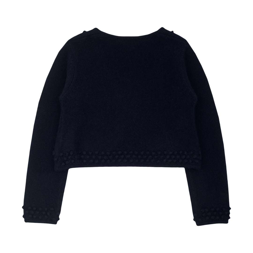 A shrug made from 100% cashmere featuring cute bobble embroidery. Long straight sleeves, an open front, one button fastening and thick hem complete this design. Wear over a party dress or blouse.